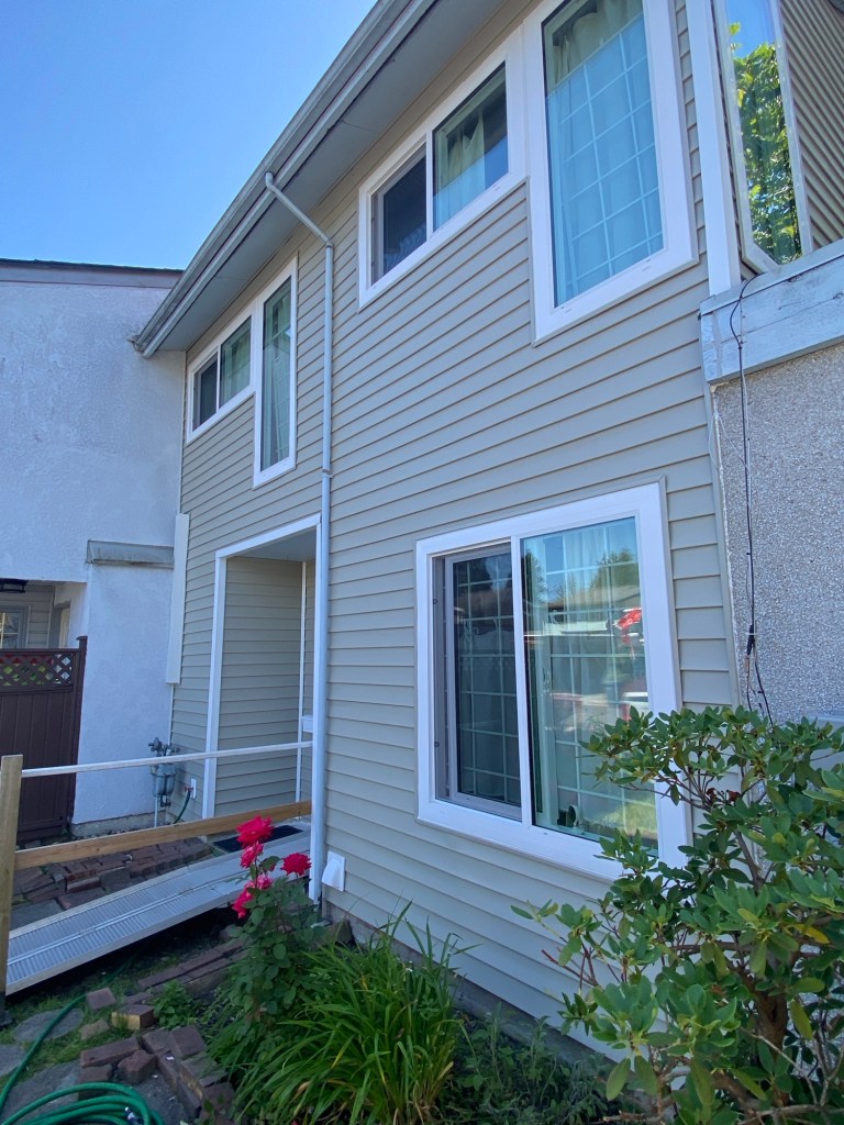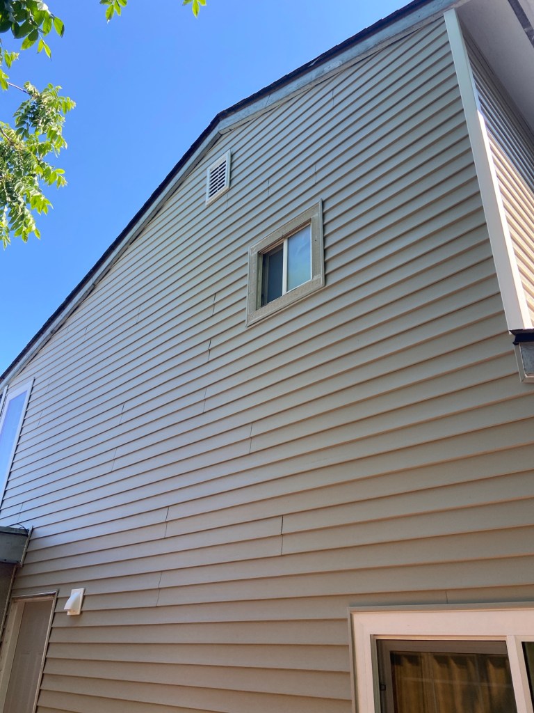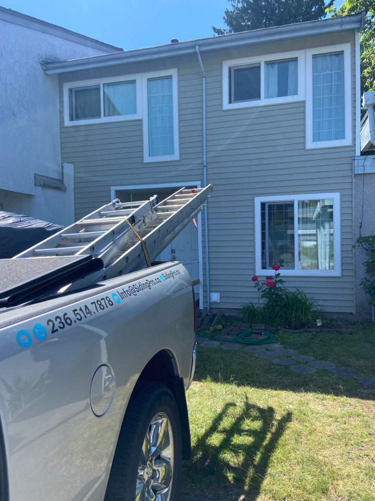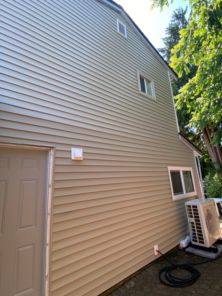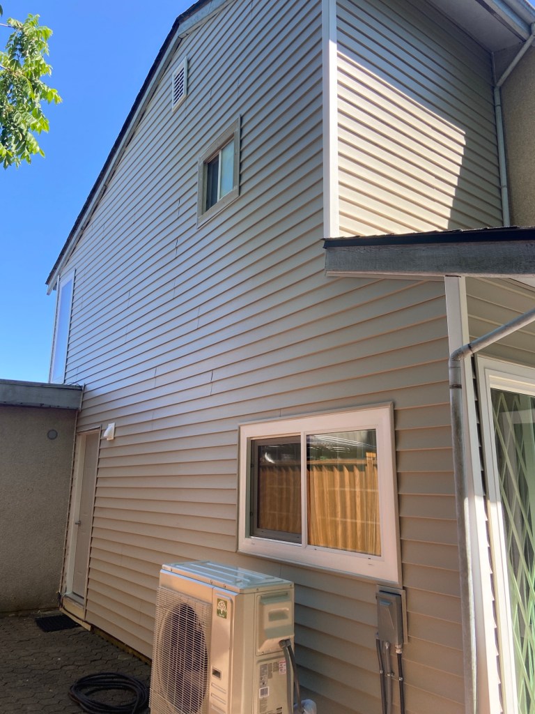 New Premium Vinyl Horizontal D4.5 Bevel in Clay Colour. J channels in clay colour around windows and doors. White corners and gable vent. Mounting blocks hose bibs, light and plug plates. Tyvek homewrap and vapour barrier tape.