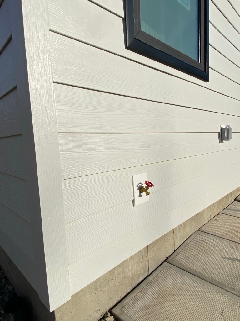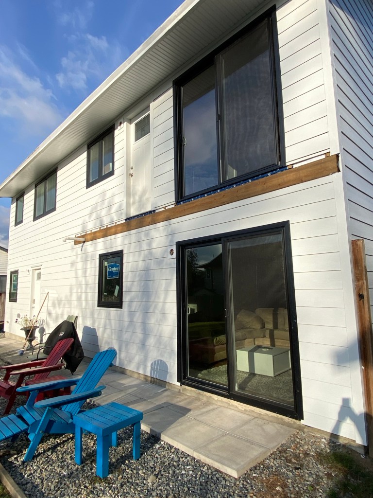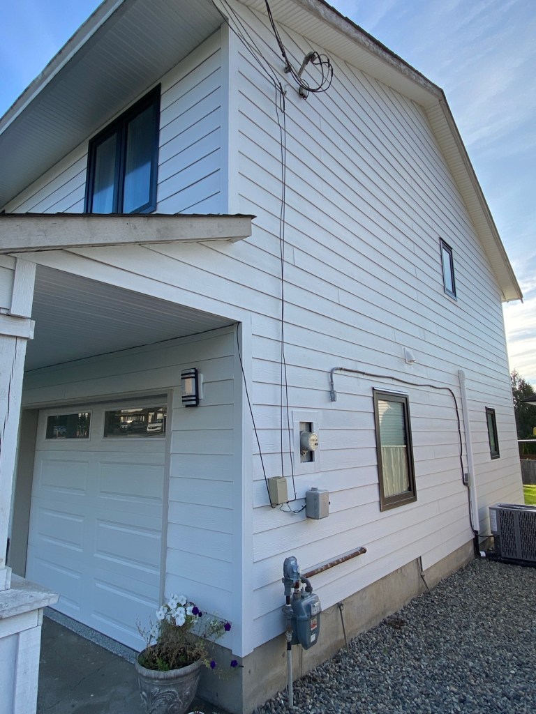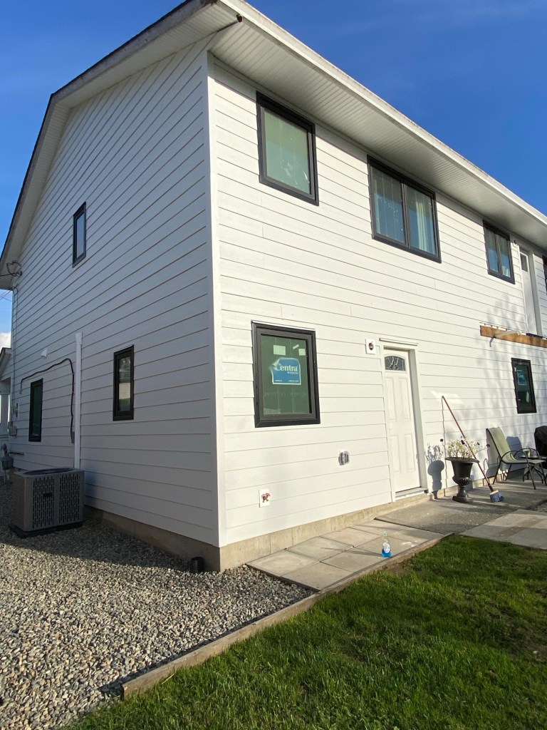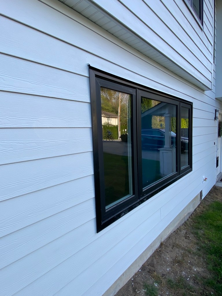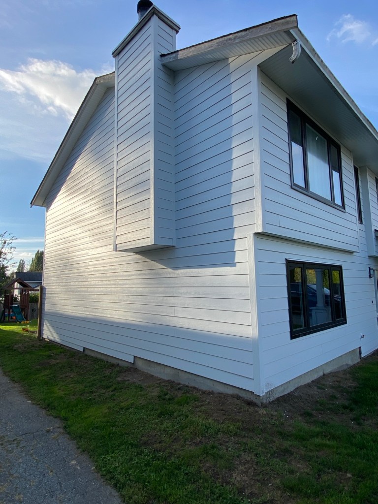 Professional Siding replaced old vinyl siding with new Hardie fibre cement siding cedarmill finish 7” reveal in Arctic White colour. Corners are Hardie fibre cement 1×4” in Arctic White. Siding edges are tucked in slotted windows frame. Tyvek homewrap, vented starter strips, treated rainscreen strappings, white mounting blocks.