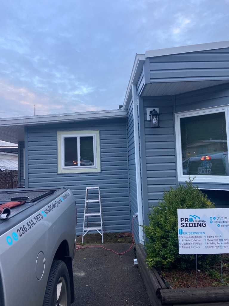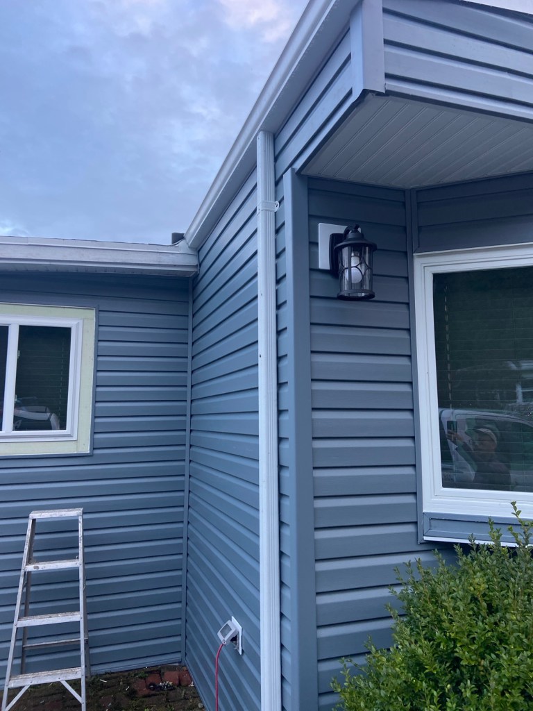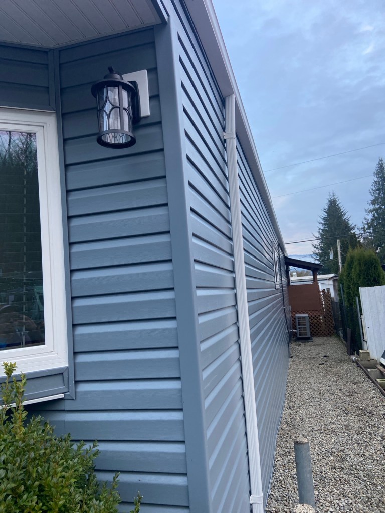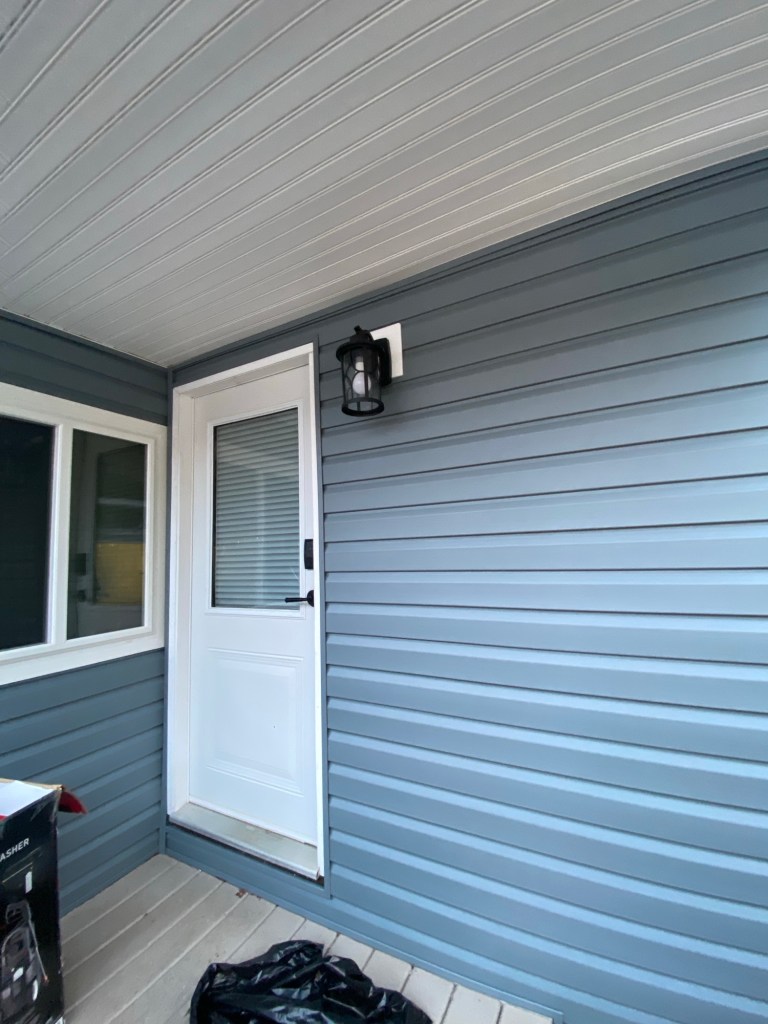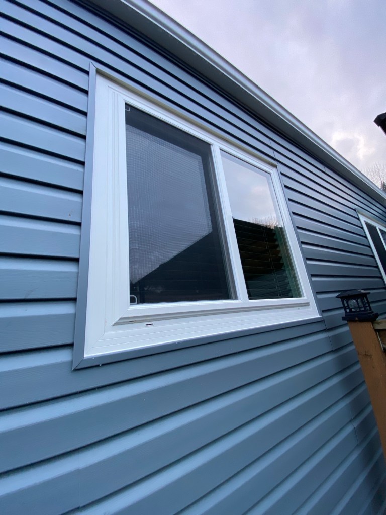 Beautiful exterior transformation from old aluminum siding to premium vinyl D4.5 Dutchlap horizontal siding in Indigo colour. Outside corners, inside corners, and J channels are also in Indigo colour. Full old siding demolition, Tyvek home wrap, white mounting blocks, custom metal flashings, and rot sheathing repairs. We also replaced old vinyl soffits with new premium vented beaded soffits.