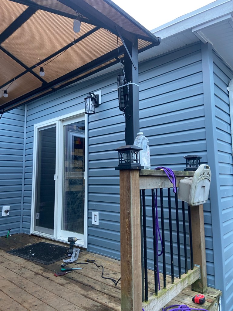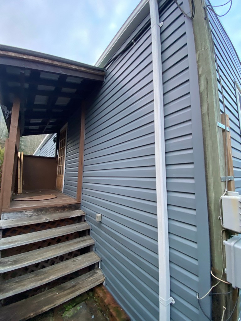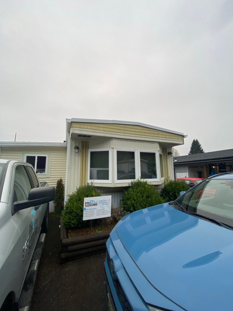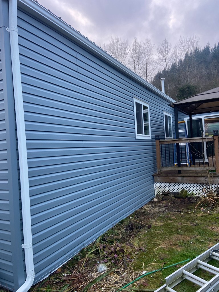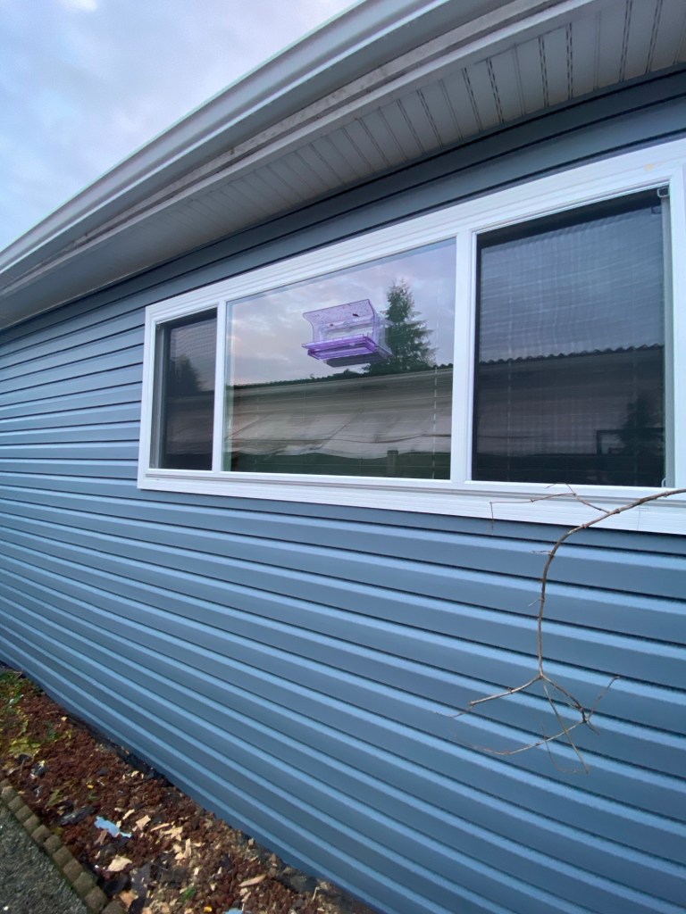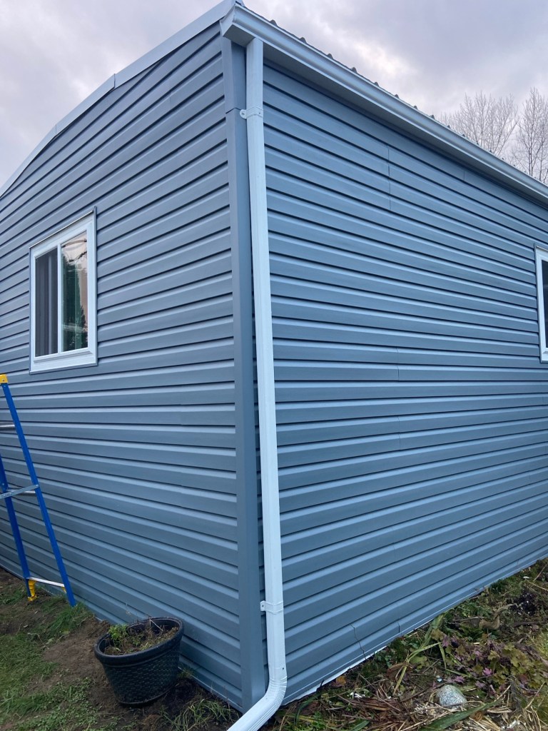 Beautiful exterior transformation from old aluminum siding to premium vinyl D4.5 Dutchlap horizontal siding in Indigo colour. Outside corners, inside corners, and J channels are also in Indigo colour. Full old siding demolition, Tyvek home wrap, white mounting blocks, custom metal flashings, and rot sheathing repairs. We also replaced old vinyl soffits with new premium vented beaded soffits.