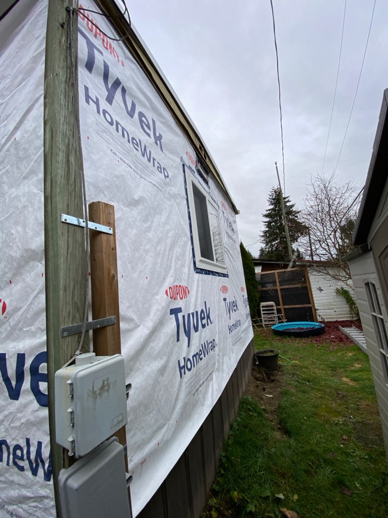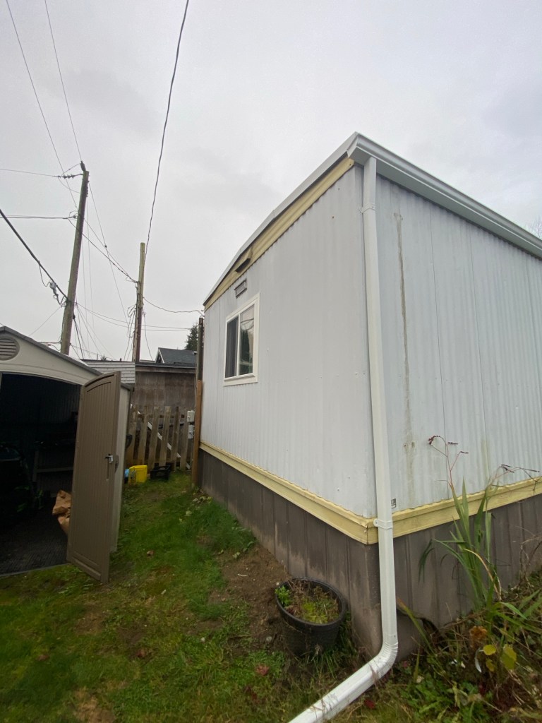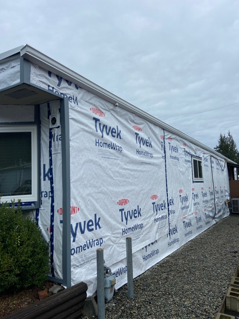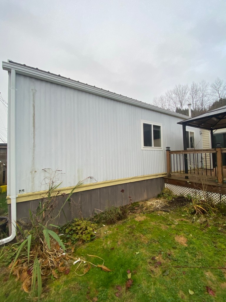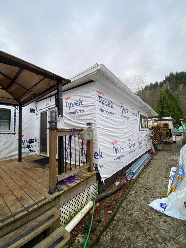 Beautiful exterior transformation from old aluminum siding to premium vinyl D4.5 Dutchlap horizontal siding in Indigo colour. Outside corners, inside corners, and J channels are also in Indigo colour. Full old siding demolition, Tyvek home wrap, white mounting blocks, custom metal flashings, and rot sheathing repairs. We also replaced old vinyl soffits with new premium vented beaded soffits.