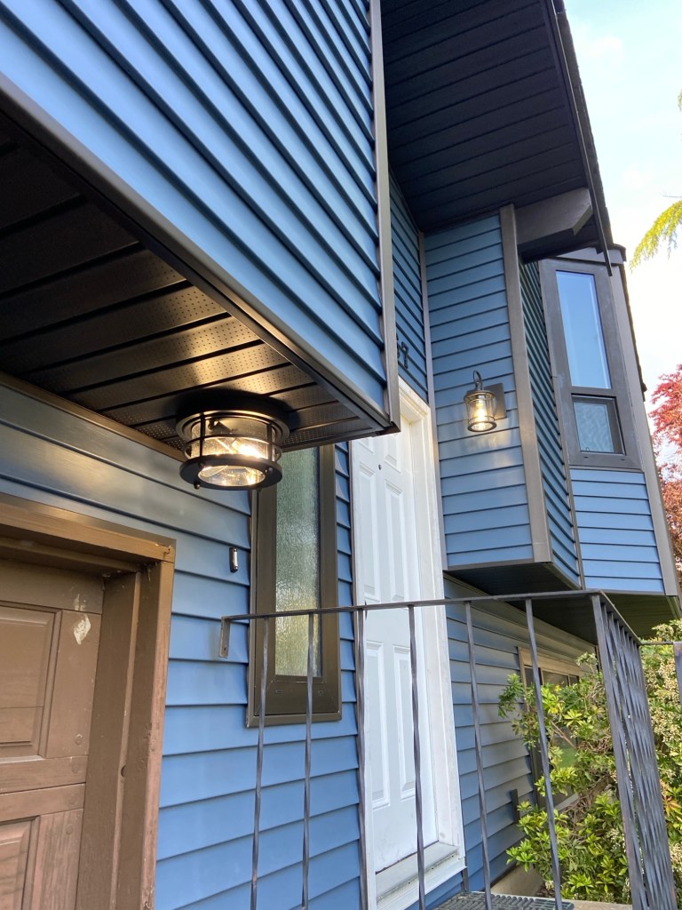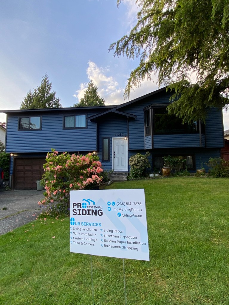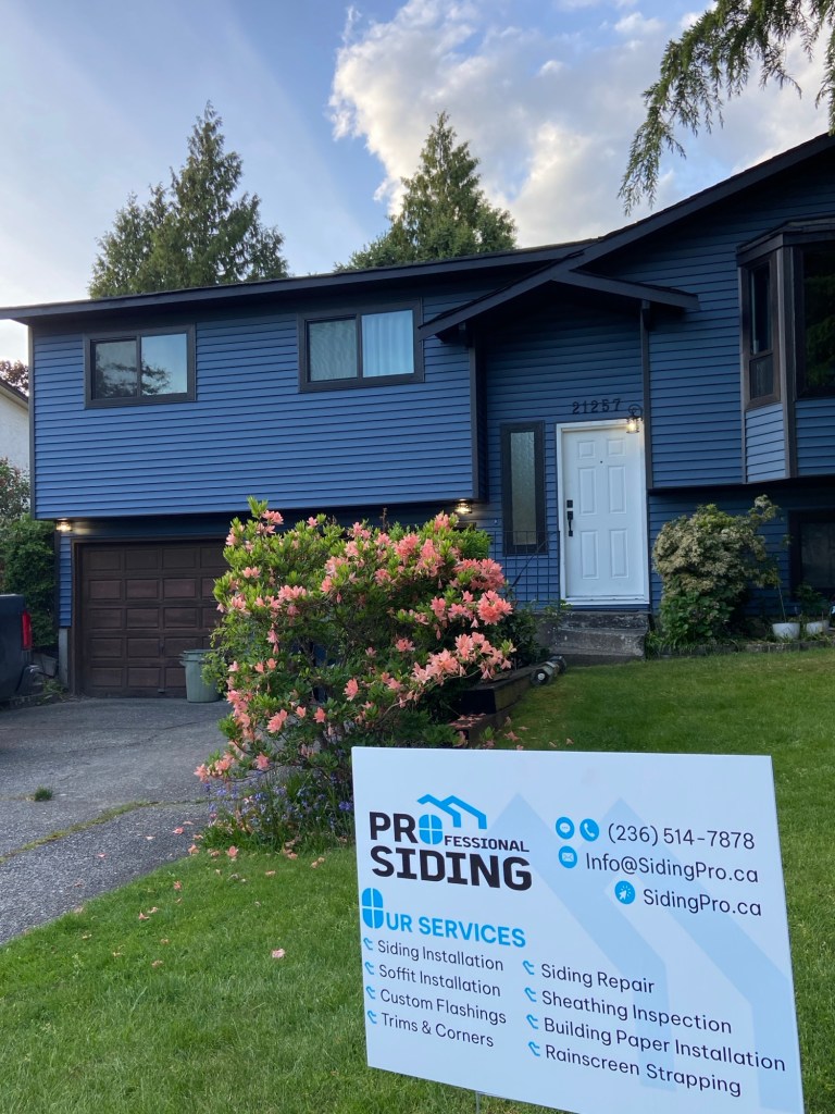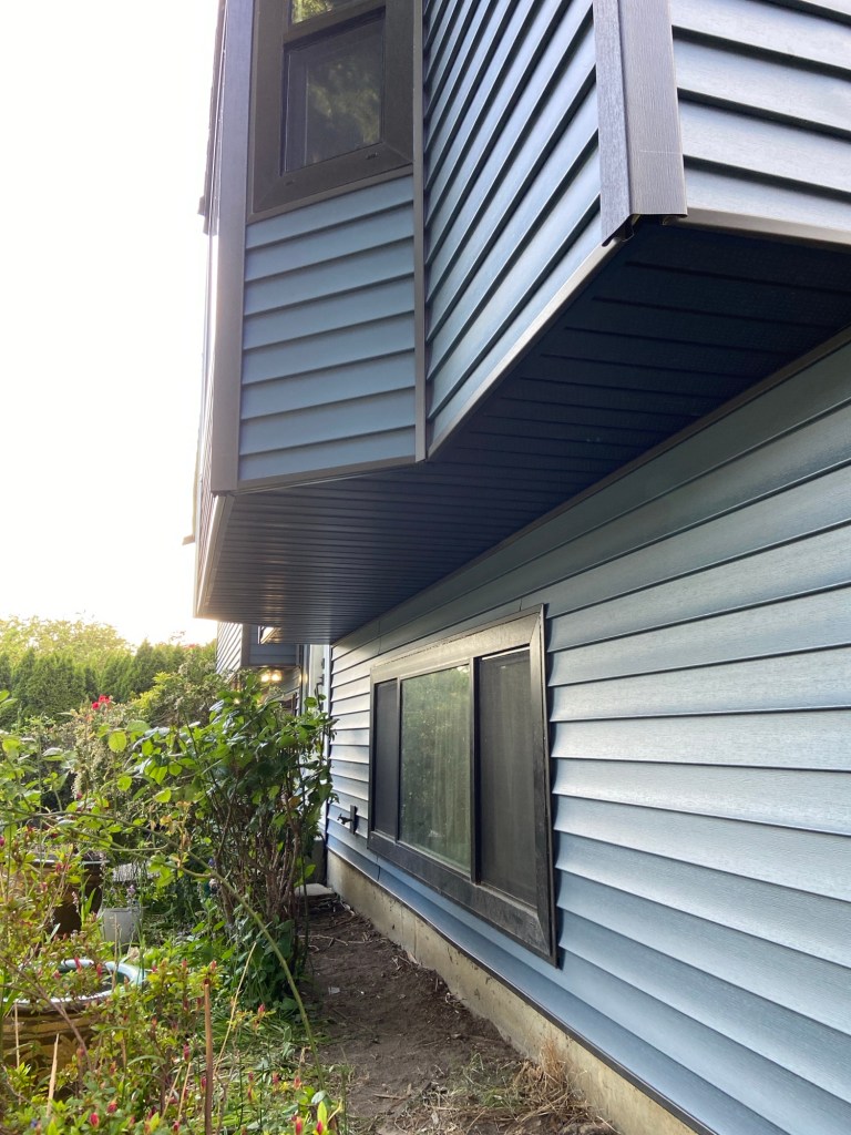 Premium vinyl horizontal D4 bevel siding in Regatta Blue. Gunmetal grey corners and J channels. Black perforated vinyl soffits. Primed and painted Hardie fascia boards in Midnight black. Black mounting blocks and Tyvek homewrap. Old cedar siding, cedar soffits, and wood fascia boards demolition and disposal.