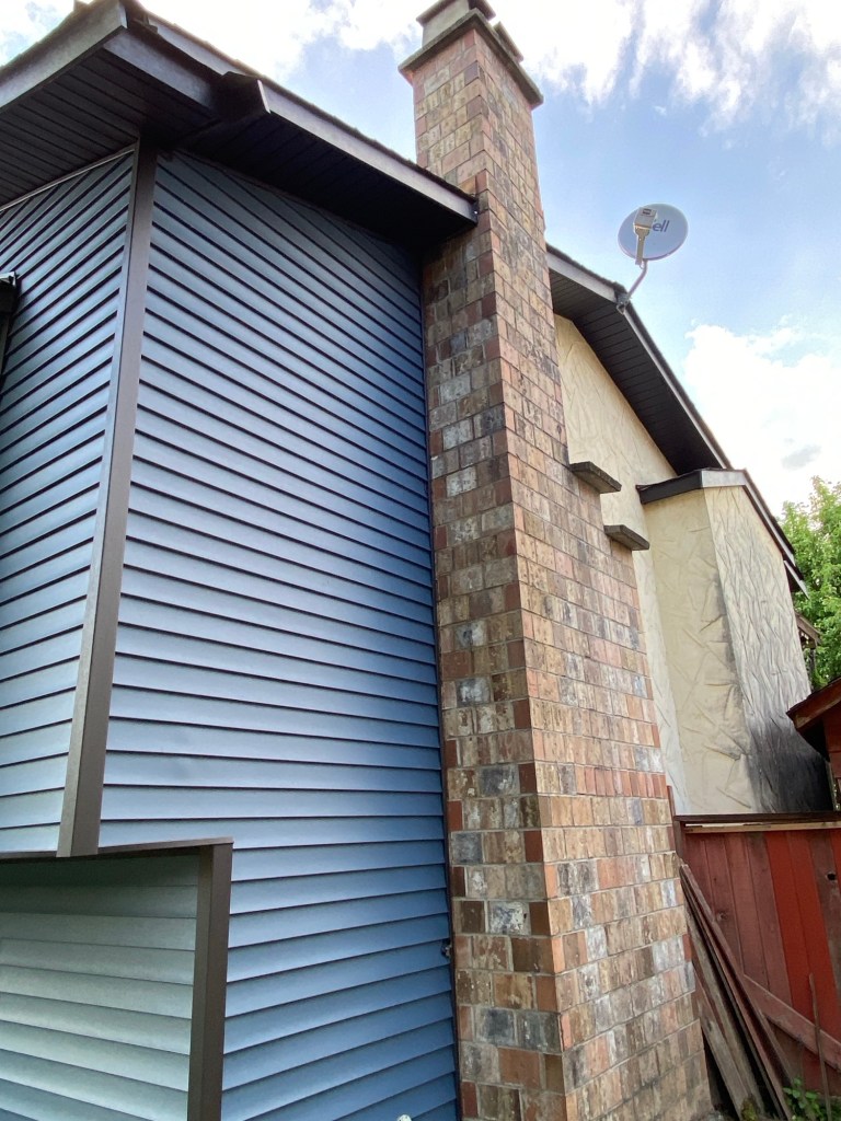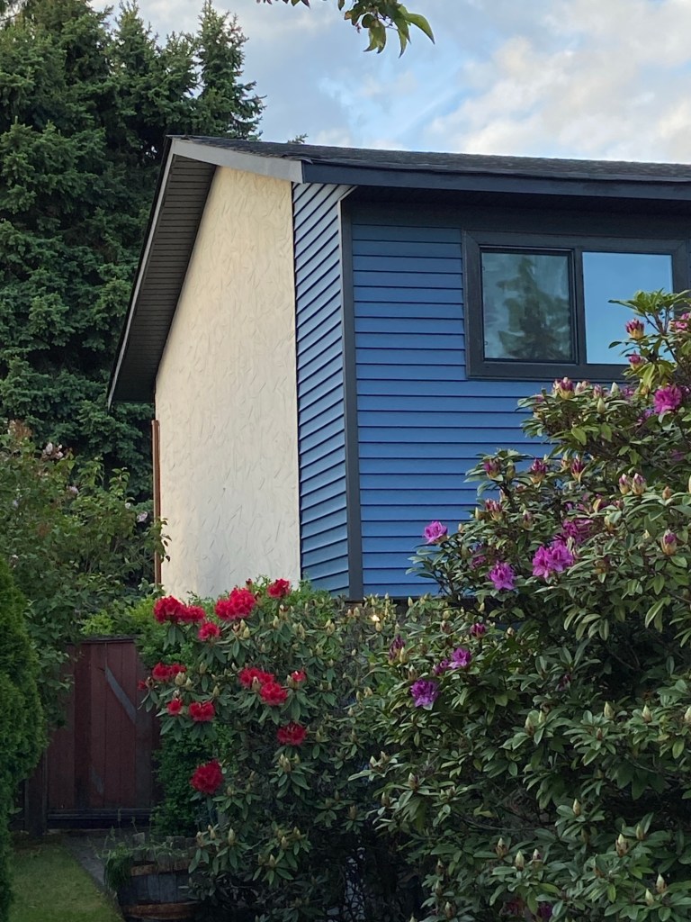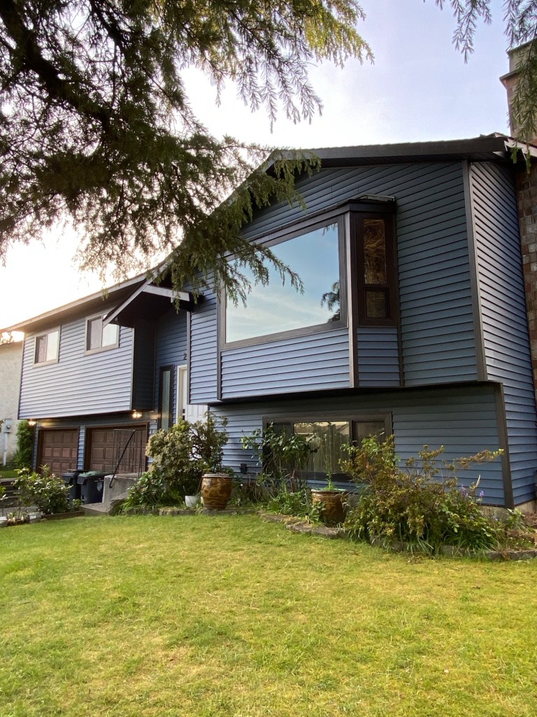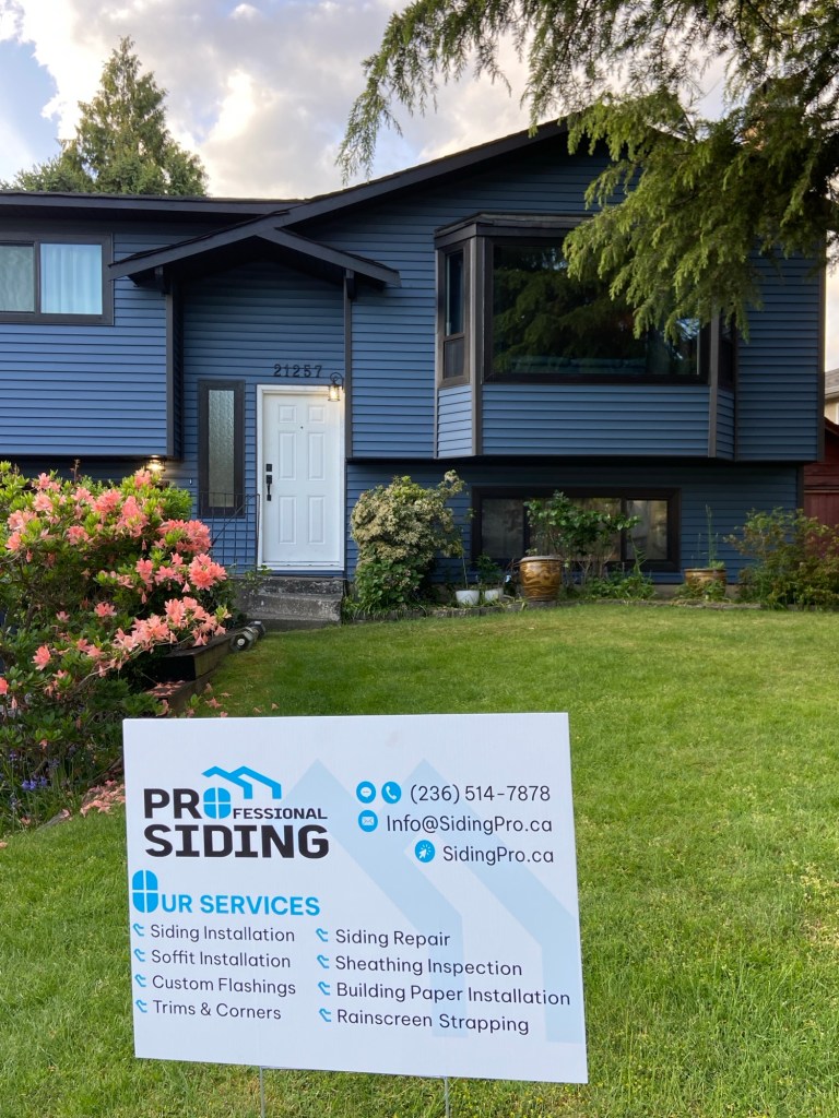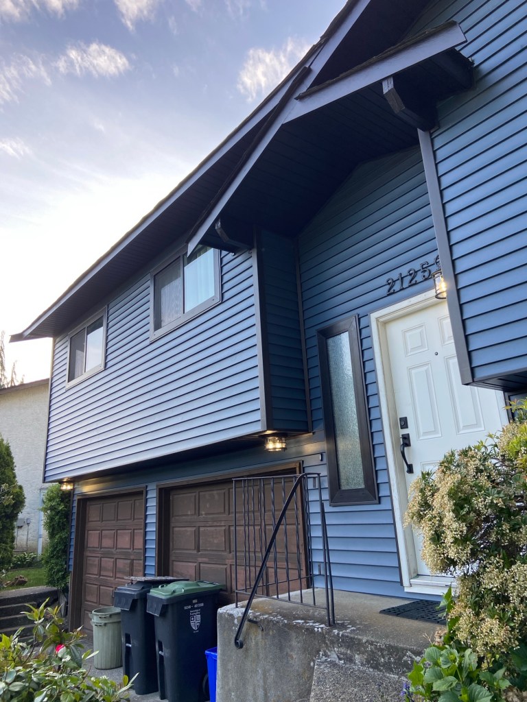 Premium vinyl horizontal D4 bevel siding in Regatta Blue. Gunmetal grey corners and J channels. Black perforated vinyl soffits. Primed and painted Hardie fascia boards in Midnight black. Black mounting blocks and Tyvek homewrap. Old cedar siding, cedar soffits, and wood fascia boards demolition and disposal.