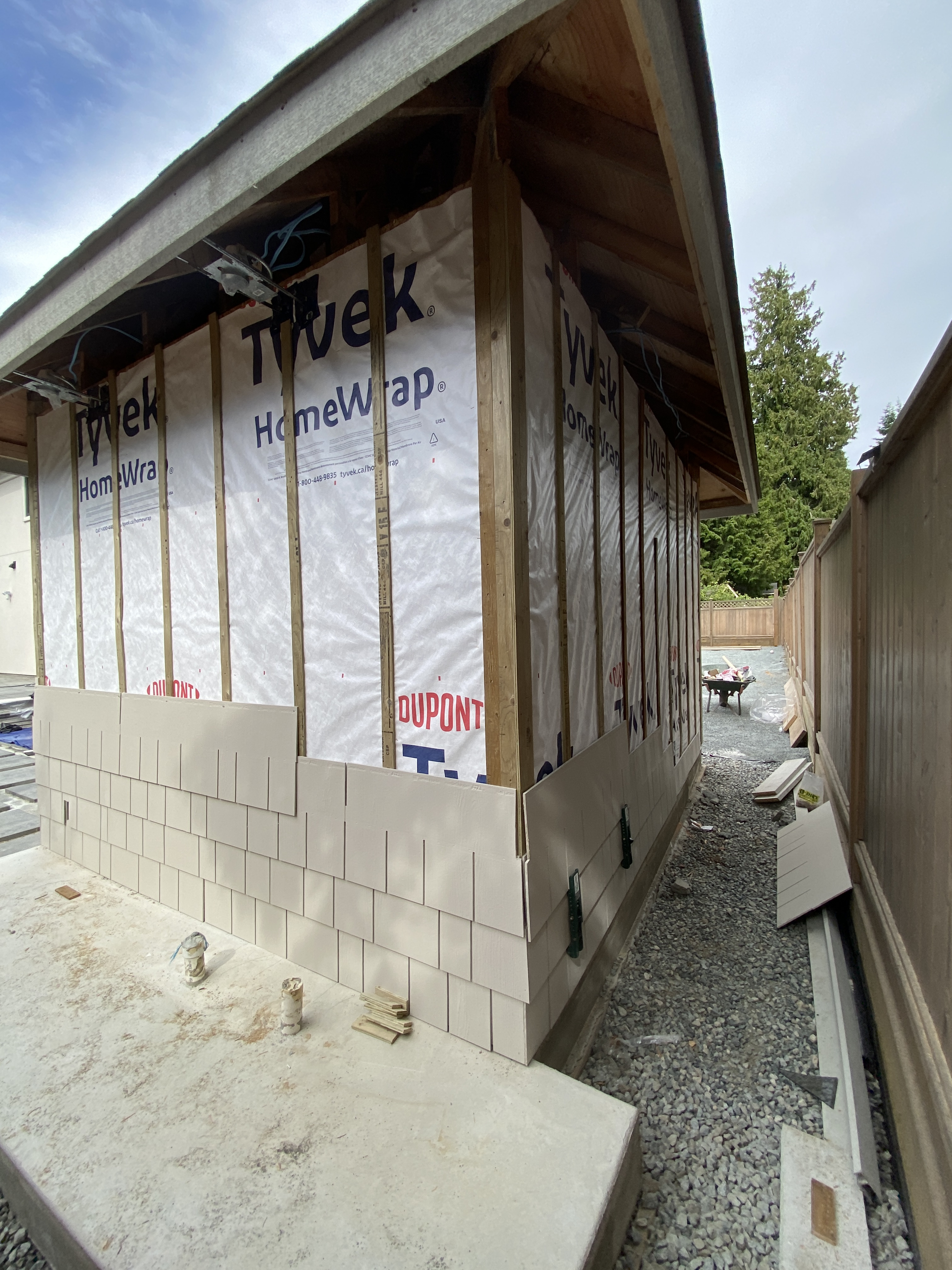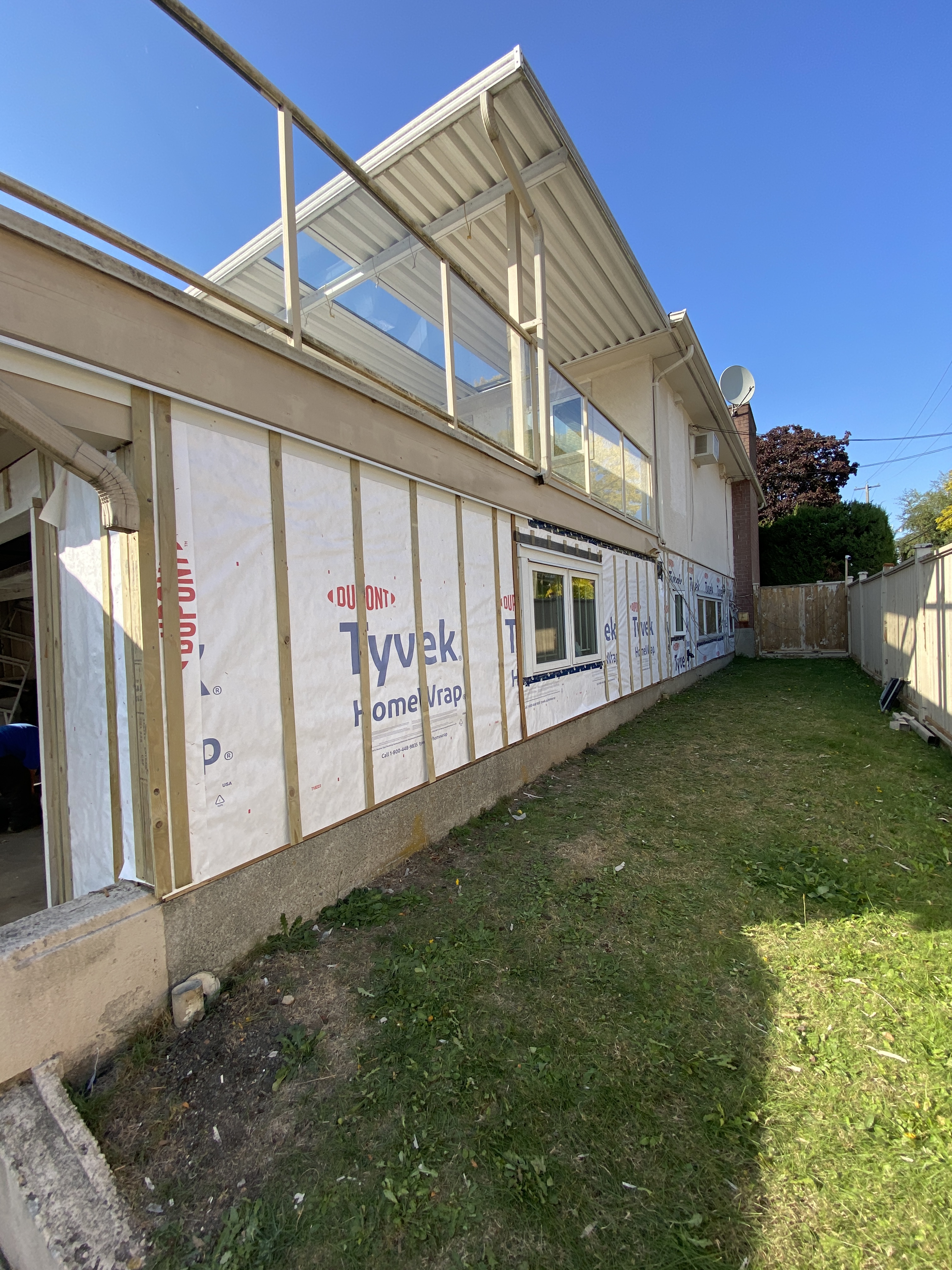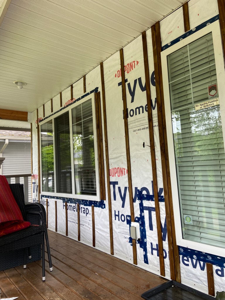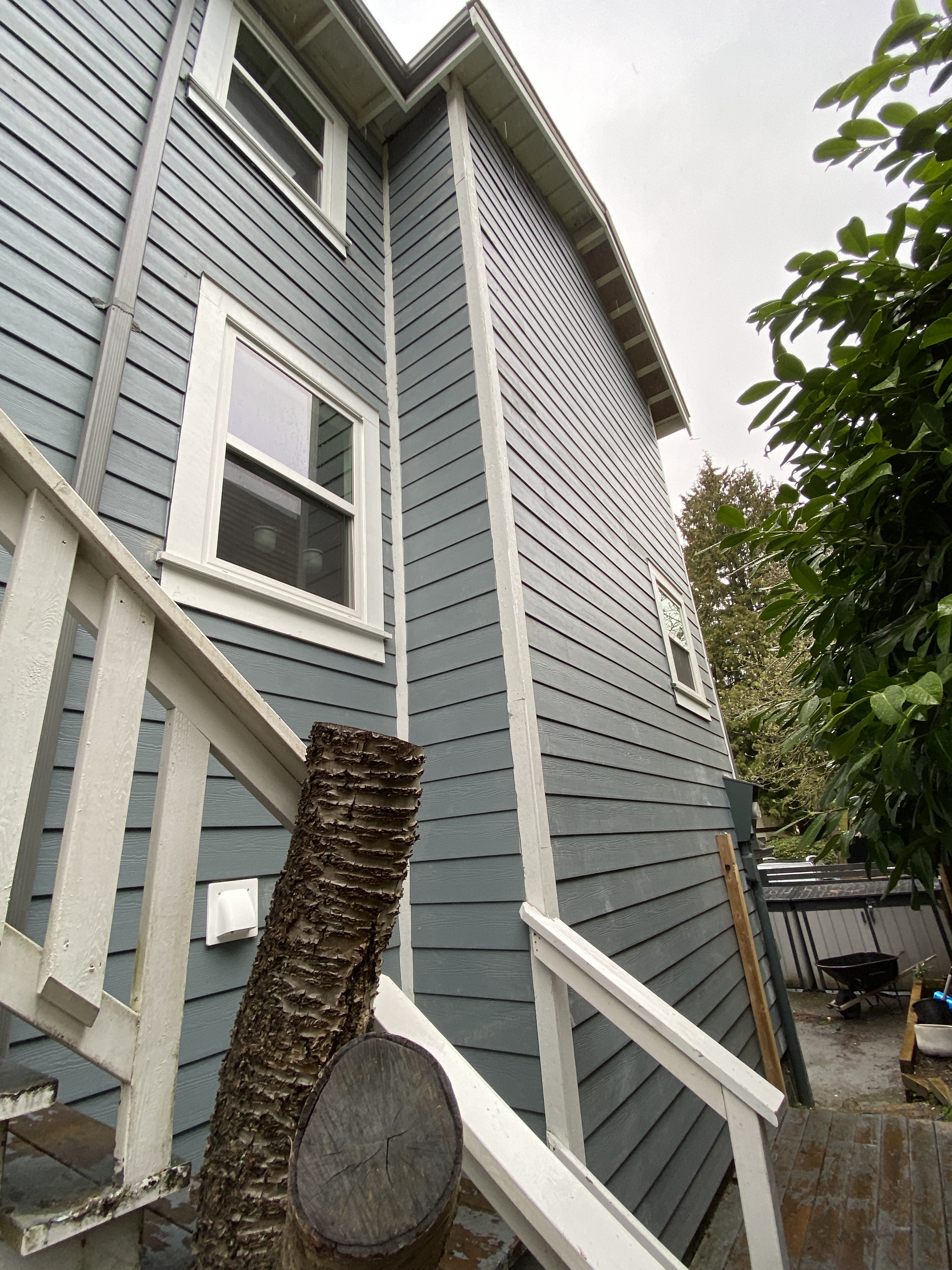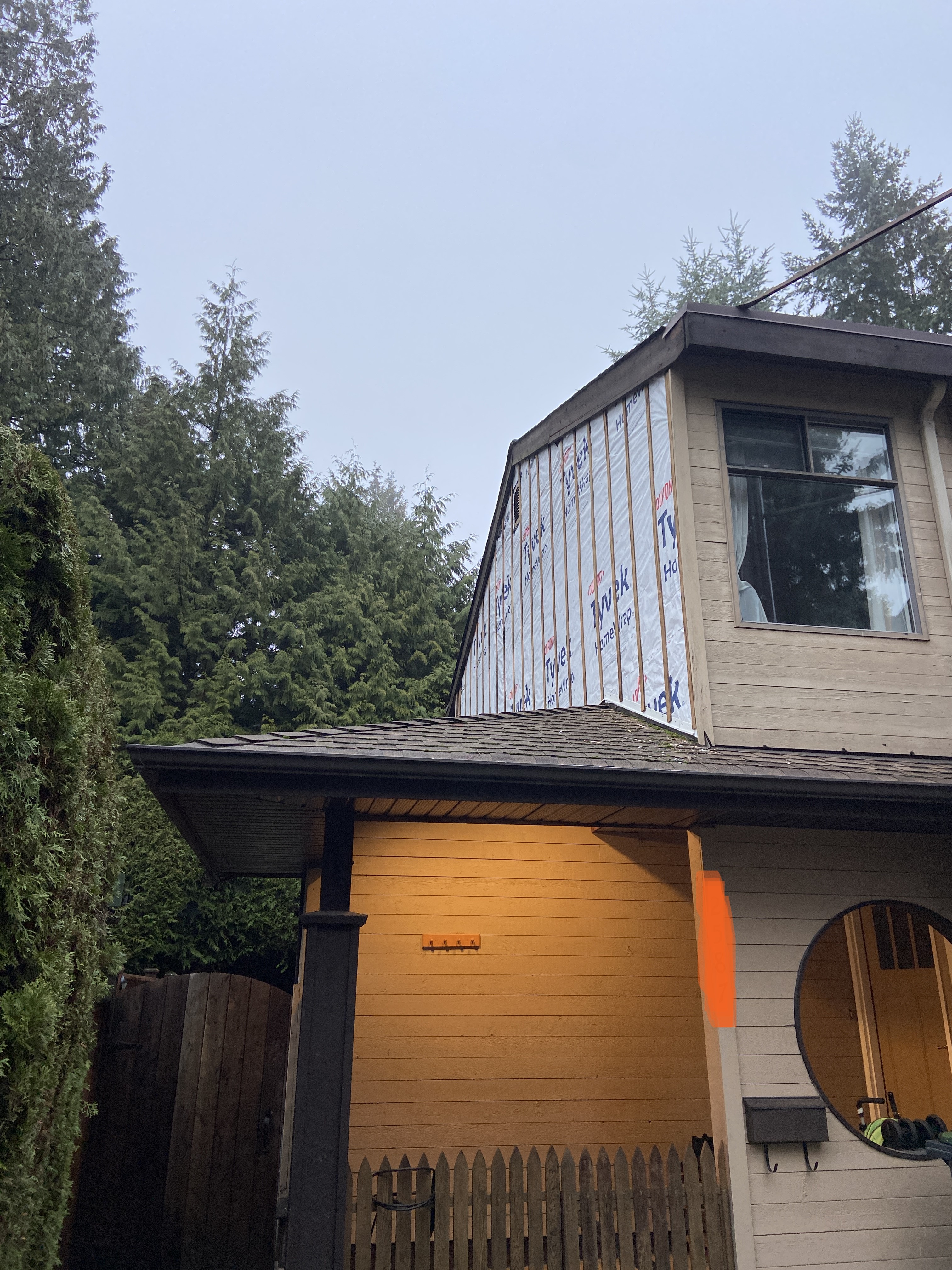 Primed fibre cement 6” reveal horizontal lap siding, fibre cement corners and trims, plus custom painting services. Old cedar siding demolition, Tyvek homewrap, rainscreen strappings, custom flashings.