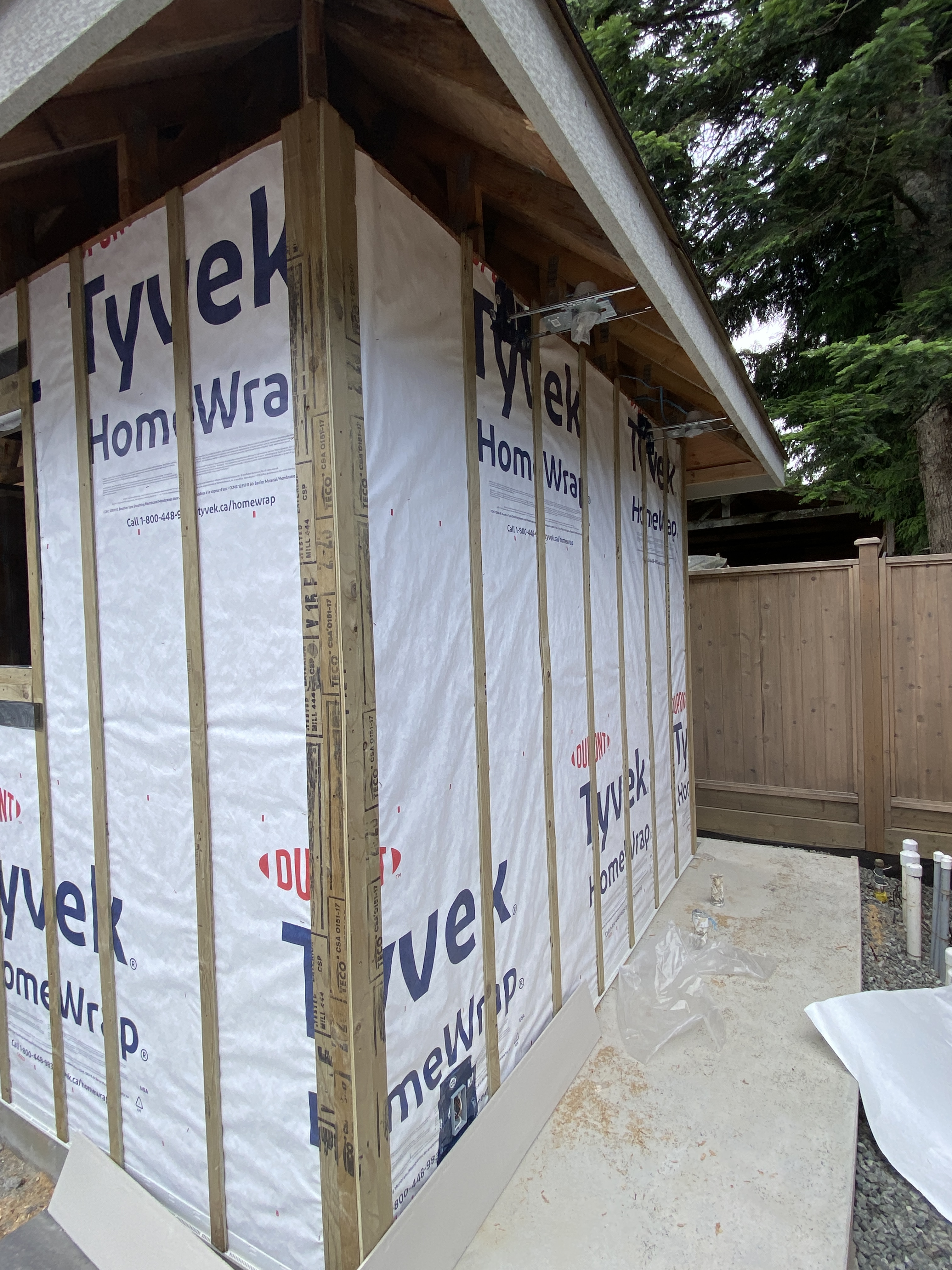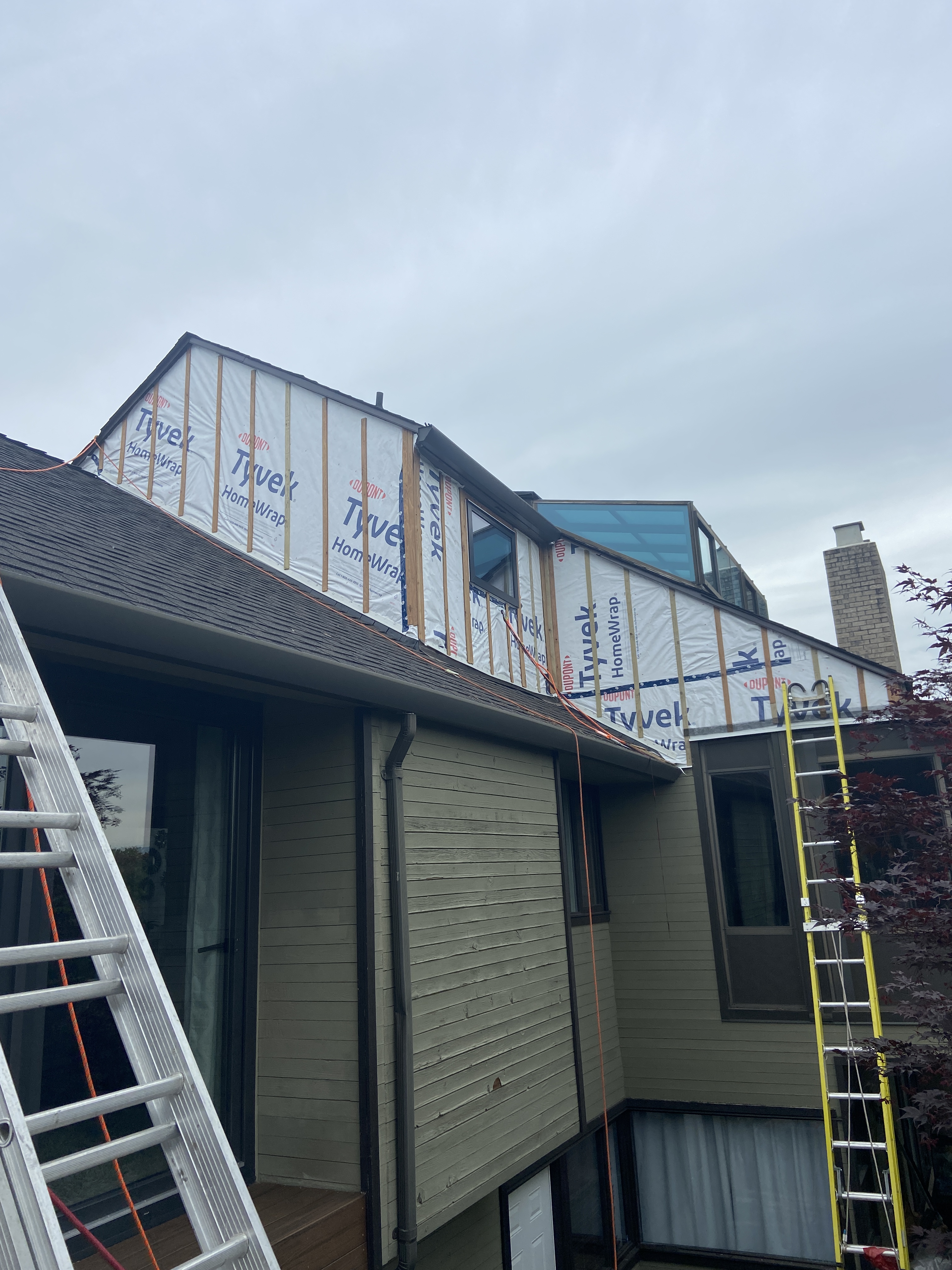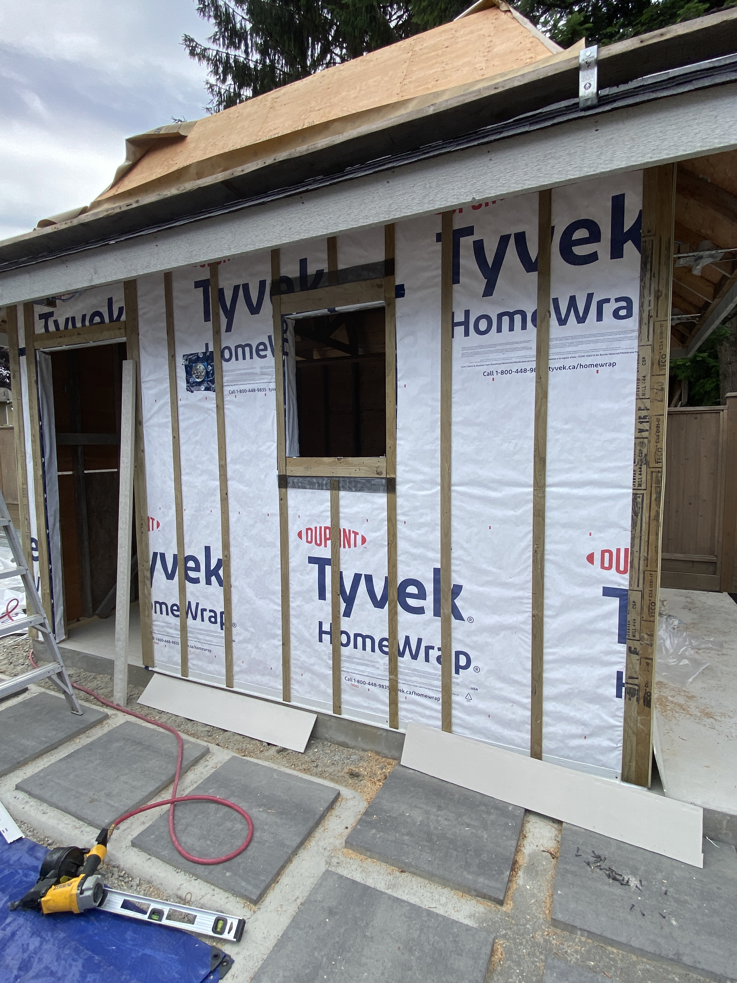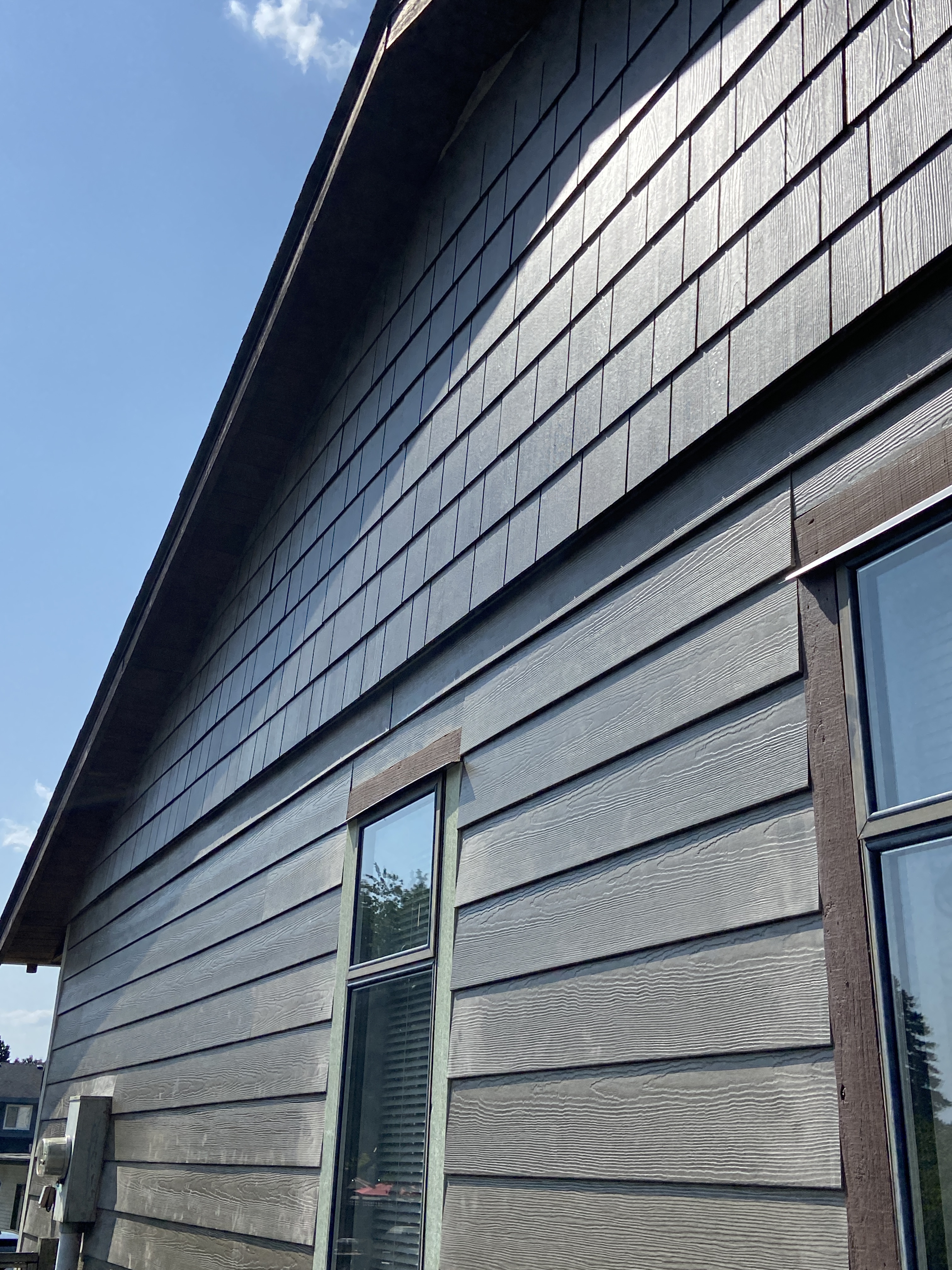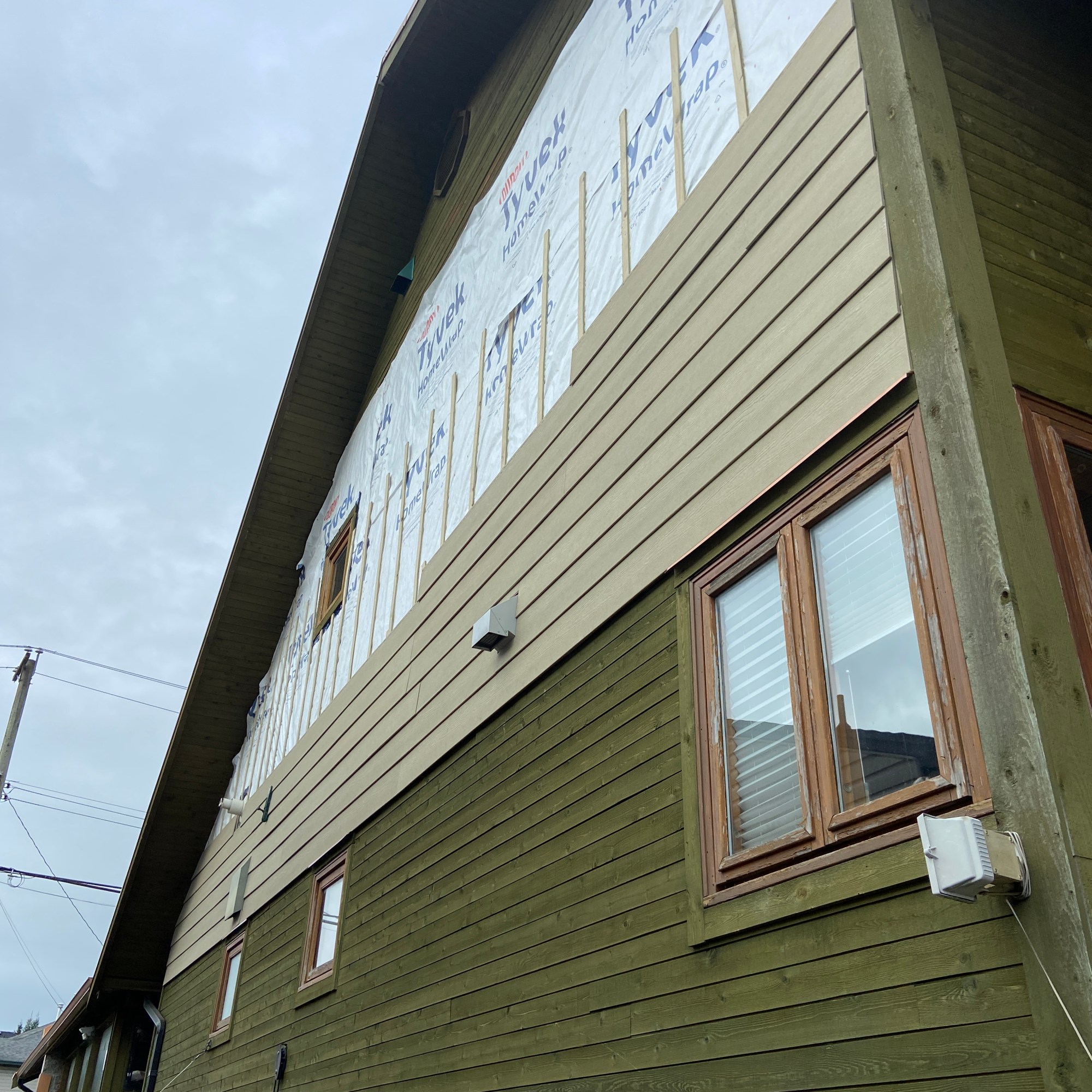 Primed fibre cement 6” reveal horizontal lap siding, fibre cement corners and trims, plus custom painting services. Old cedar siding demolition, Tyvek homewrap, rainscreen strappings, custom flashings.