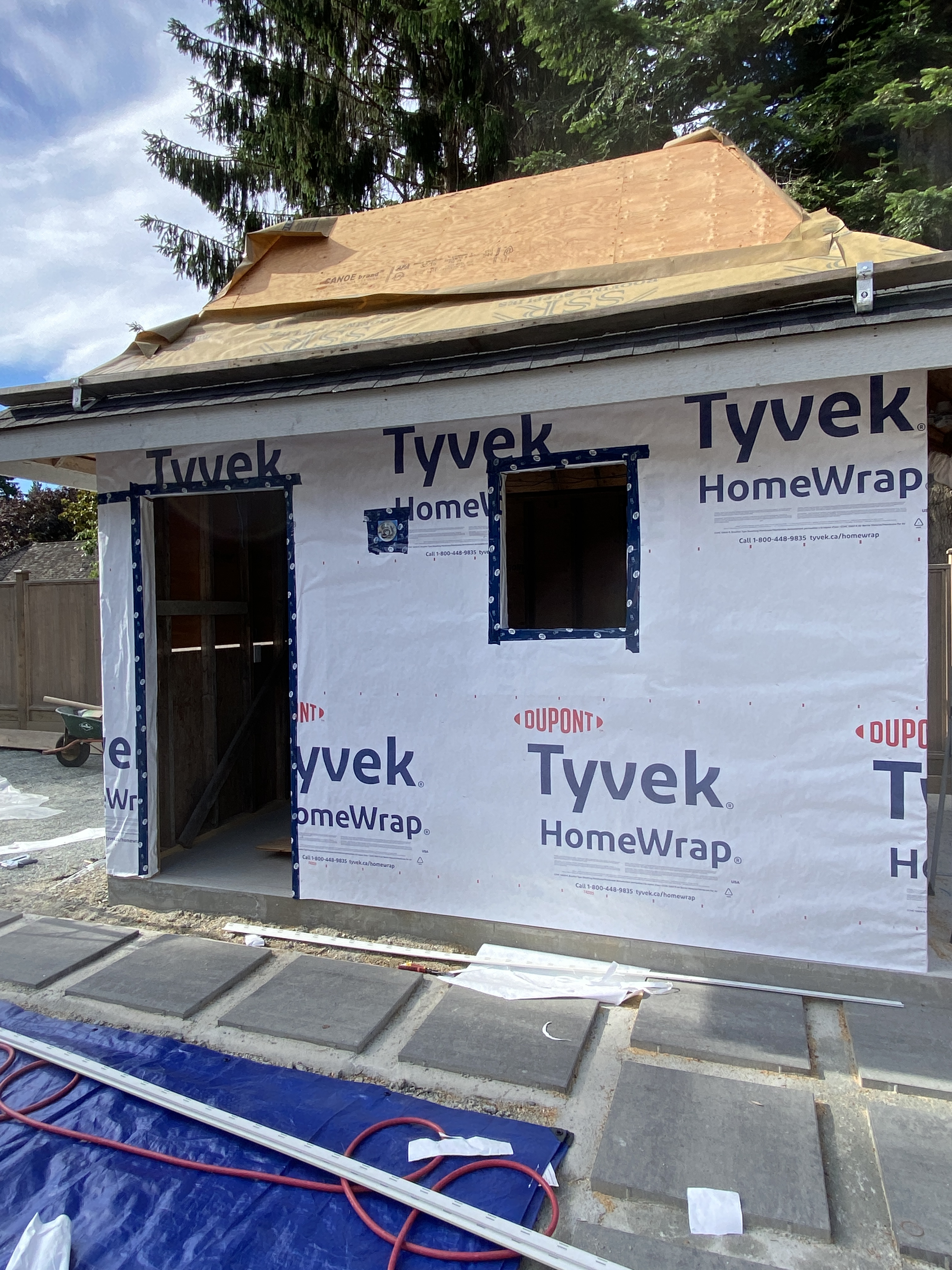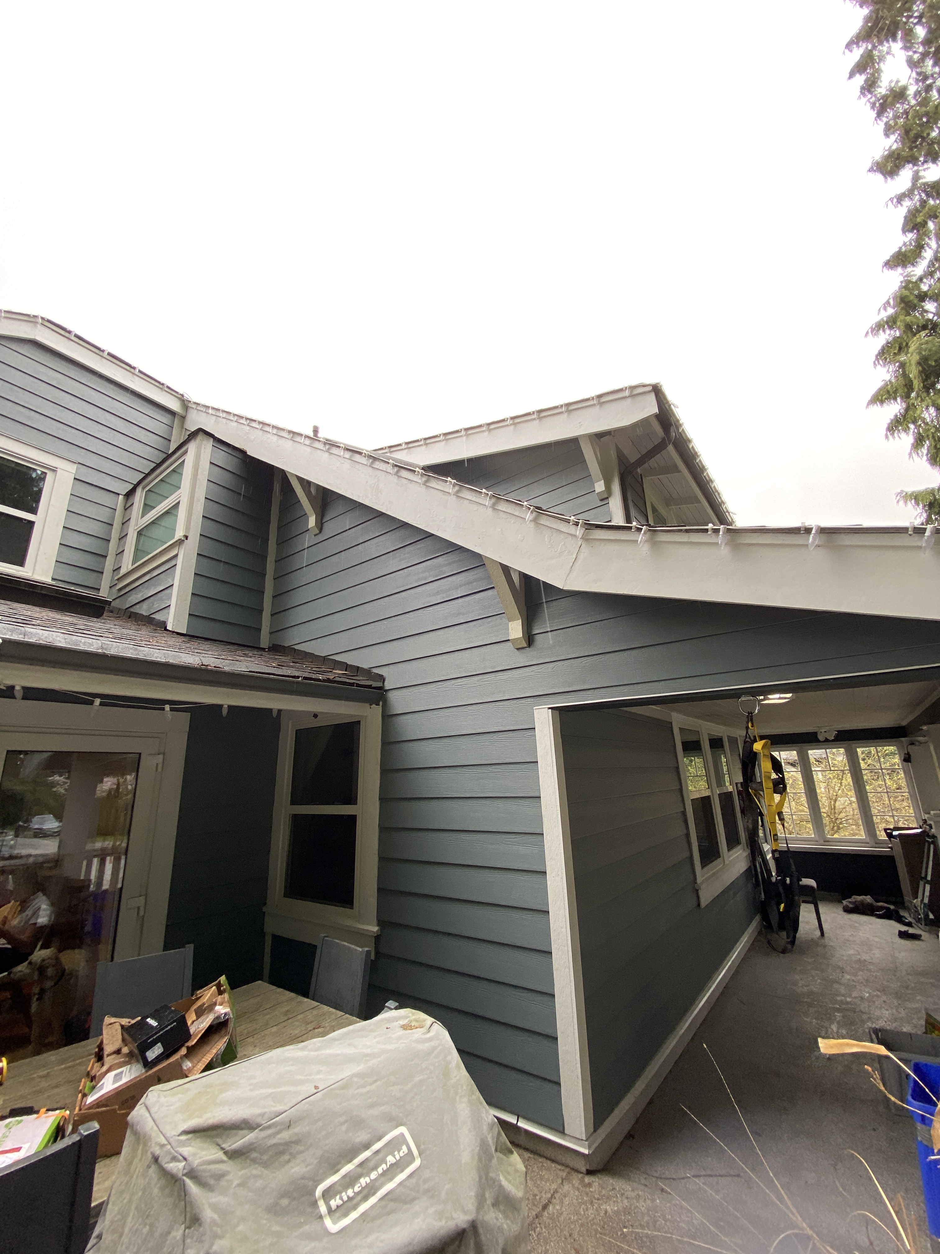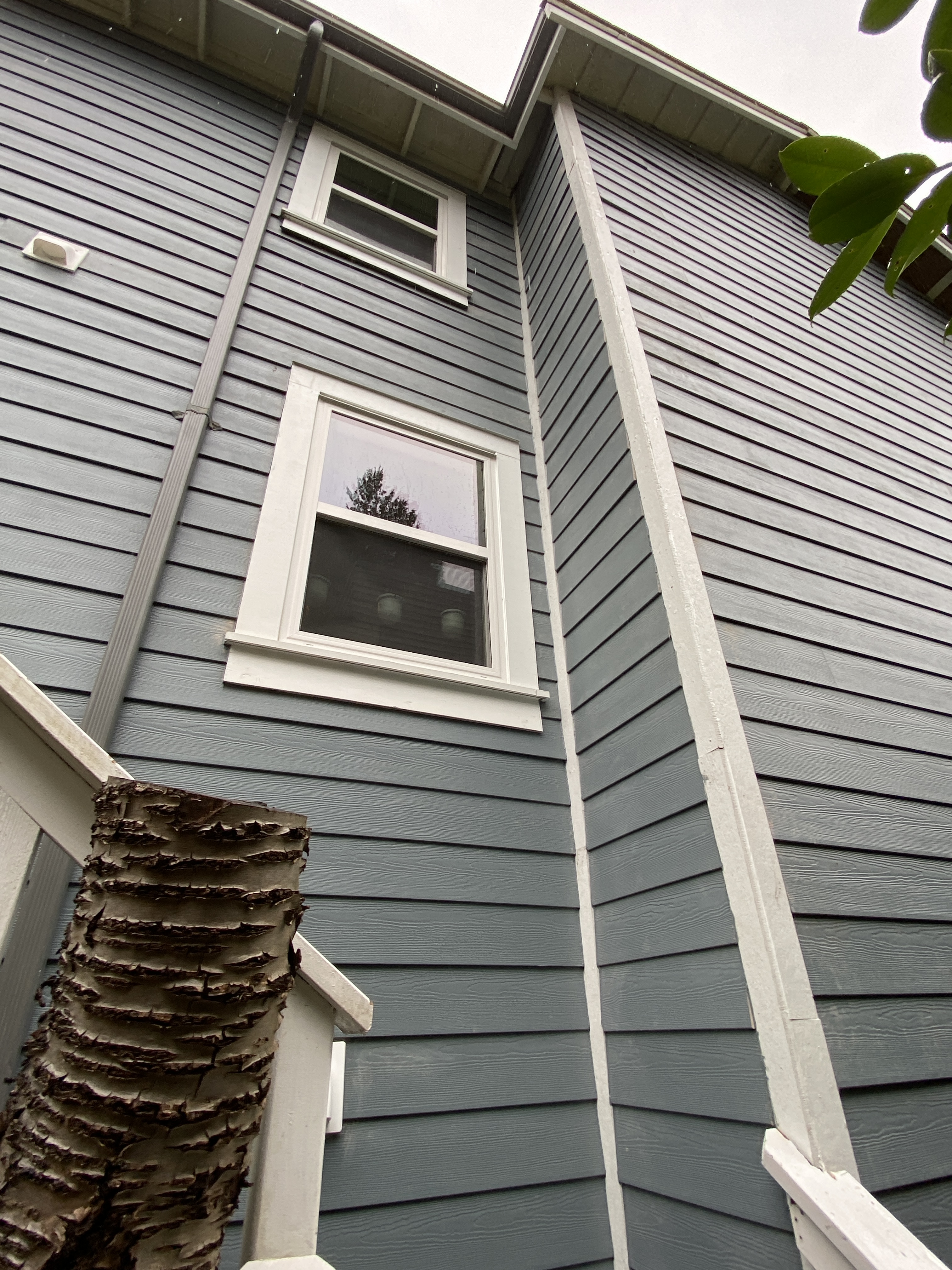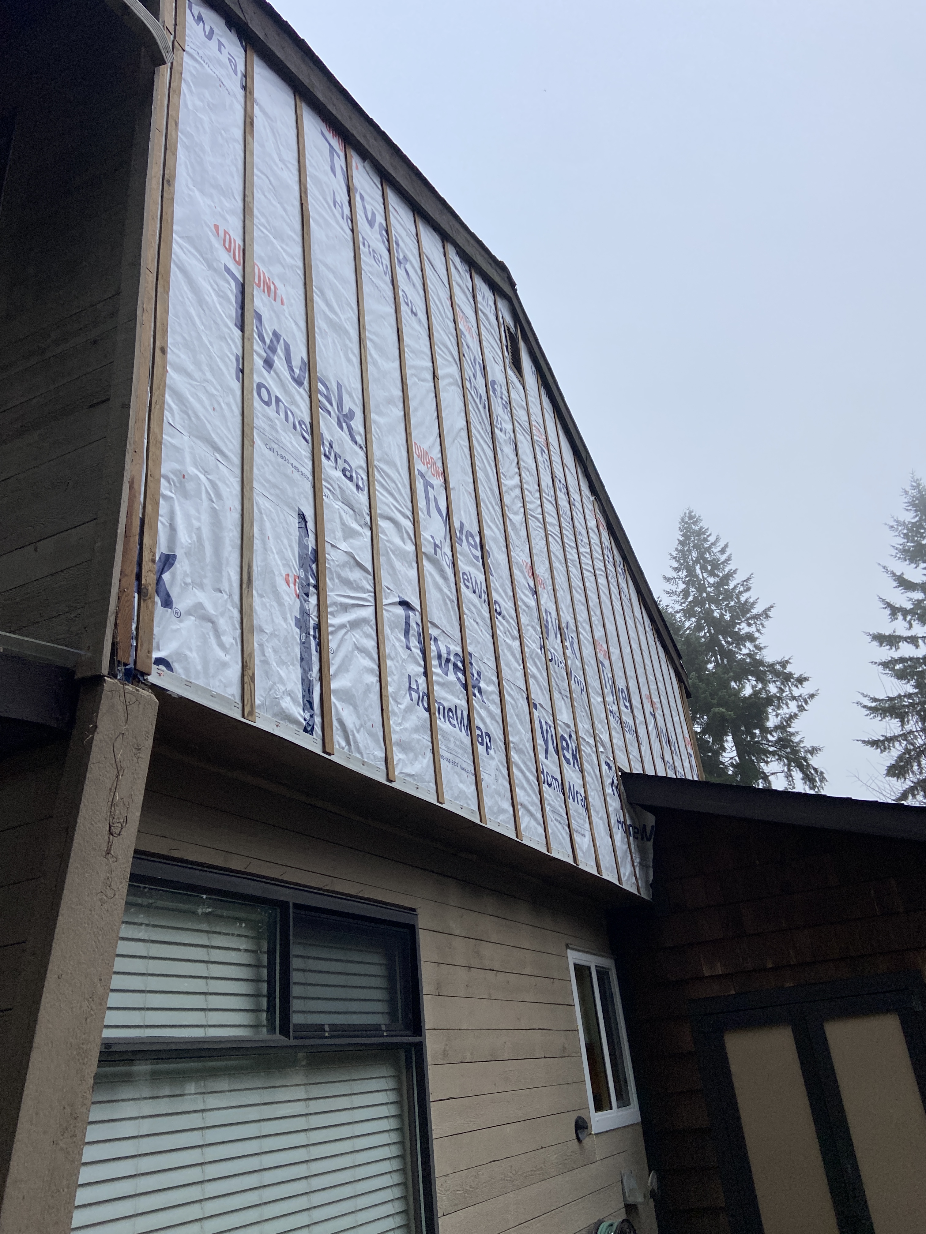 Primed fibre cement 6” reveal horizontal lap siding, fibre cement corners and trims, plus custom painting services. Old cedar siding demolition, Tyvek homewrap, rainscreen strappings, custom flashings.
