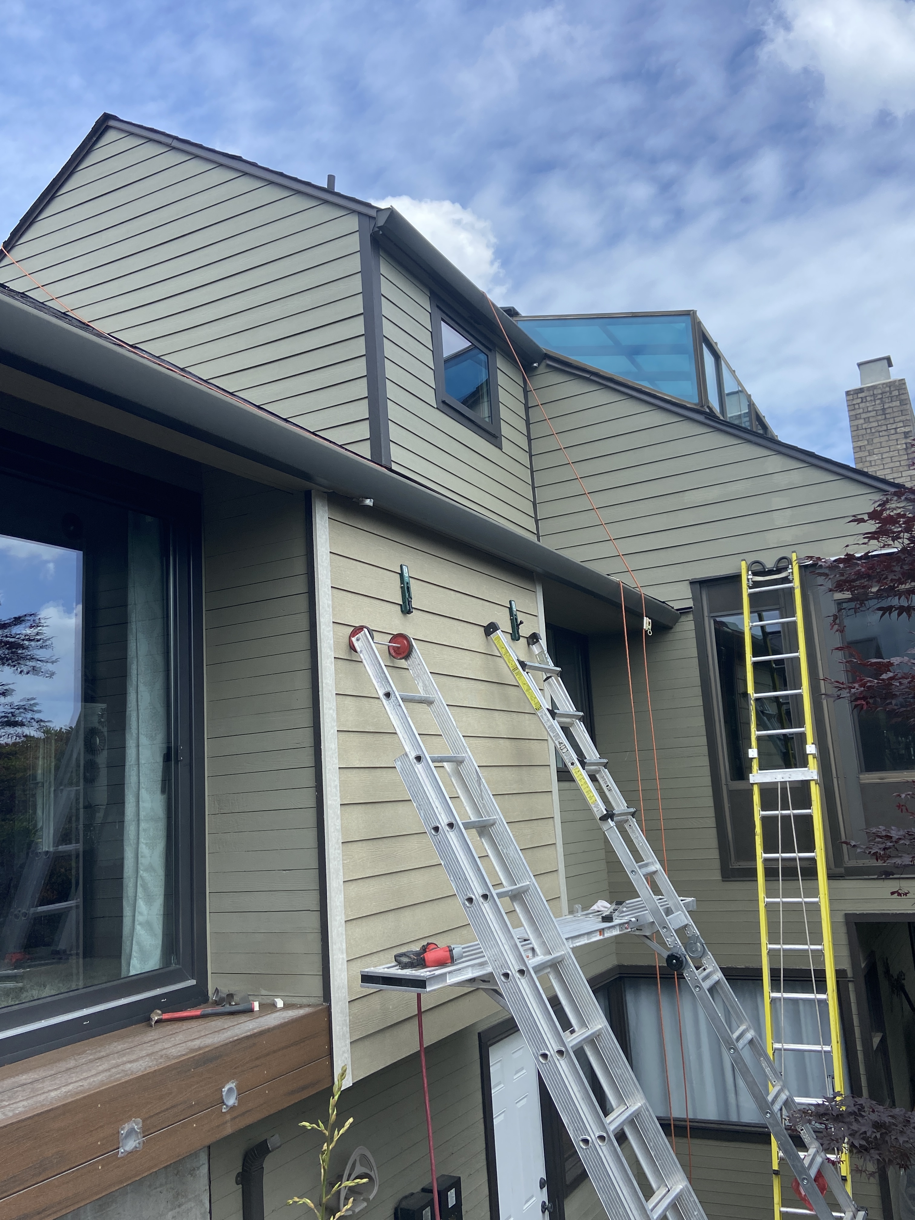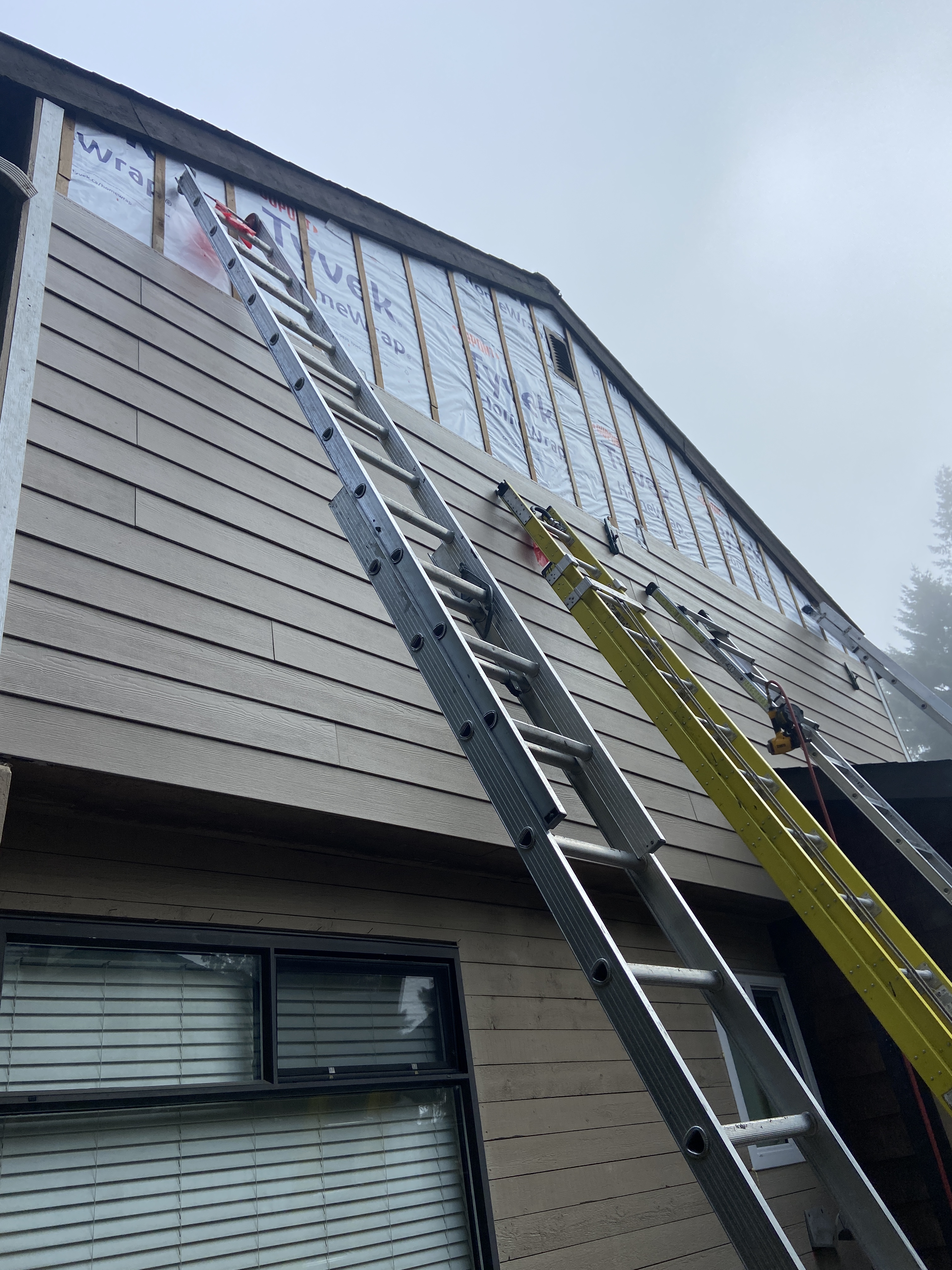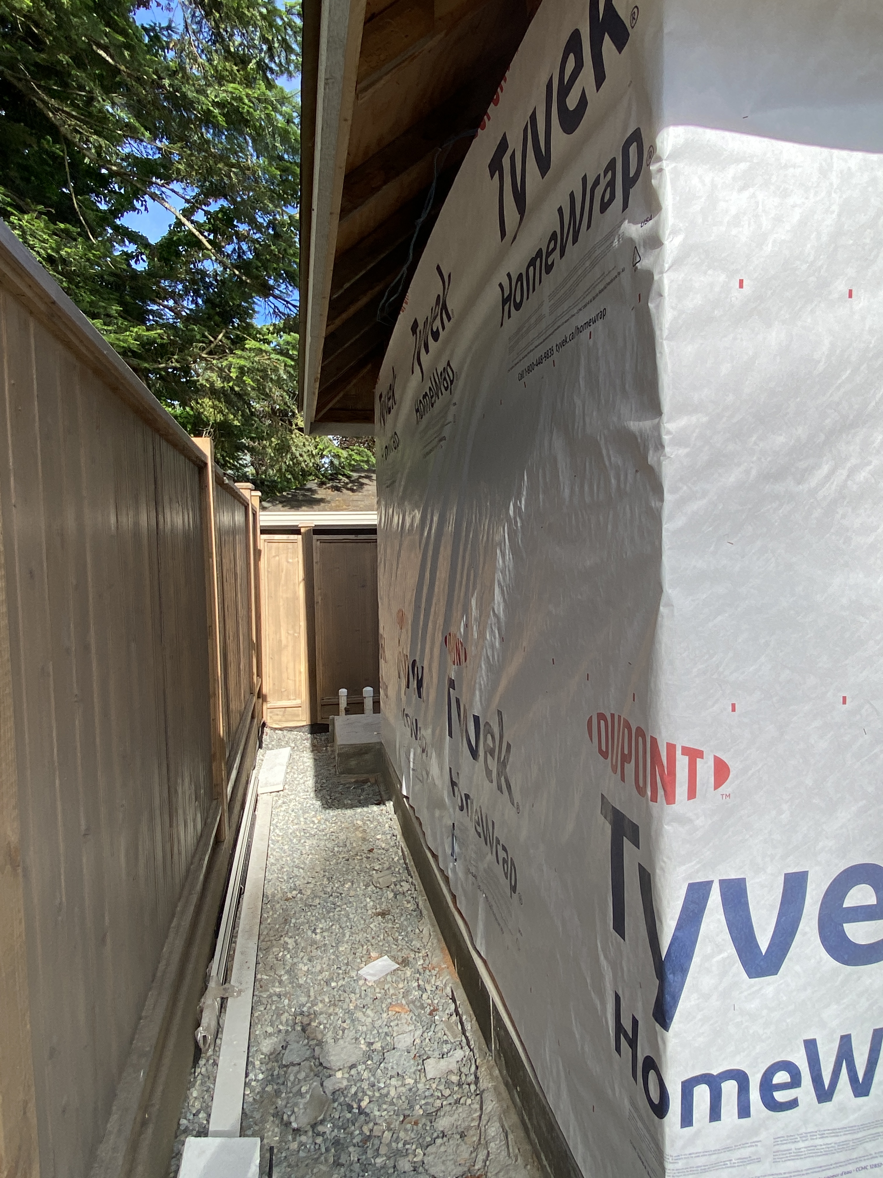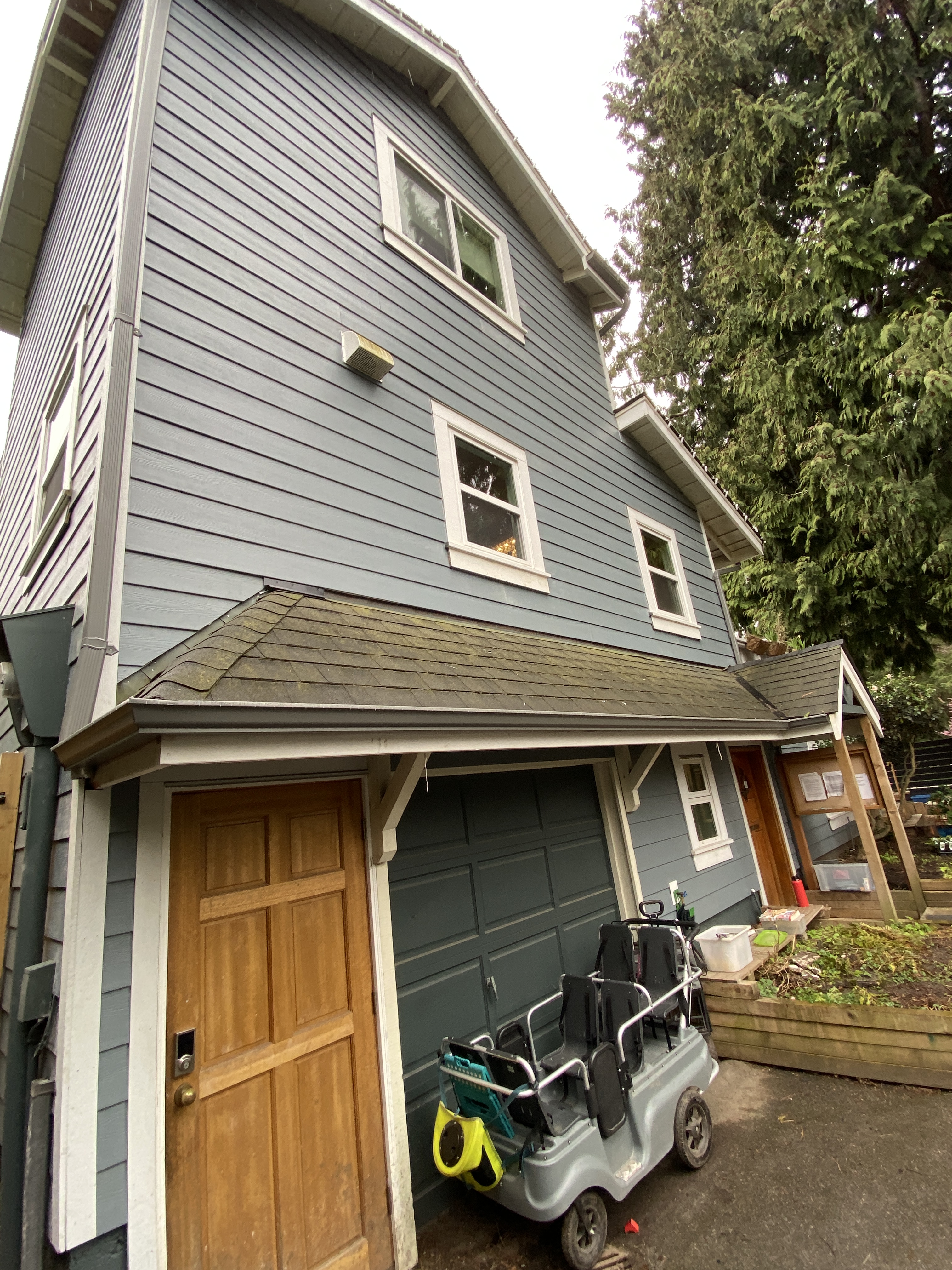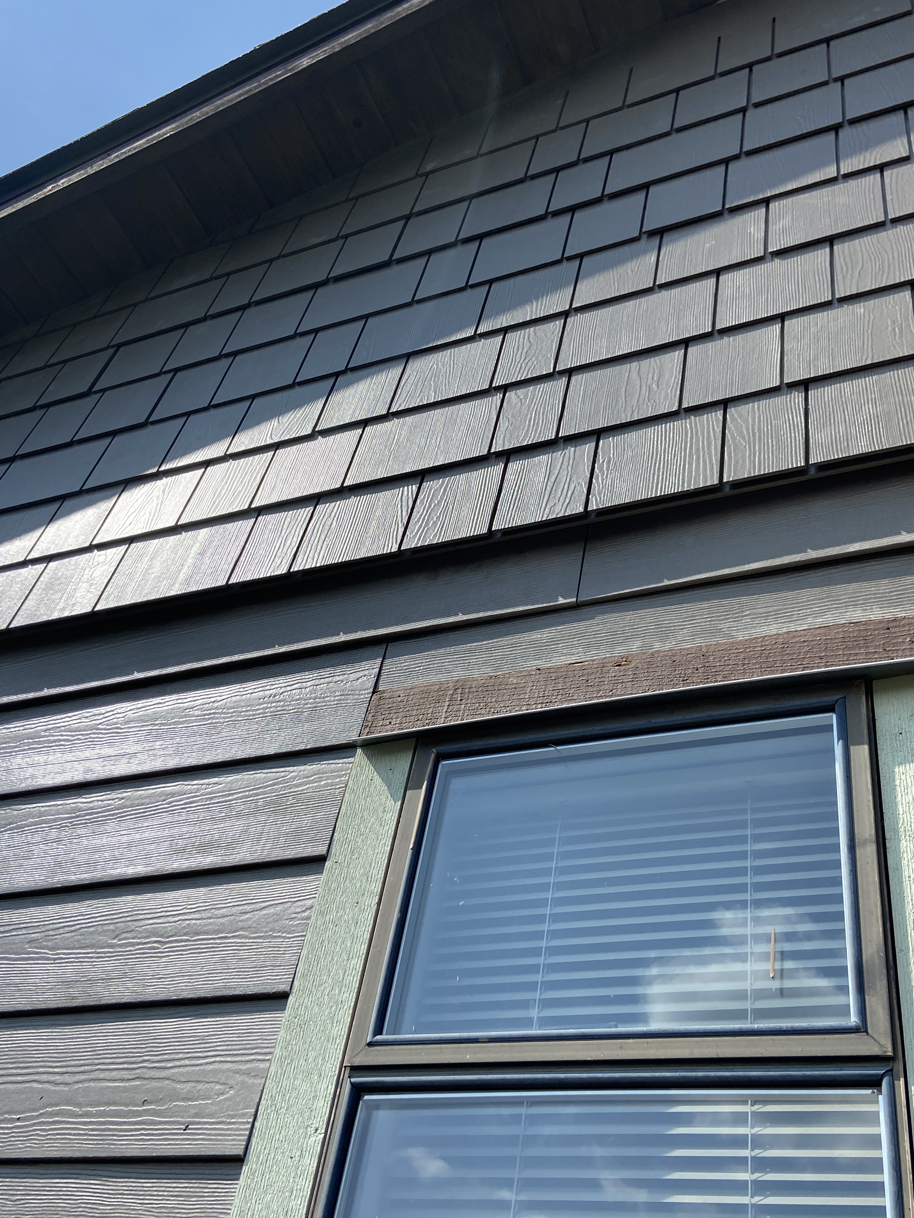 Primed fibre cement 6” reveal horizontal lap siding, fibre cement corners and trims, plus custom painting services. Old cedar siding demolition, Tyvek homewrap, rainscreen strappings, custom flashings.