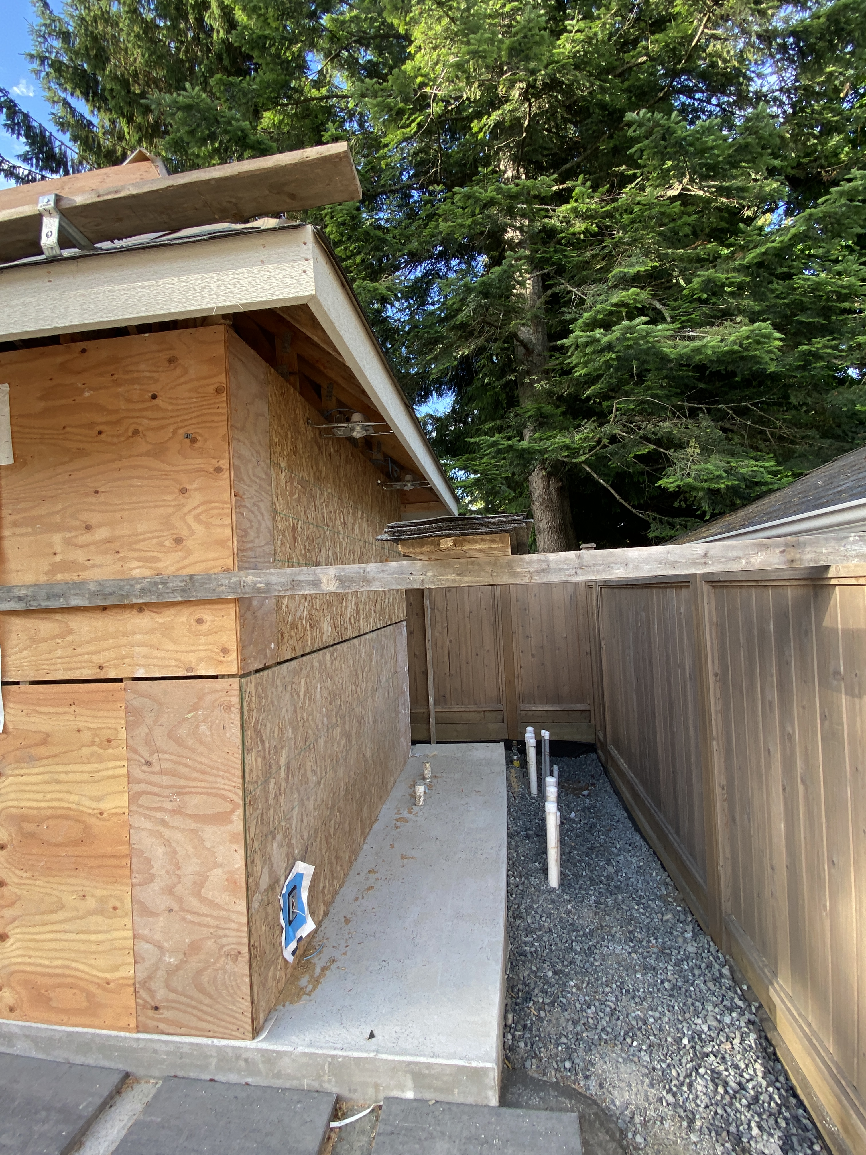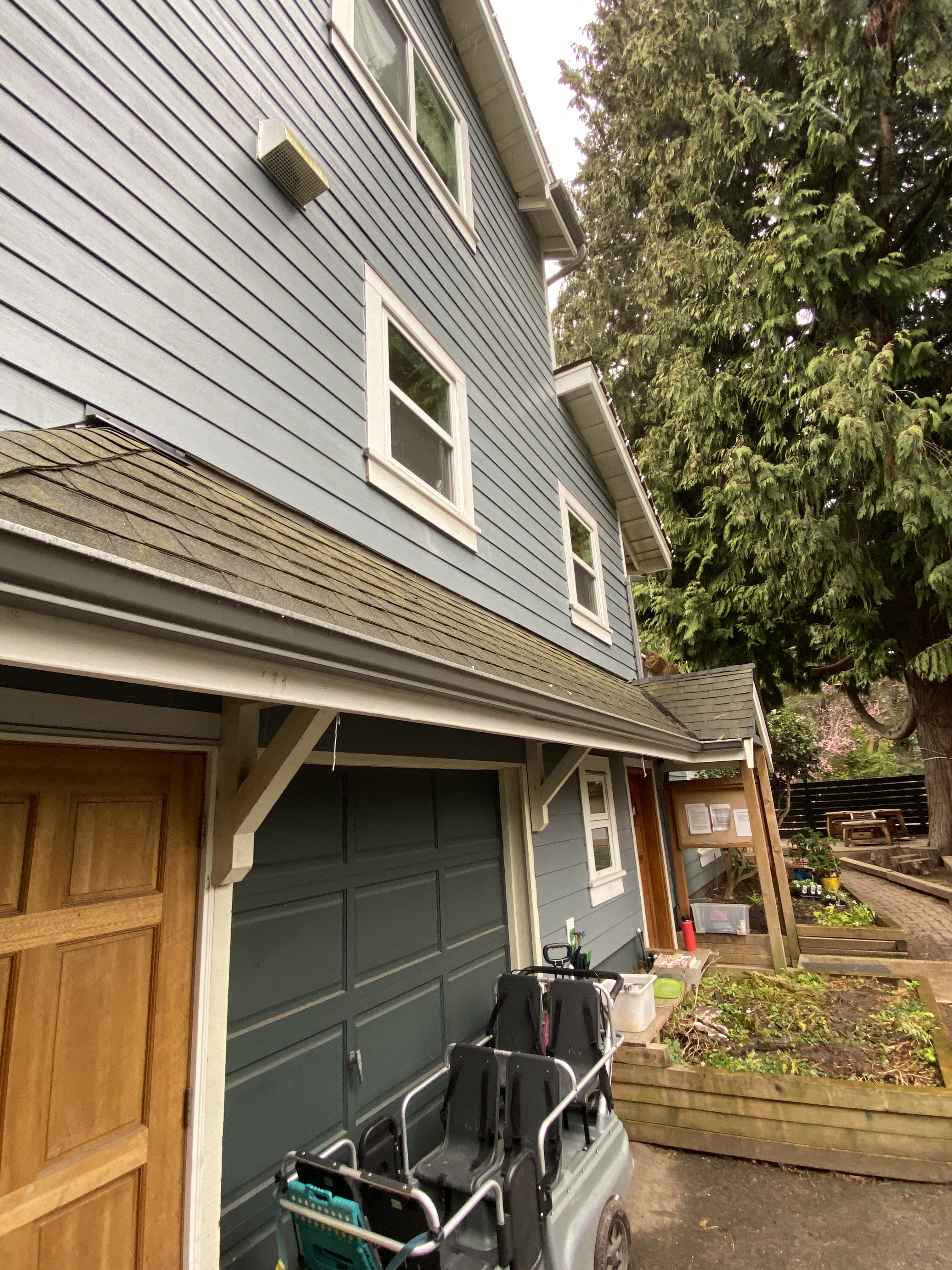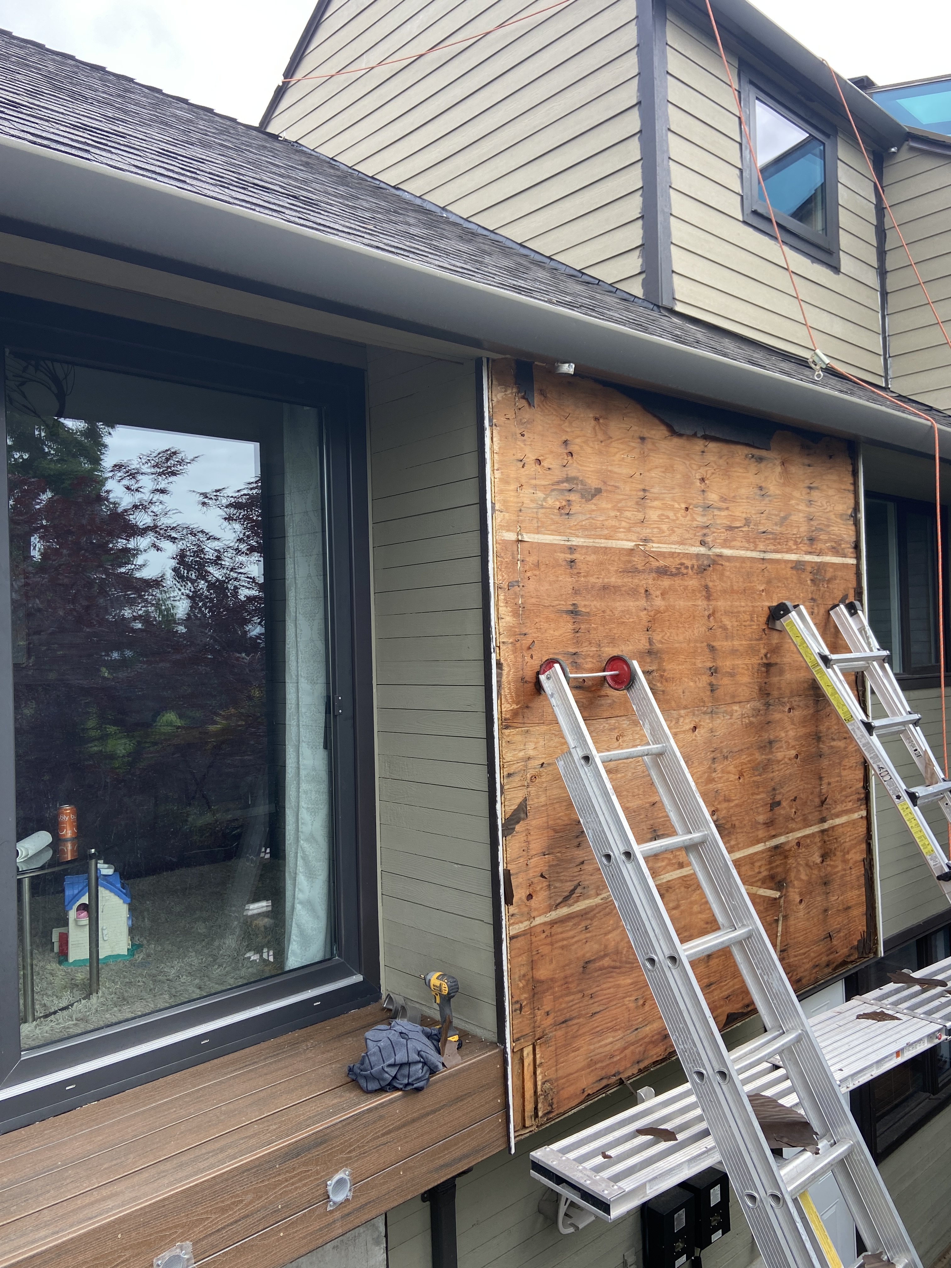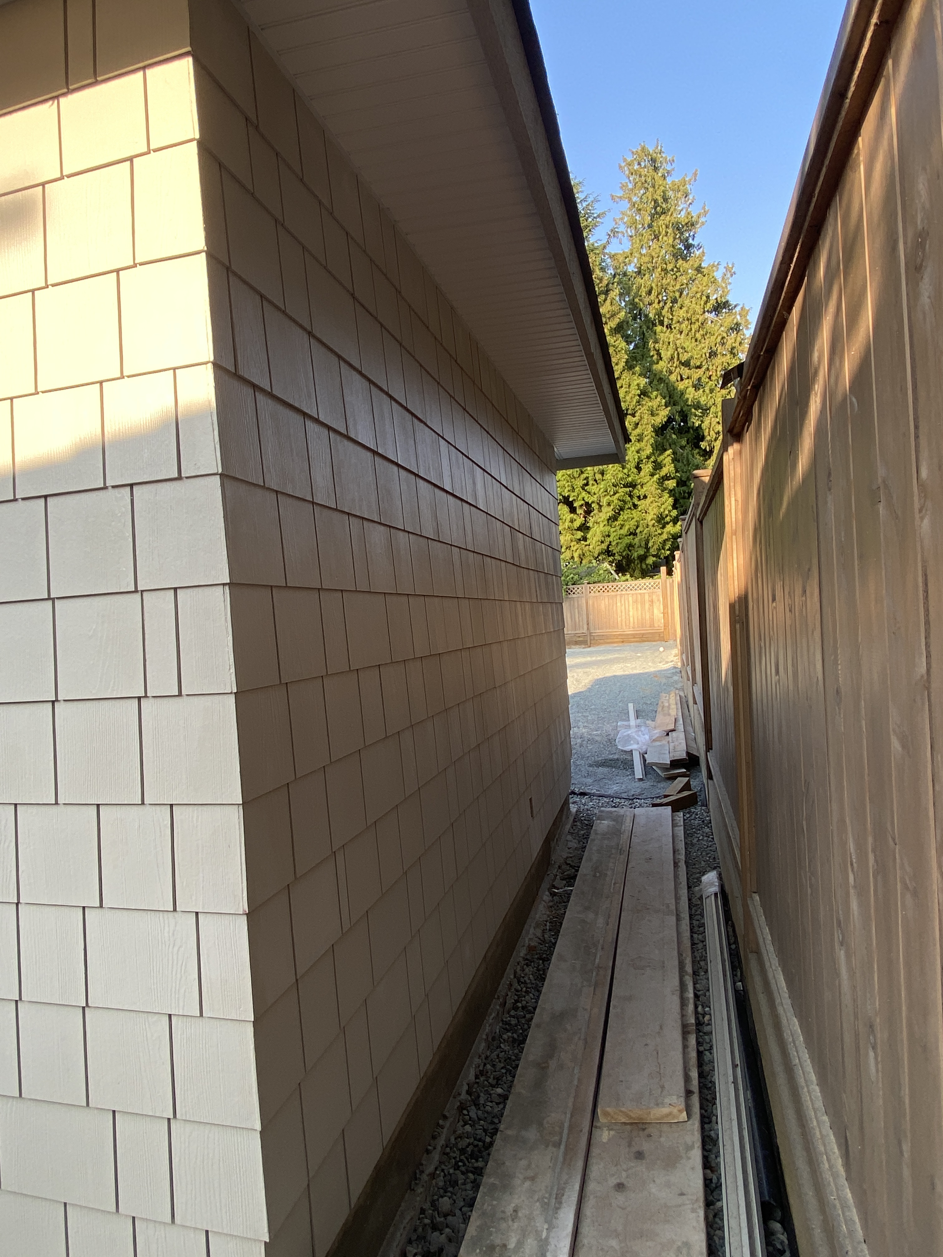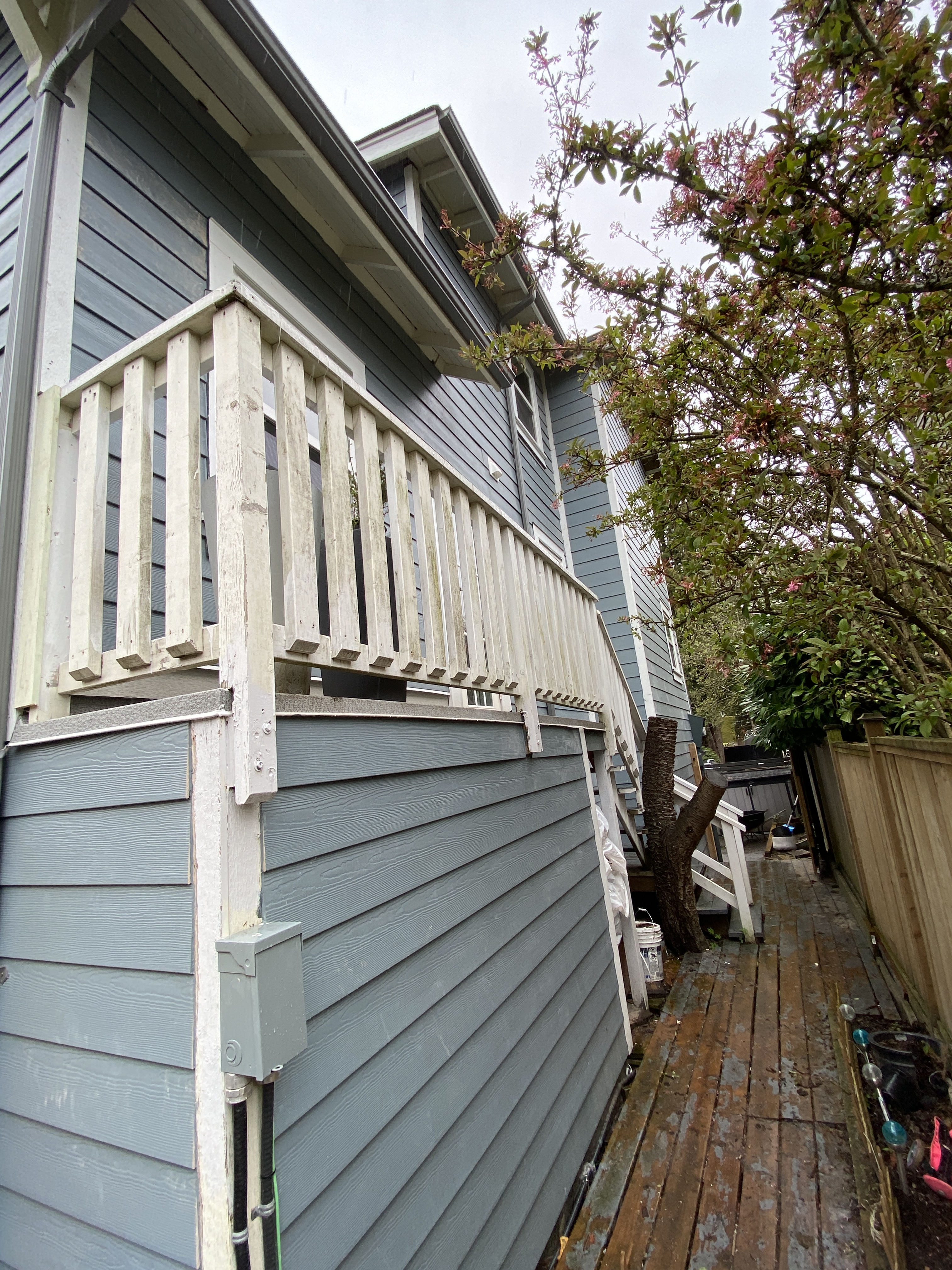 Primed fibre cement 6” reveal horizontal lap siding, fibre cement corners and trims, plus custom painting services. Old cedar siding demolition, Tyvek homewrap, rainscreen strappings, custom flashings.