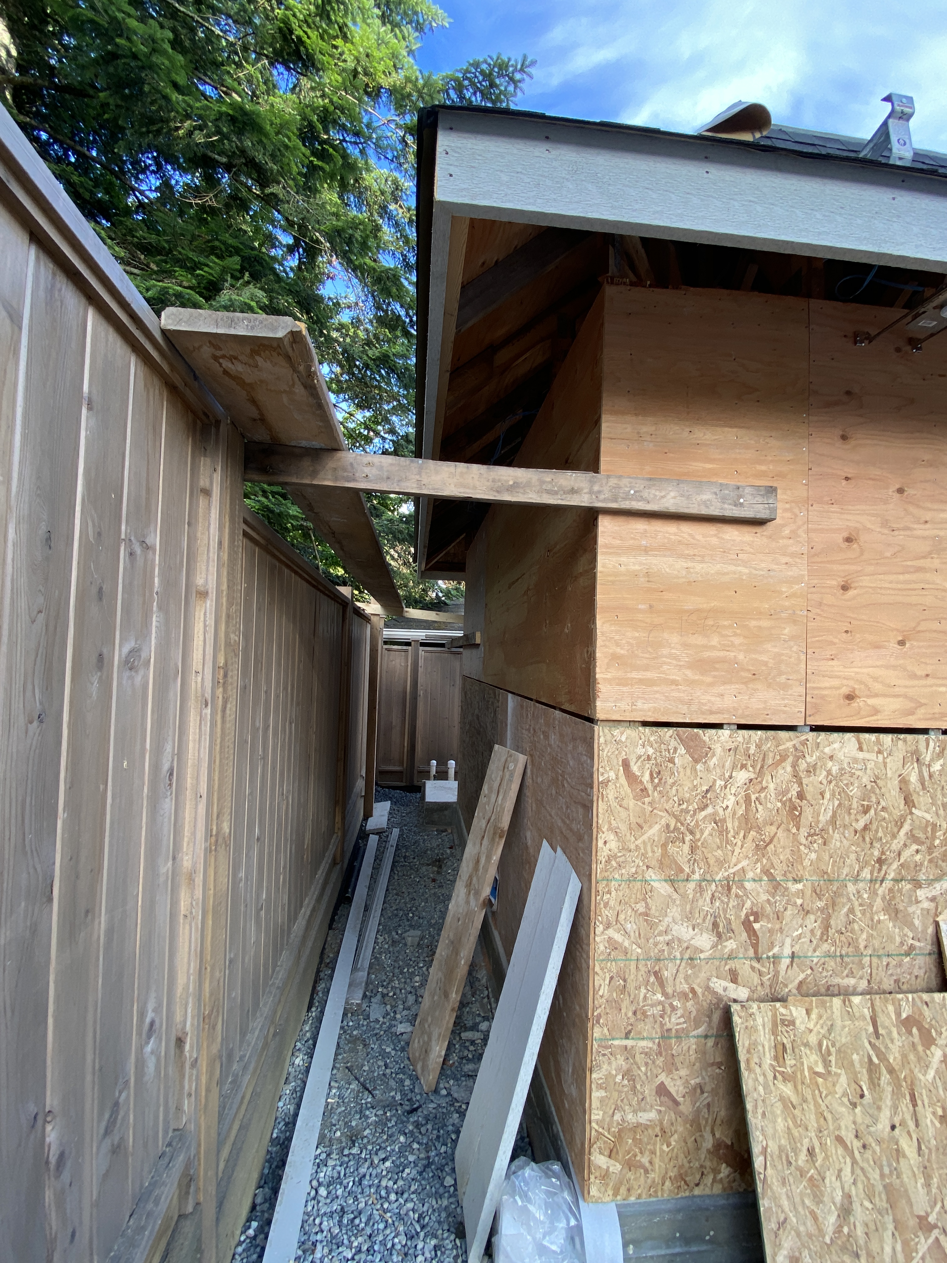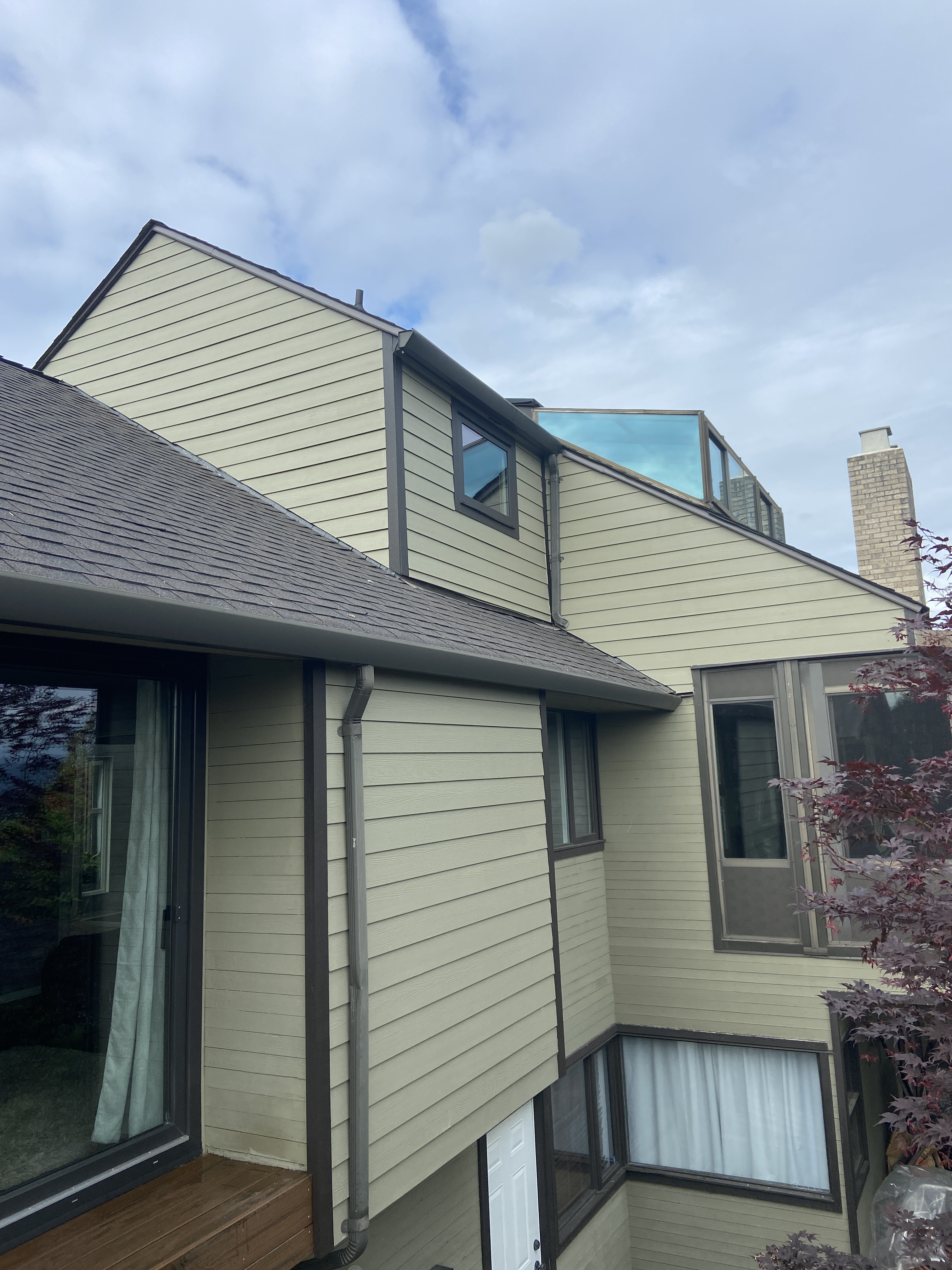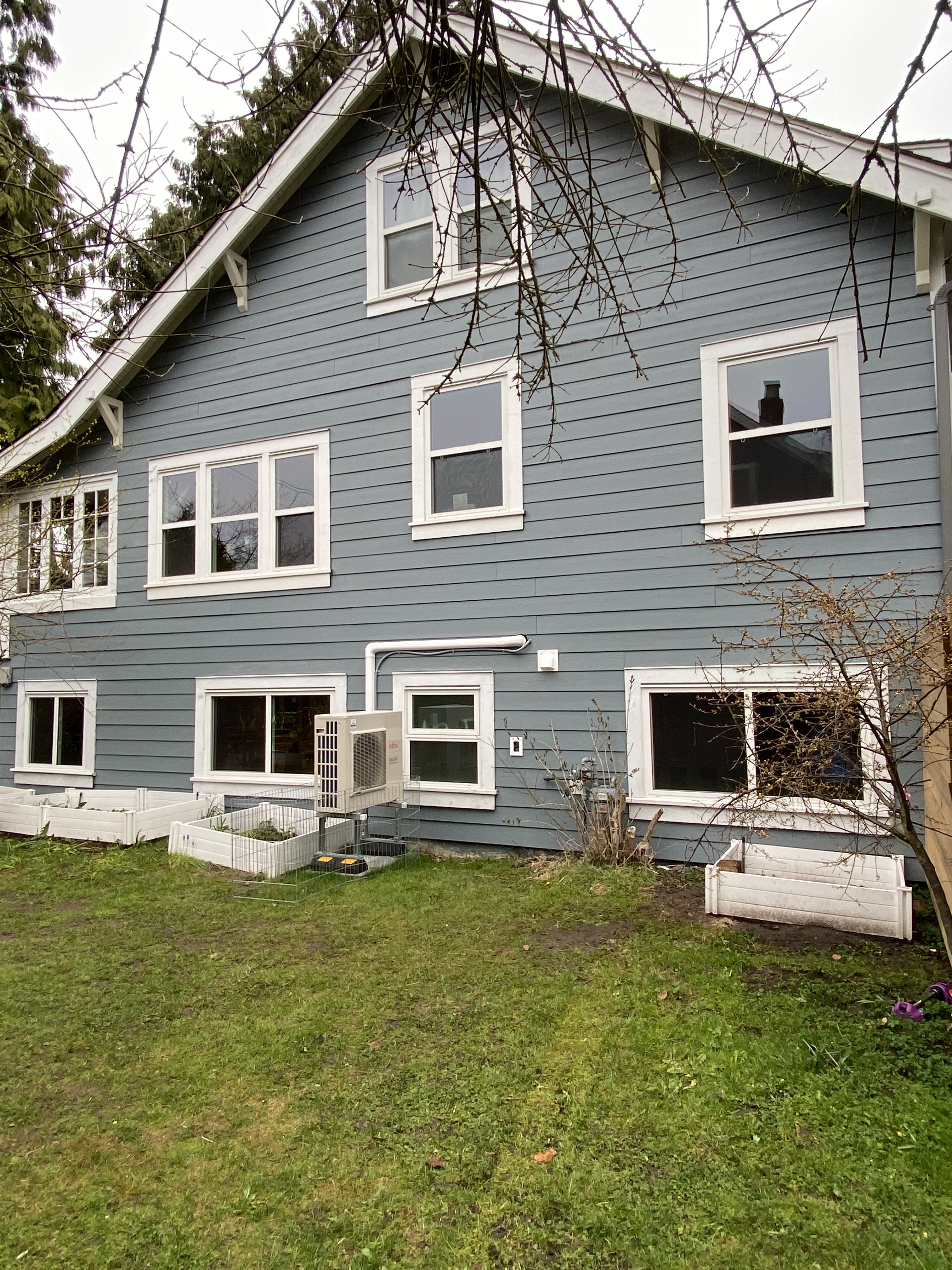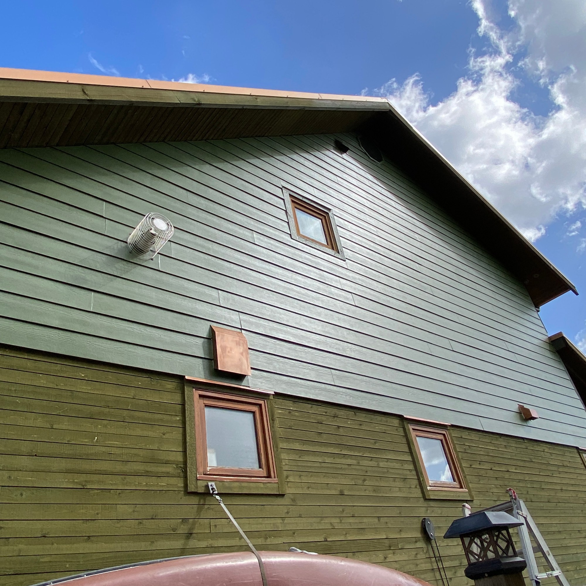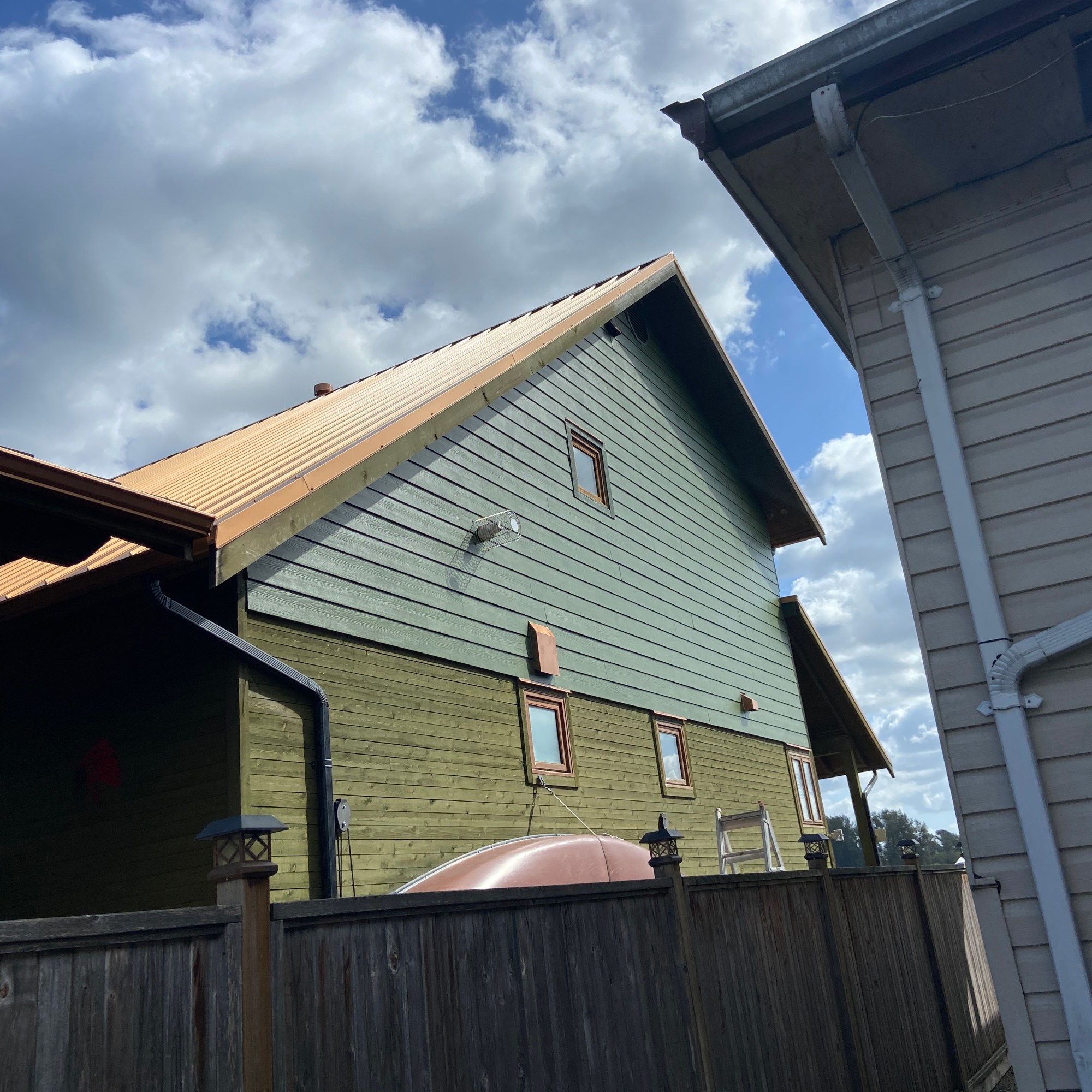 Primed fibre cement 6” reveal horizontal lap siding, fibre cement corners and trims, plus custom painting services. Old cedar siding demolition, Tyvek homewrap, rainscreen strappings, custom flashings.