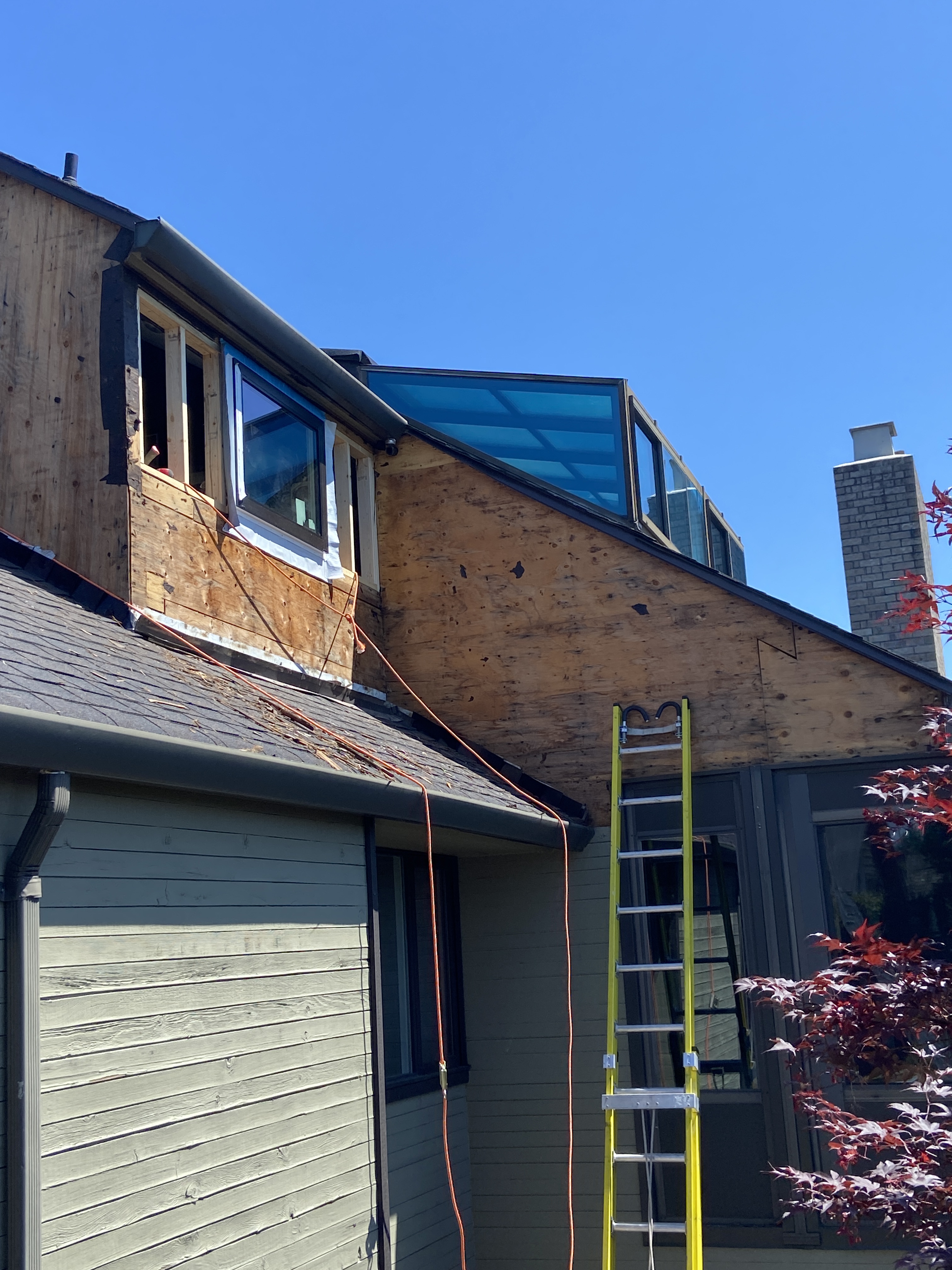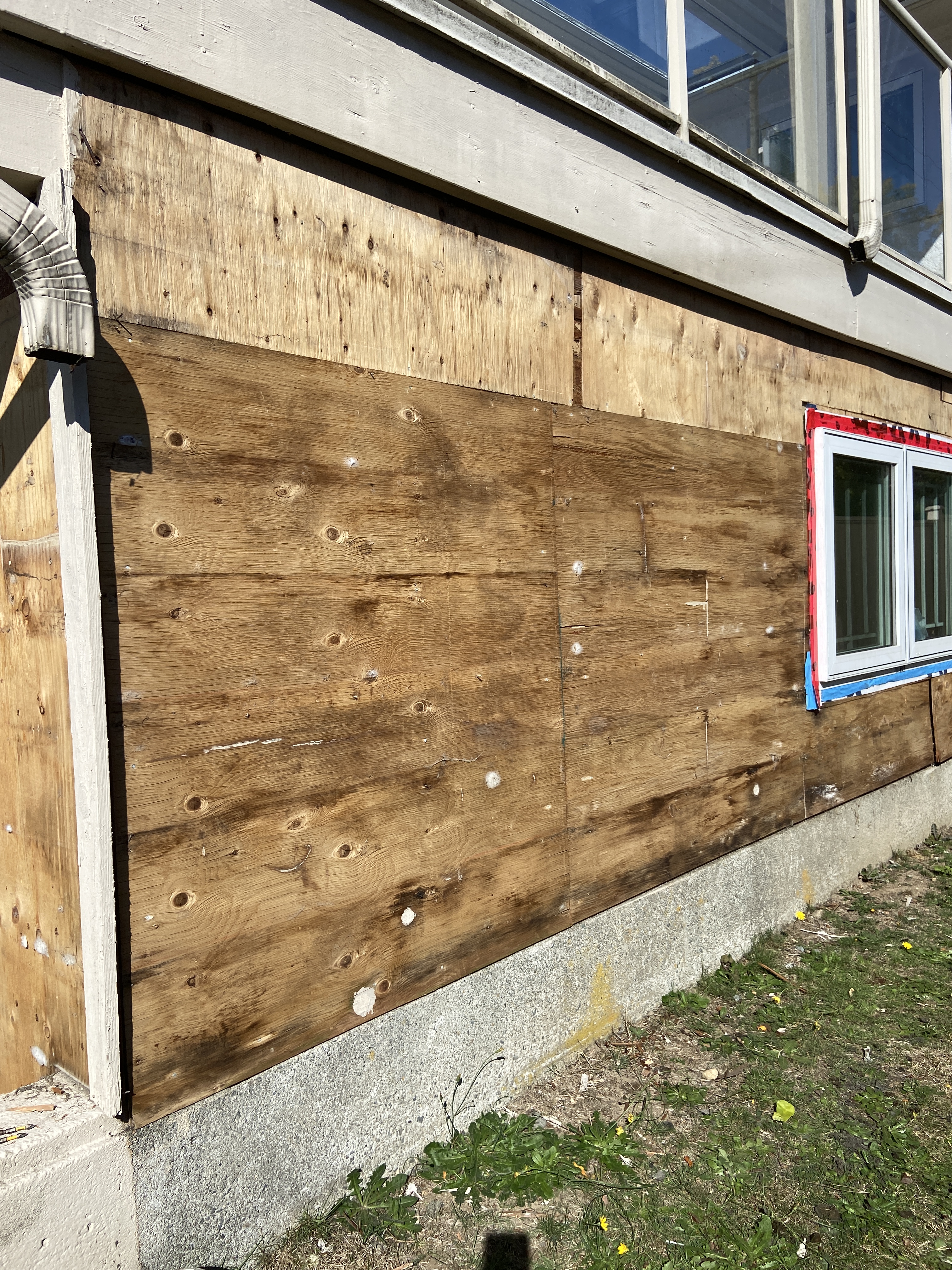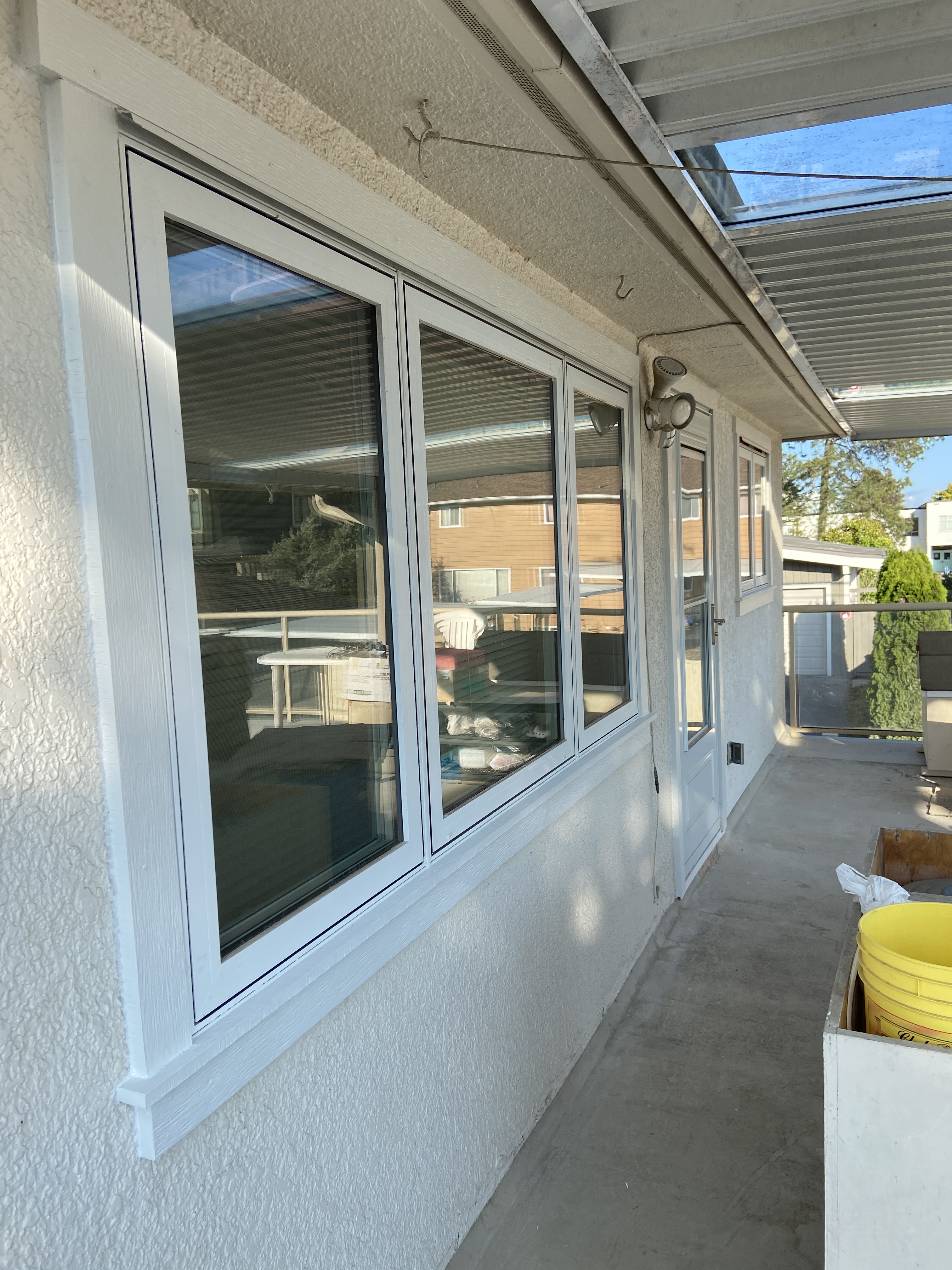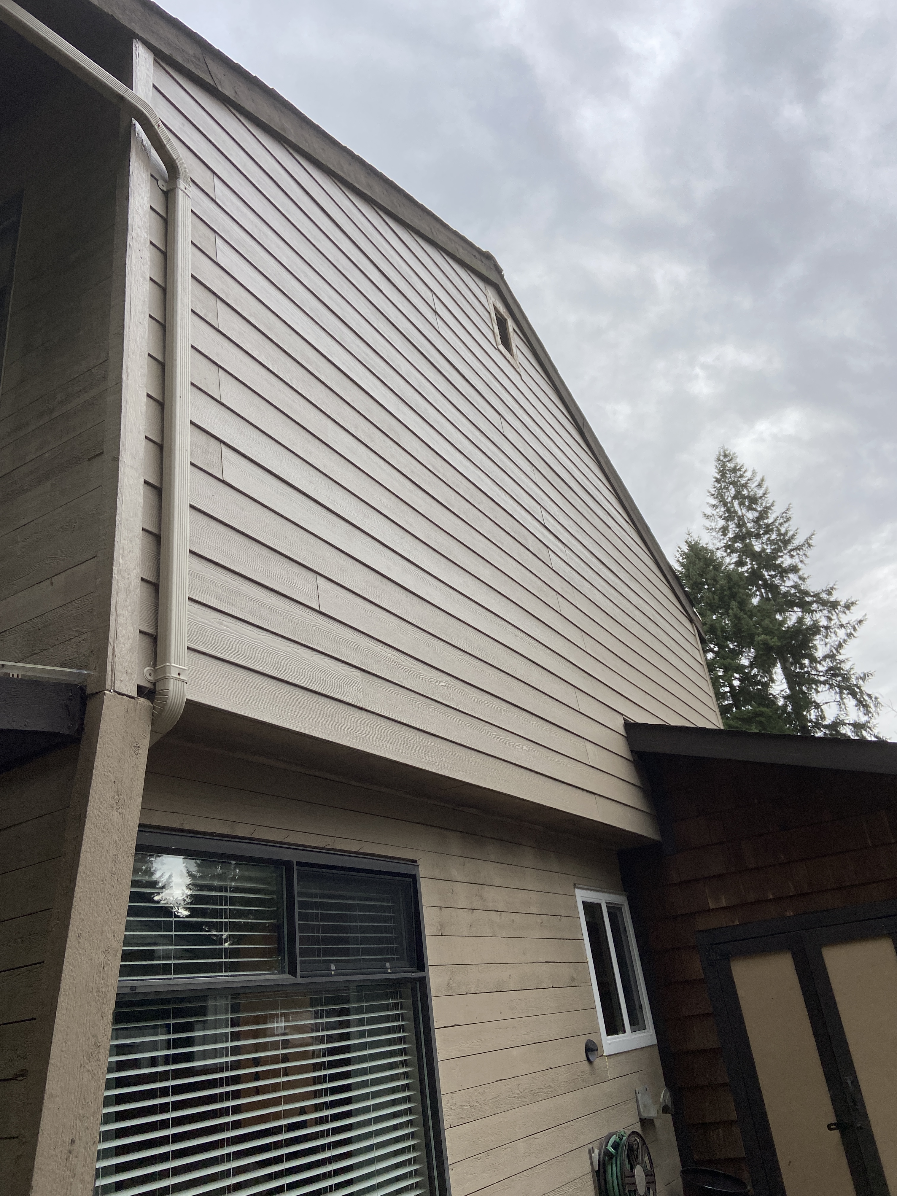 Primed fibre cement 6” reveal horizontal lap siding, fibre cement corners and trims, plus custom painting services. Old cedar siding demolition, Tyvek homewrap, rainscreen strappings, custom flashings.