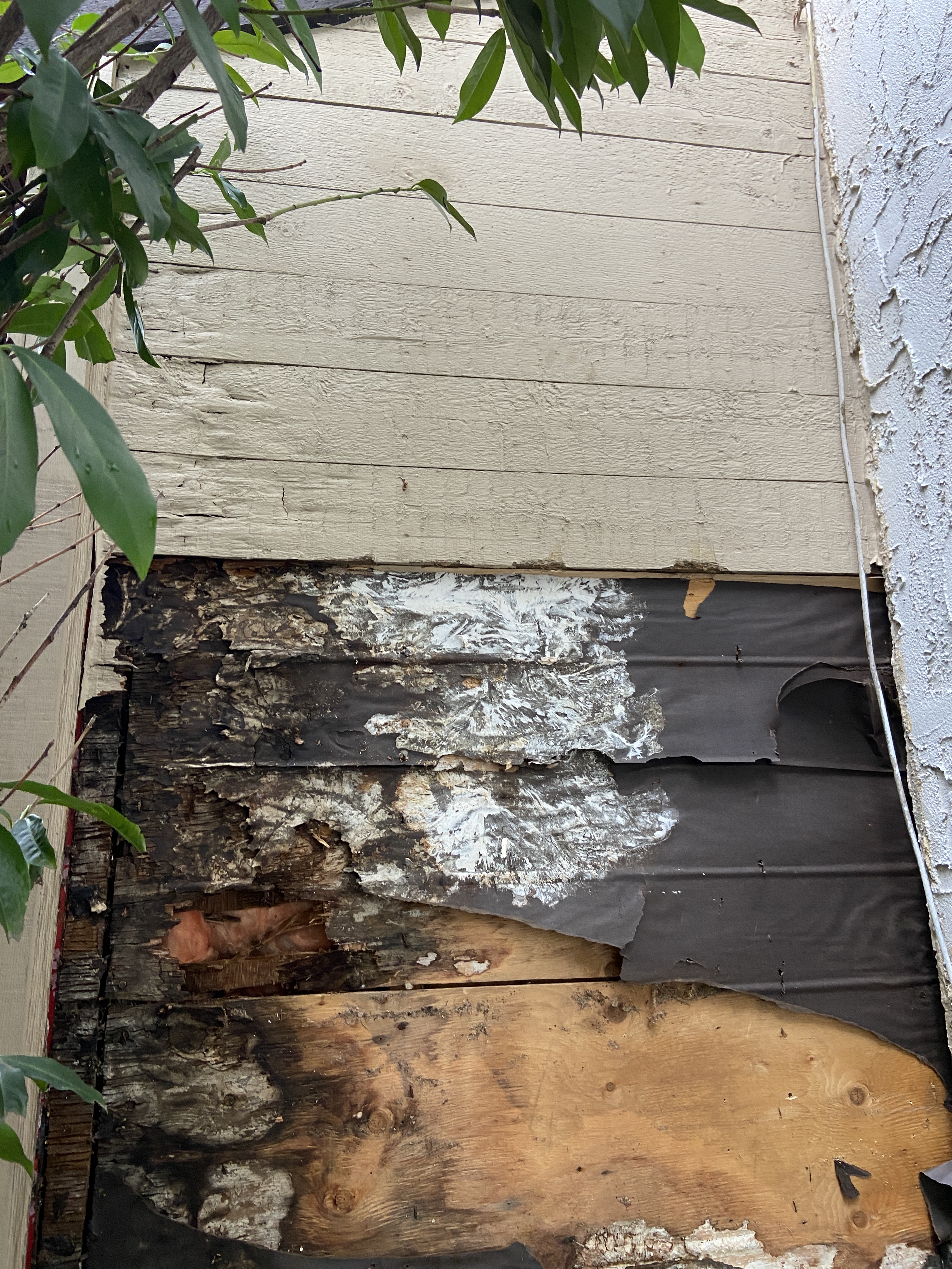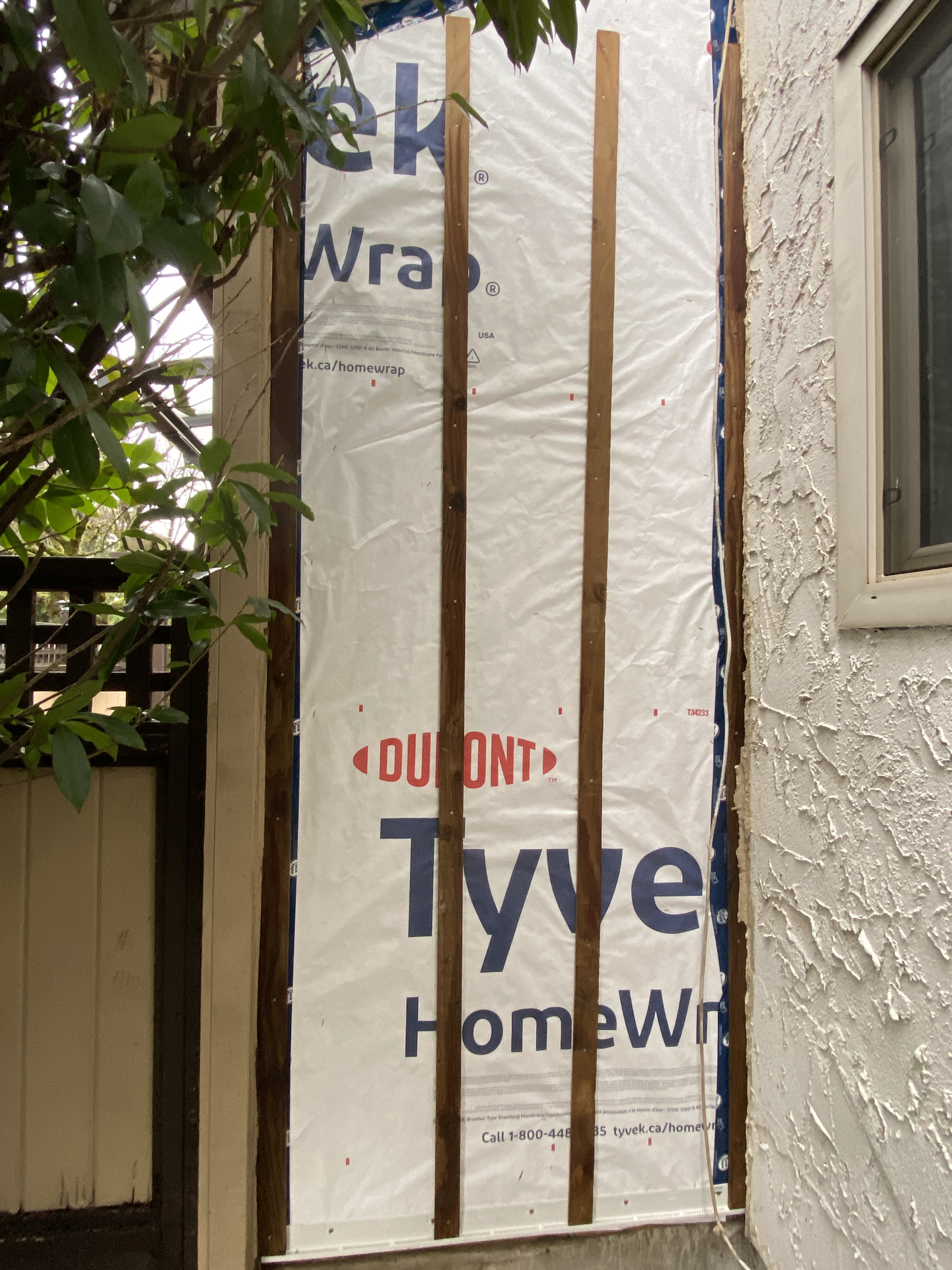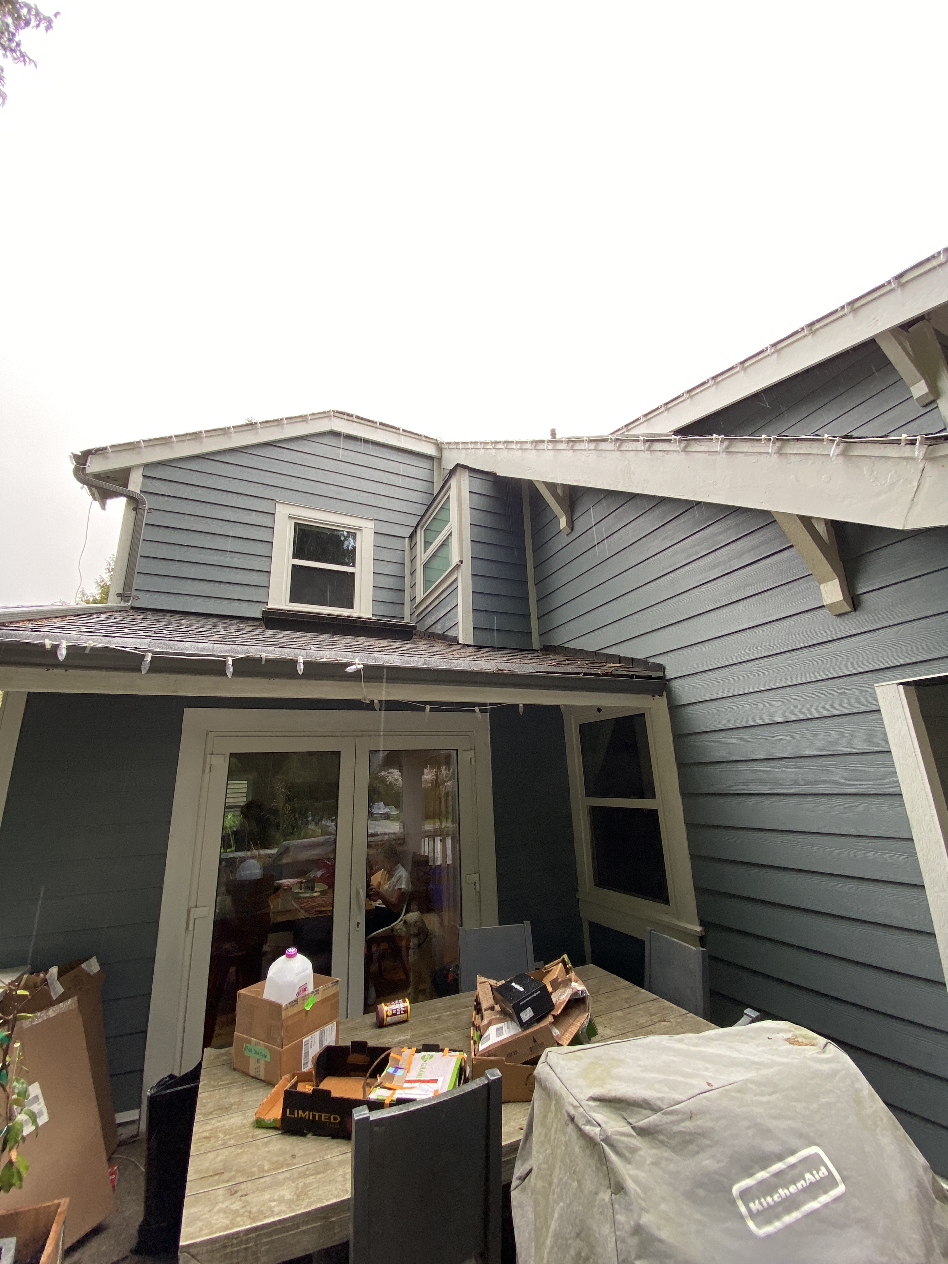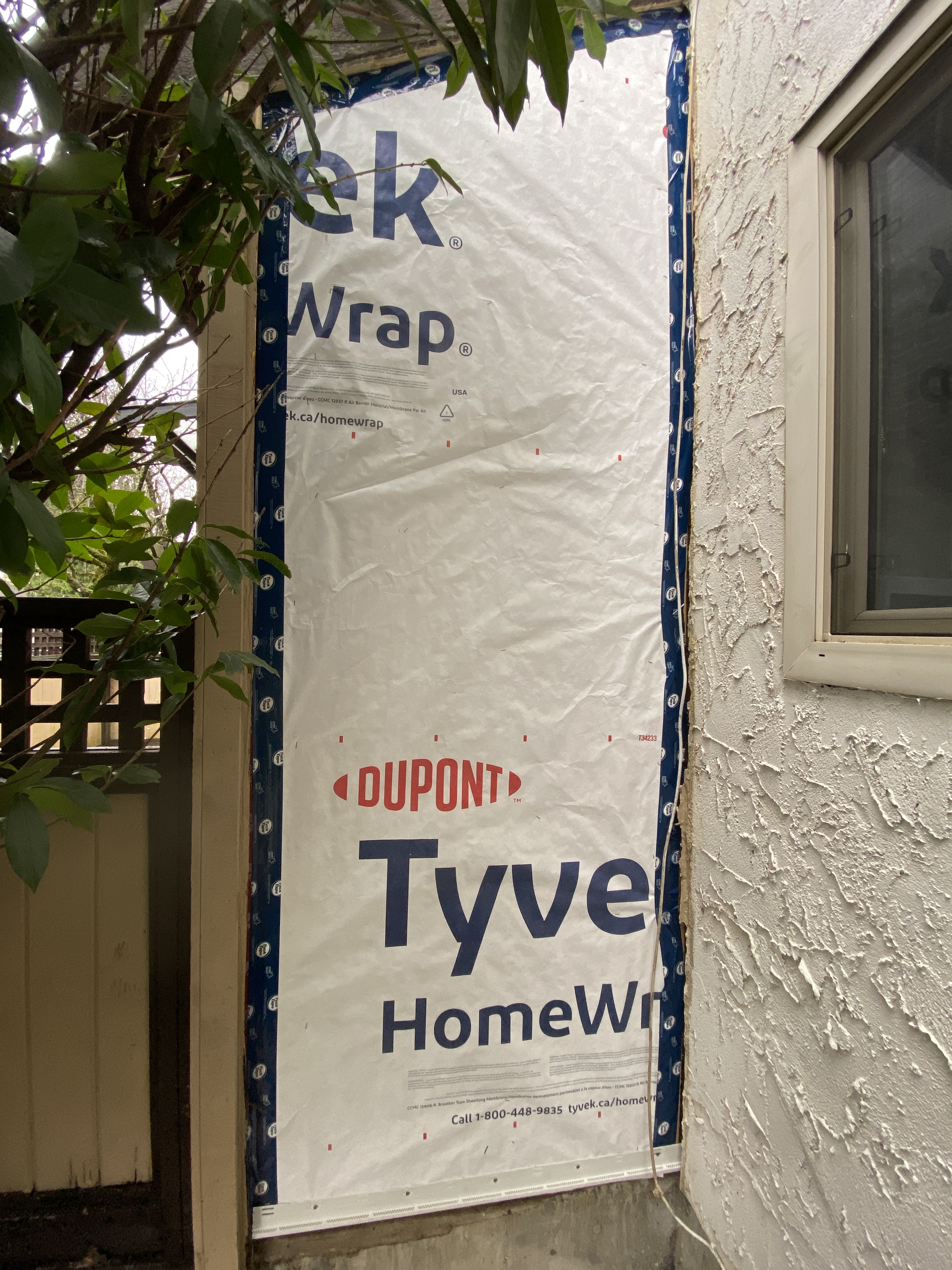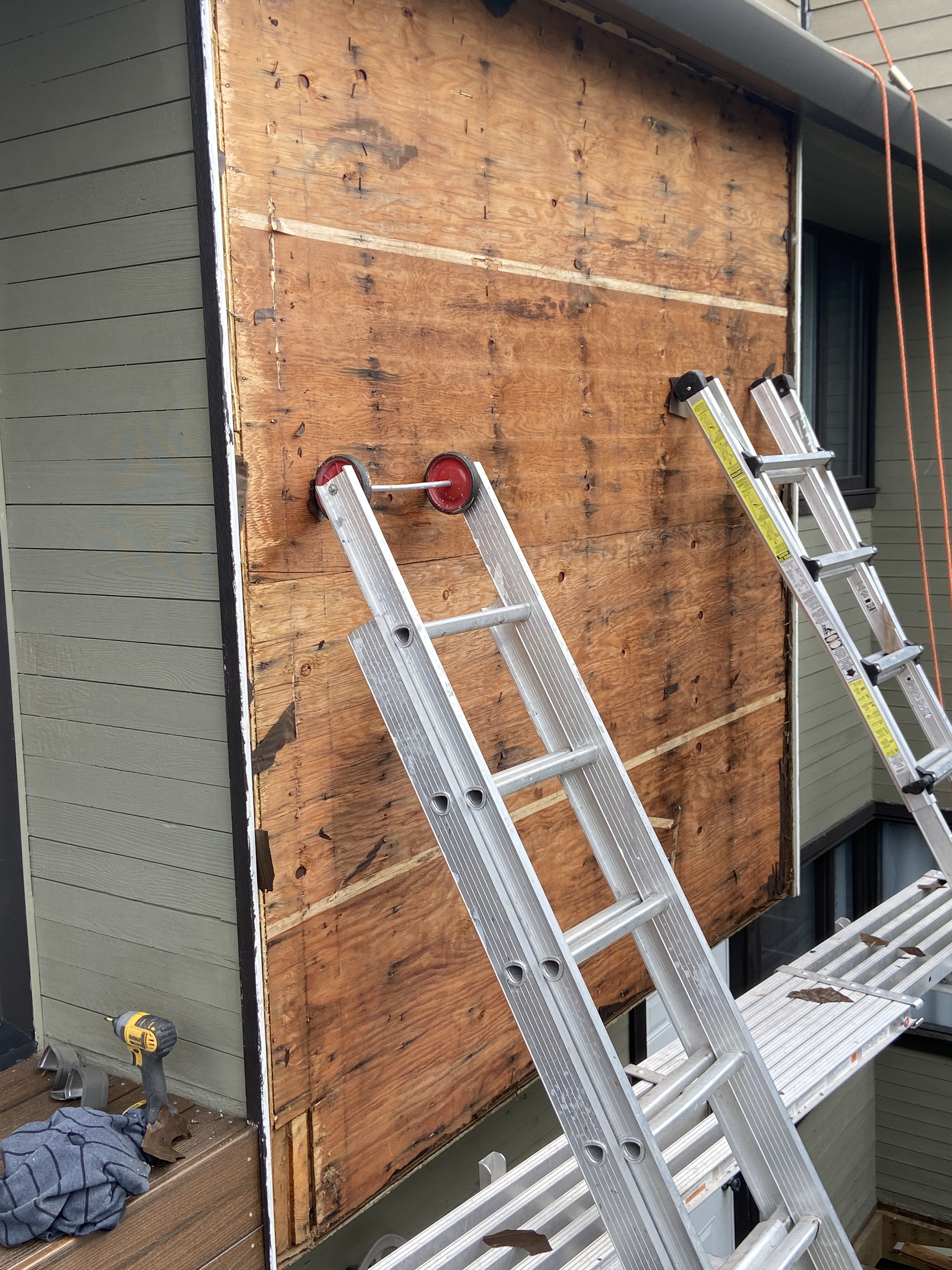 Primed fibre cement 6” reveal horizontal lap siding, fibre cement corners and trims, plus custom painting services. Old cedar siding demolition, Tyvek homewrap, rainscreen strappings, custom flashings.