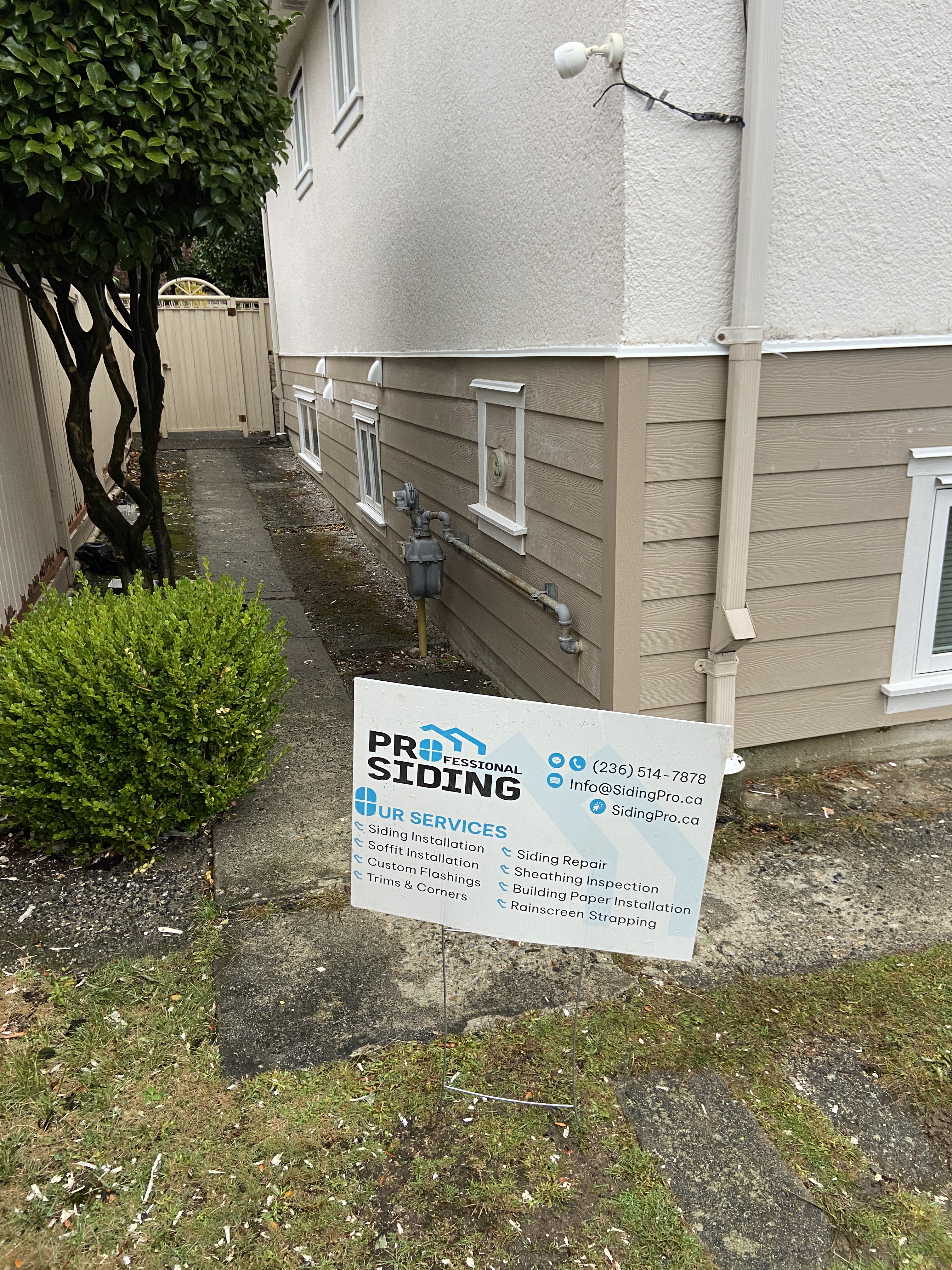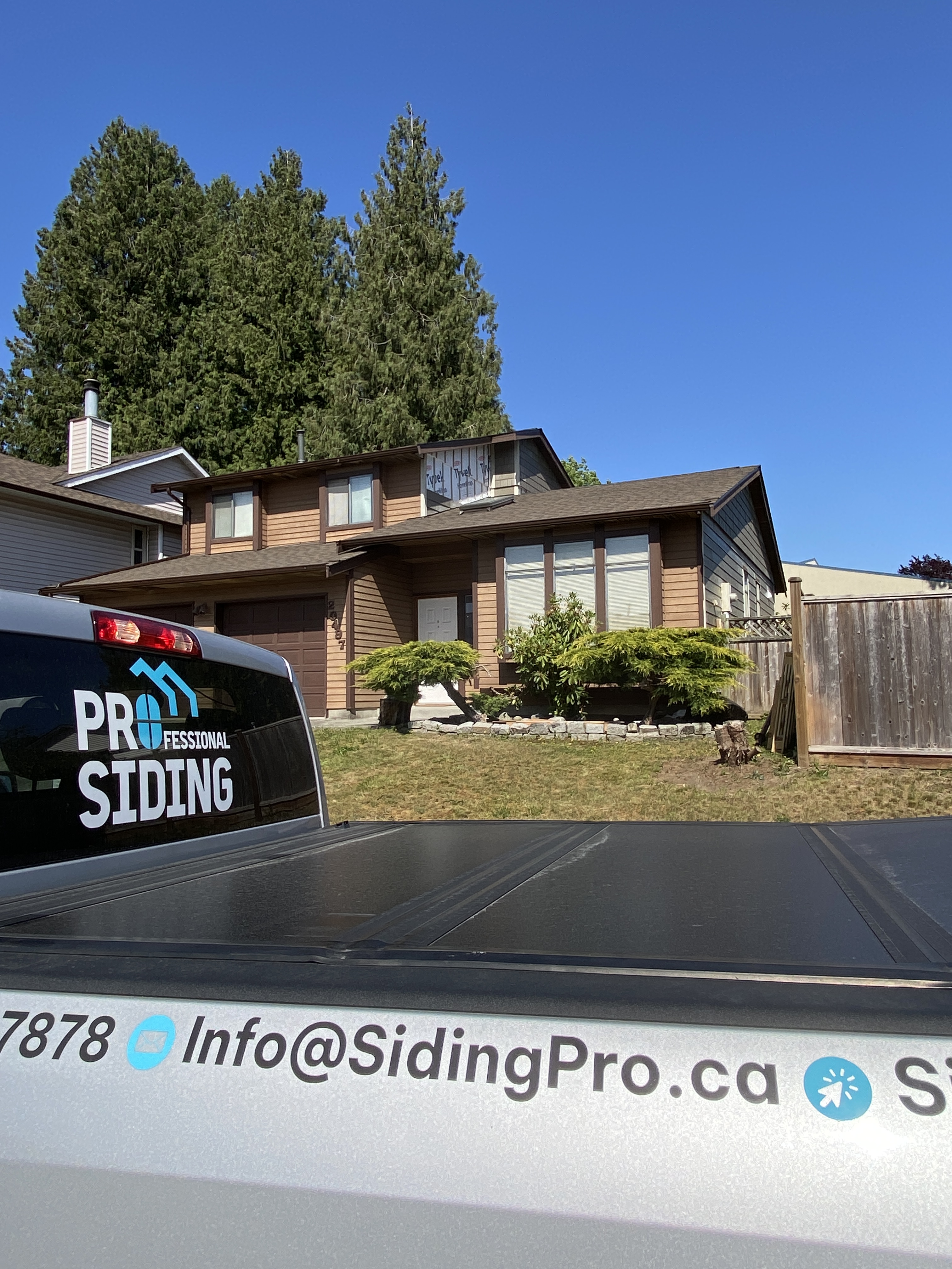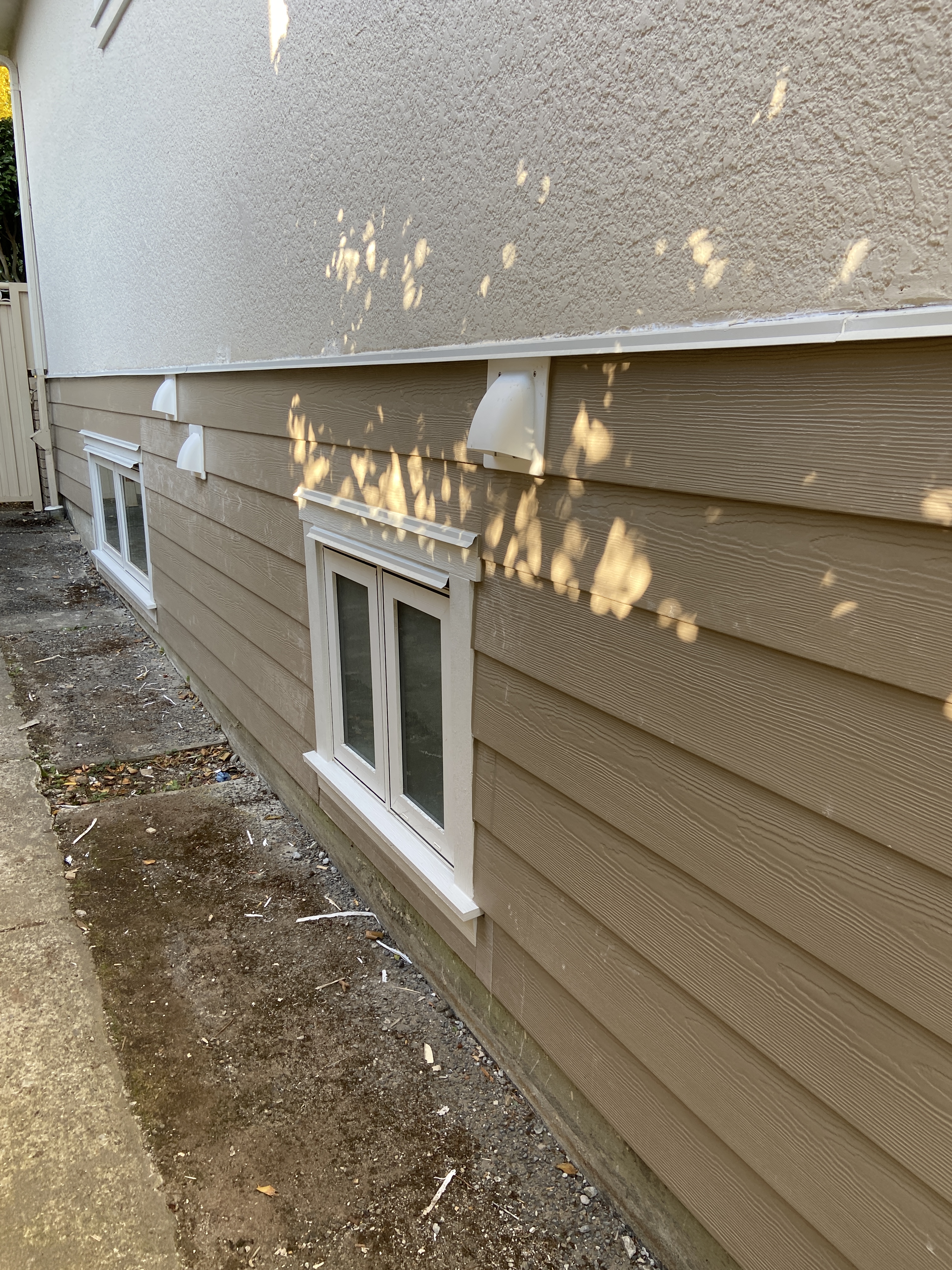 Professionally executed fibre cement replacing old rotten cedar siding project. Hardie horizontal lap 7” reveal in Khaki Brown, cedarmill finish. Custom metal flashings and decorative trims for doors, garage opening, and windows with sloped sill. Metal flashings for existing stucco and new Hardie siding transition. Rainscreen strappings, bug screens, Tyvek homewrap, vented starter strips, and new mounting blocks. Clean up and waste removal included.