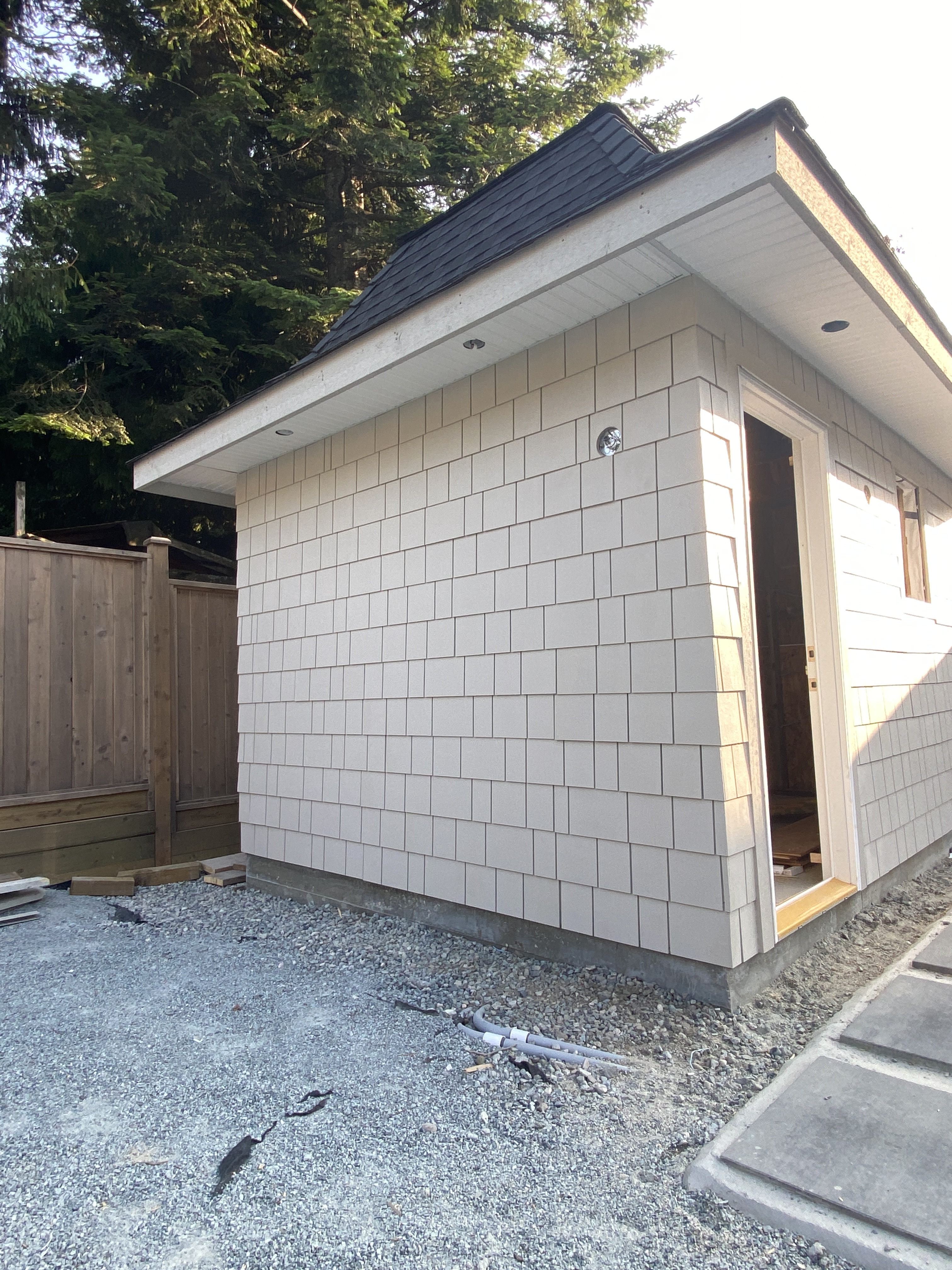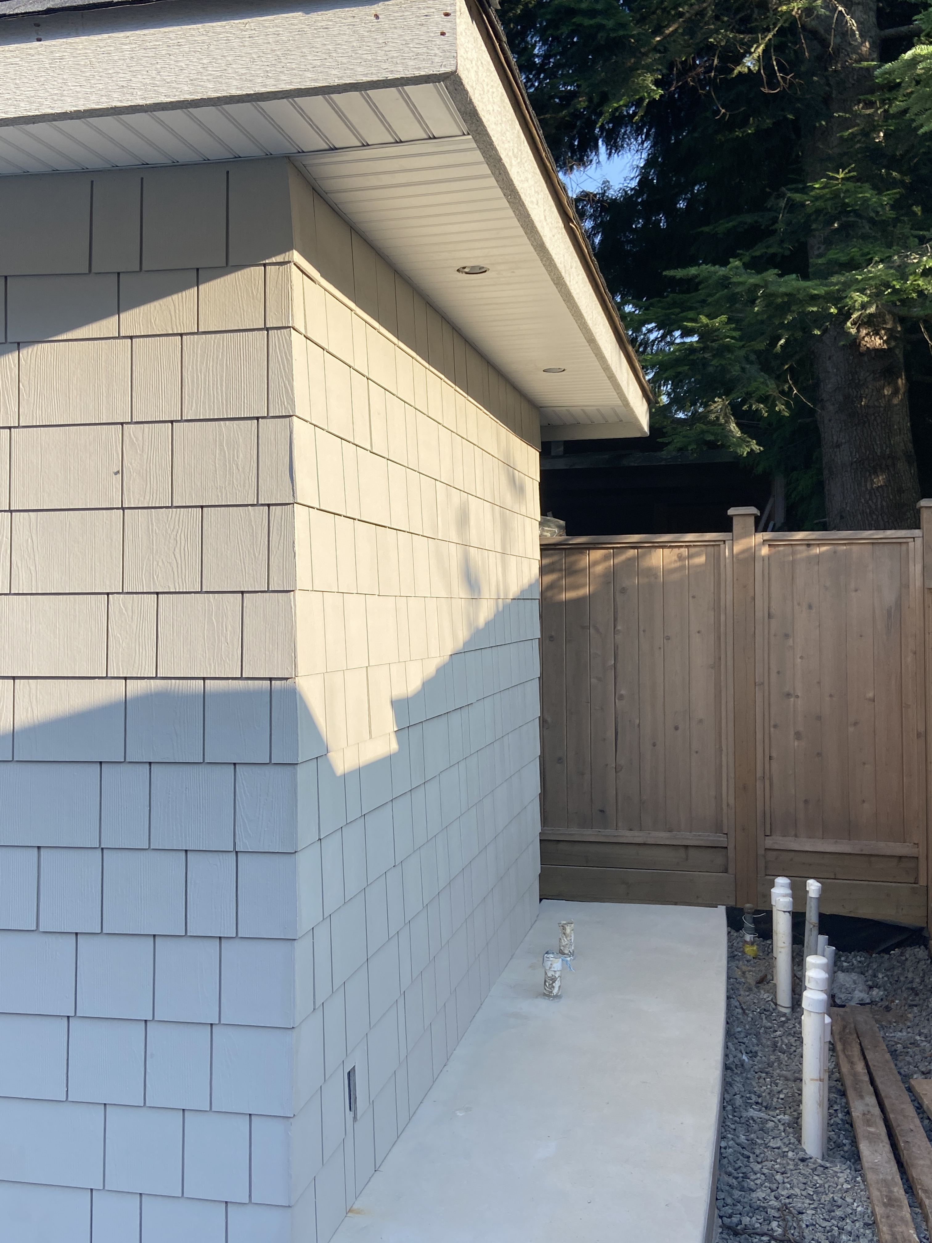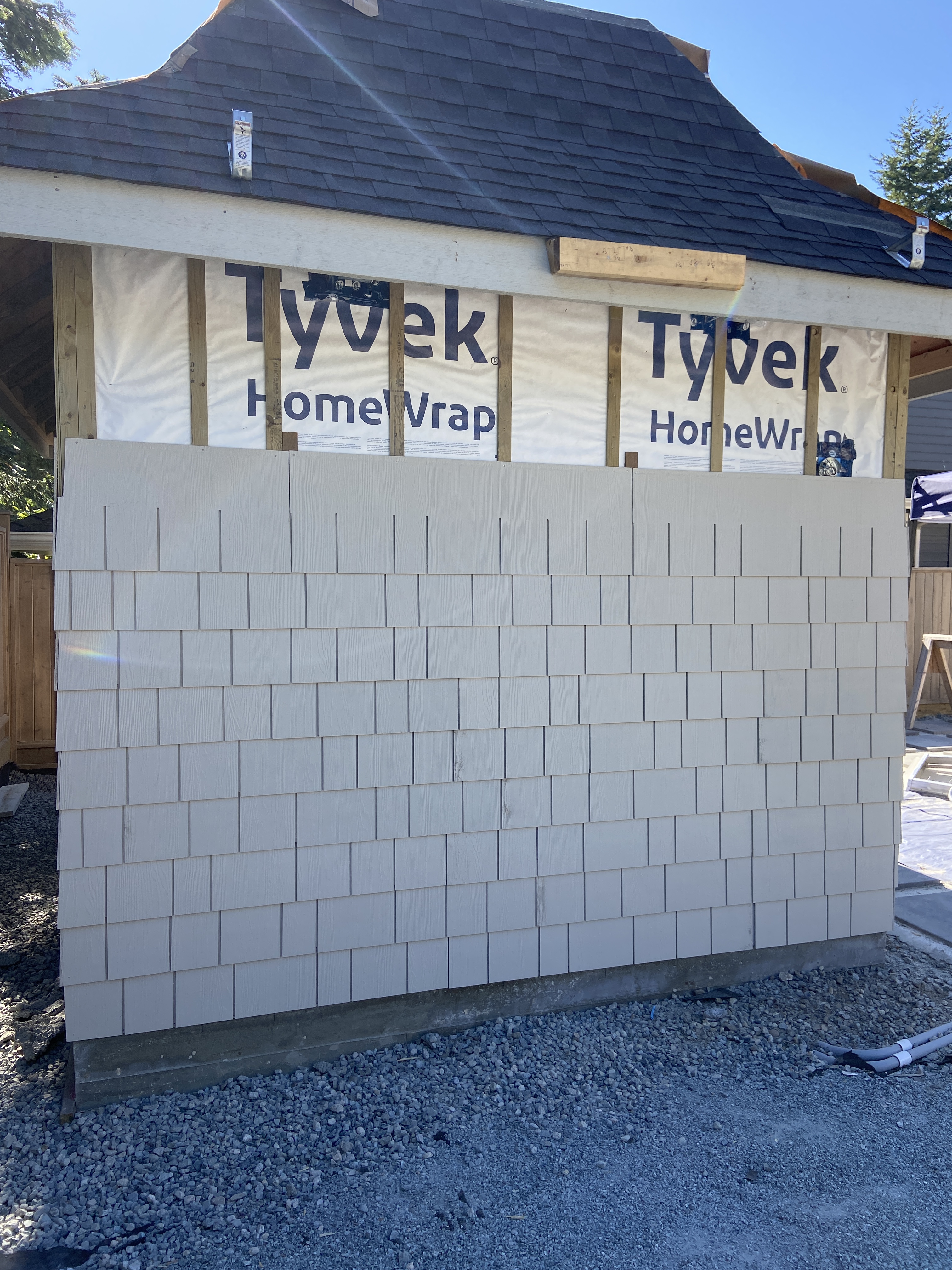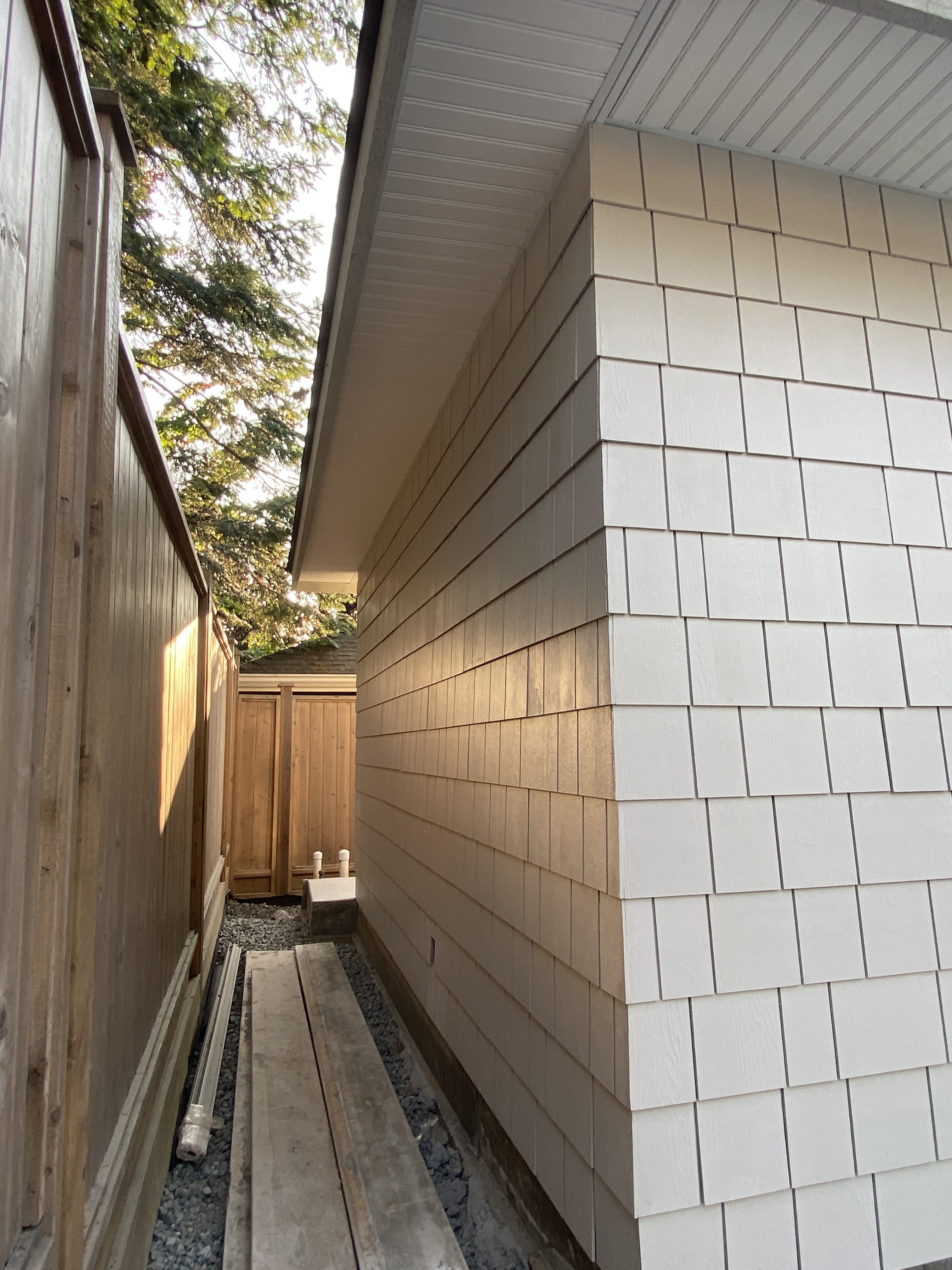 Hardie fibre cement cedarmill shingles 7” reveal, laced corners, siding in factory painted Cobble Stone colour. Fibre cement trims around door and window. Vented beaded vinyl white soffits. Rainscreen strapping, Tyvek homewrap. Vented starter strips. Door and window installations.