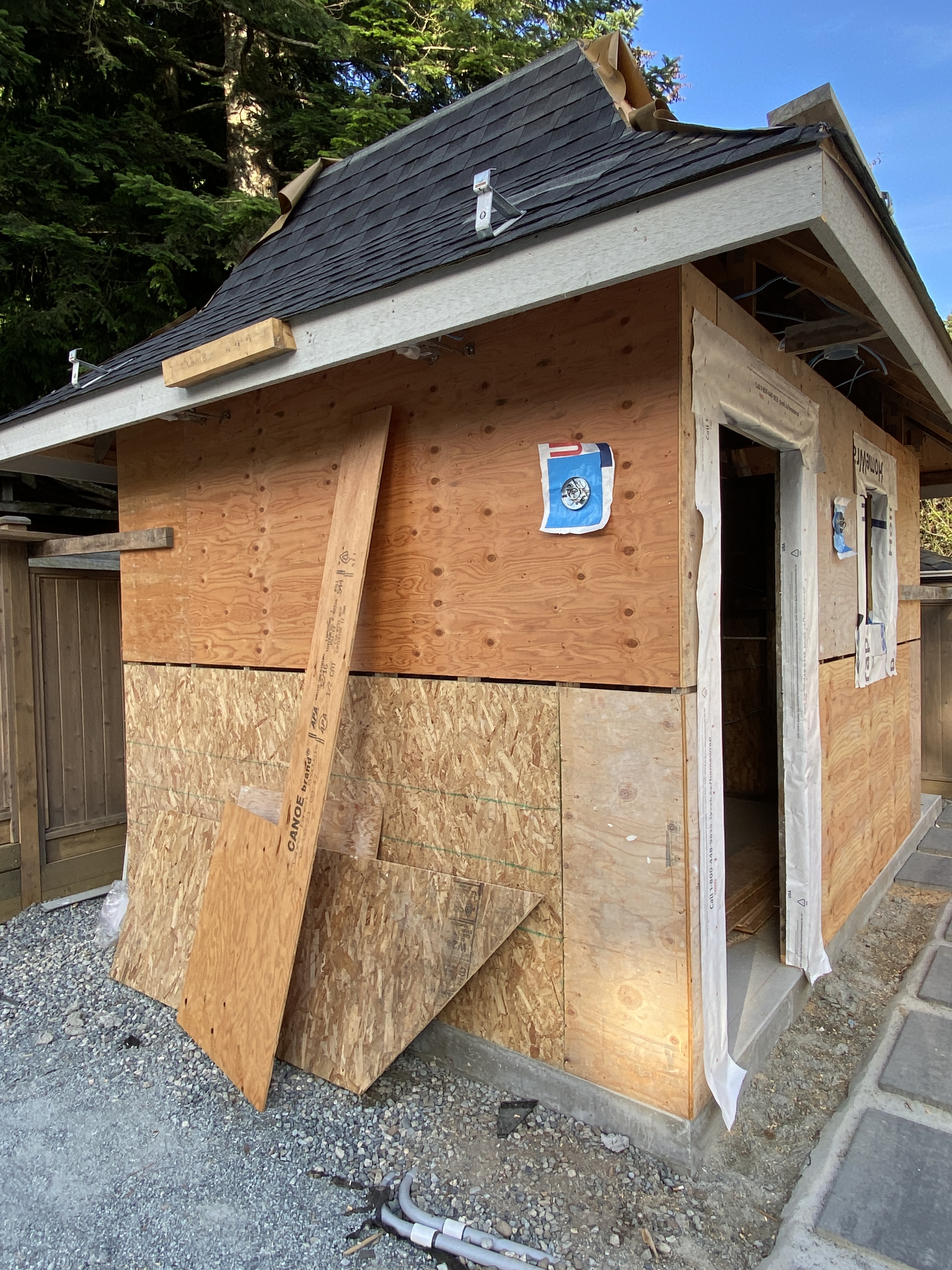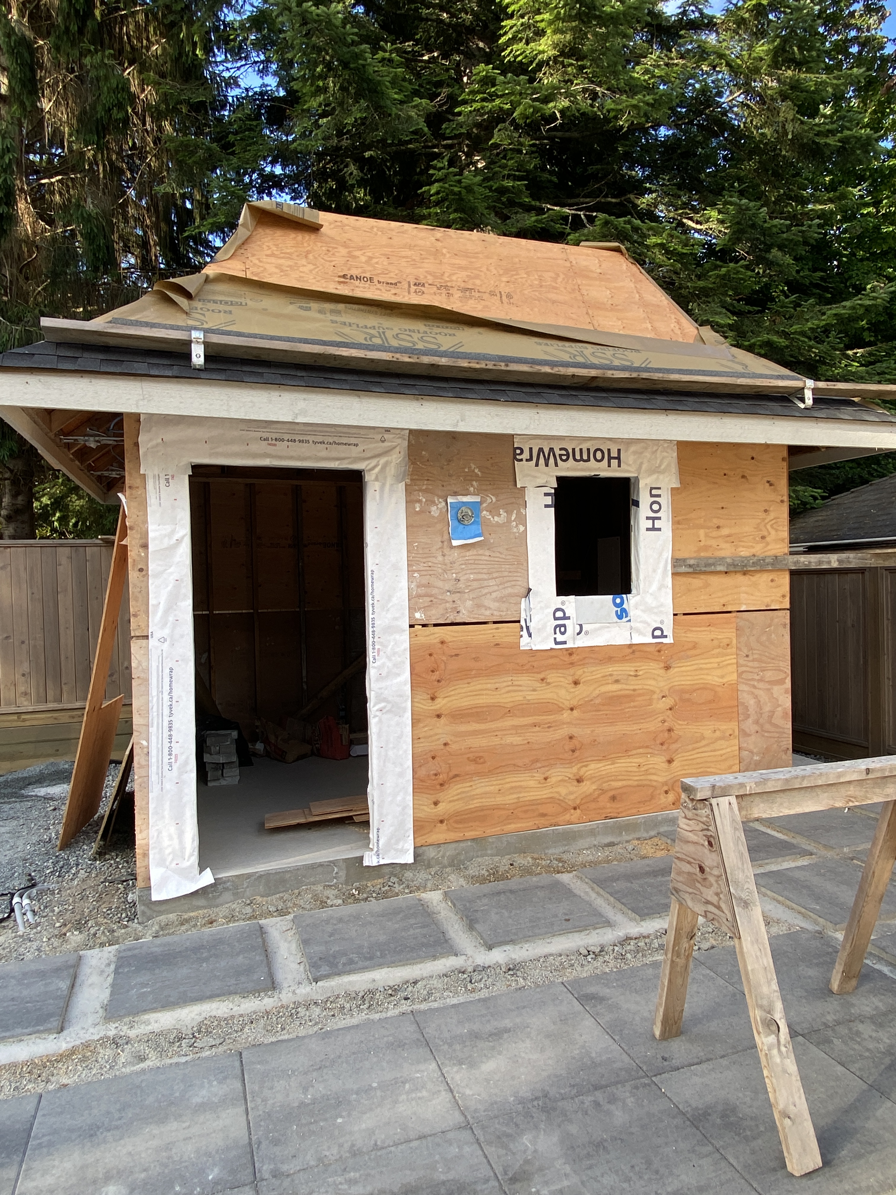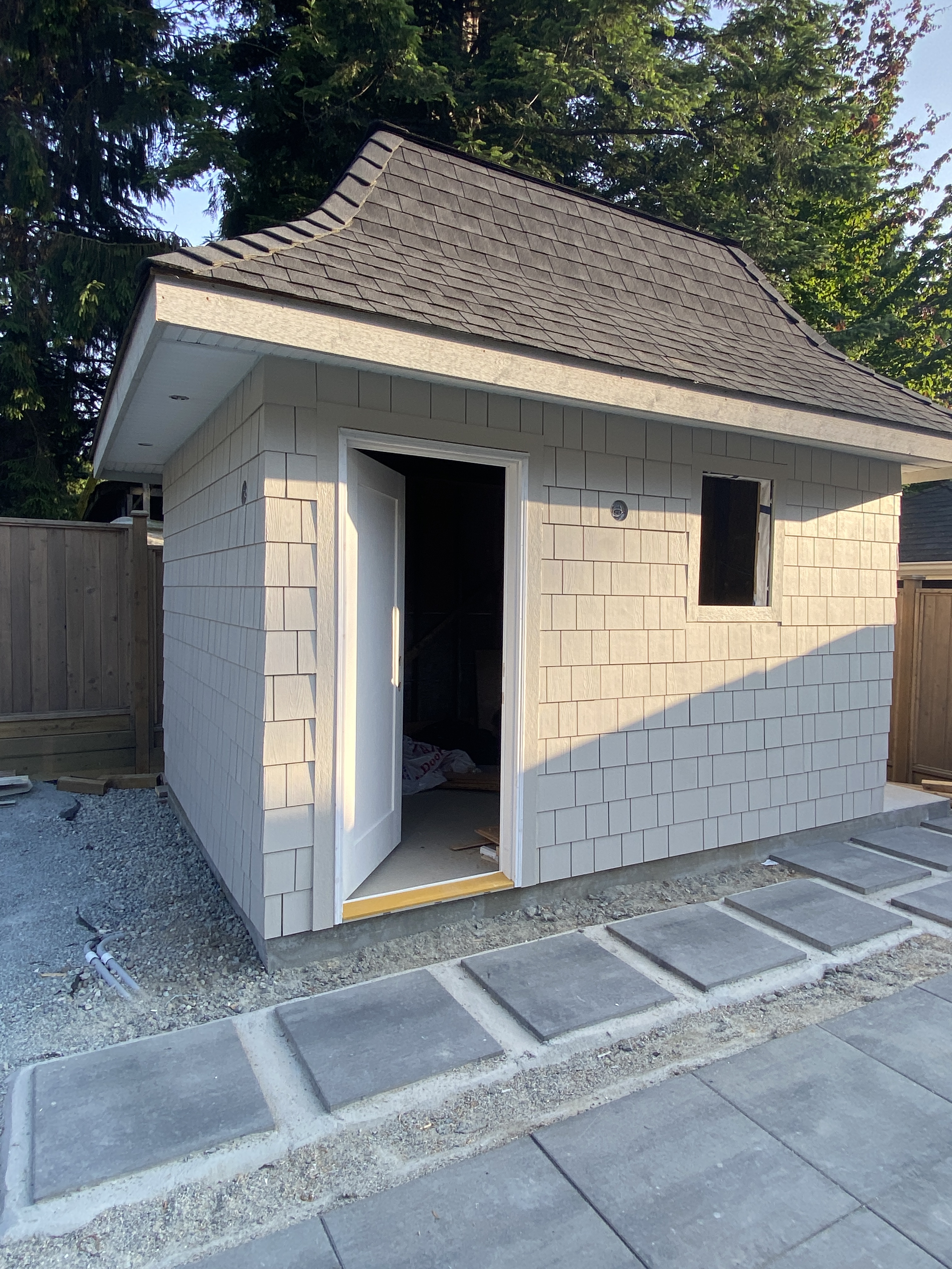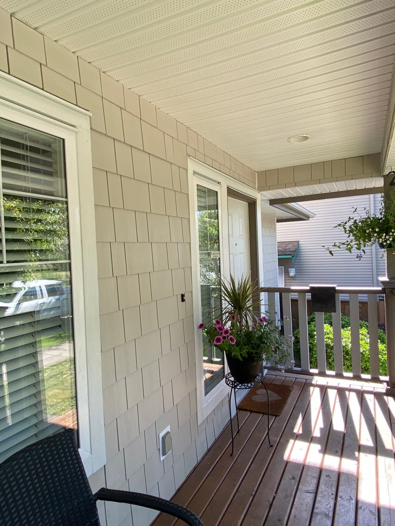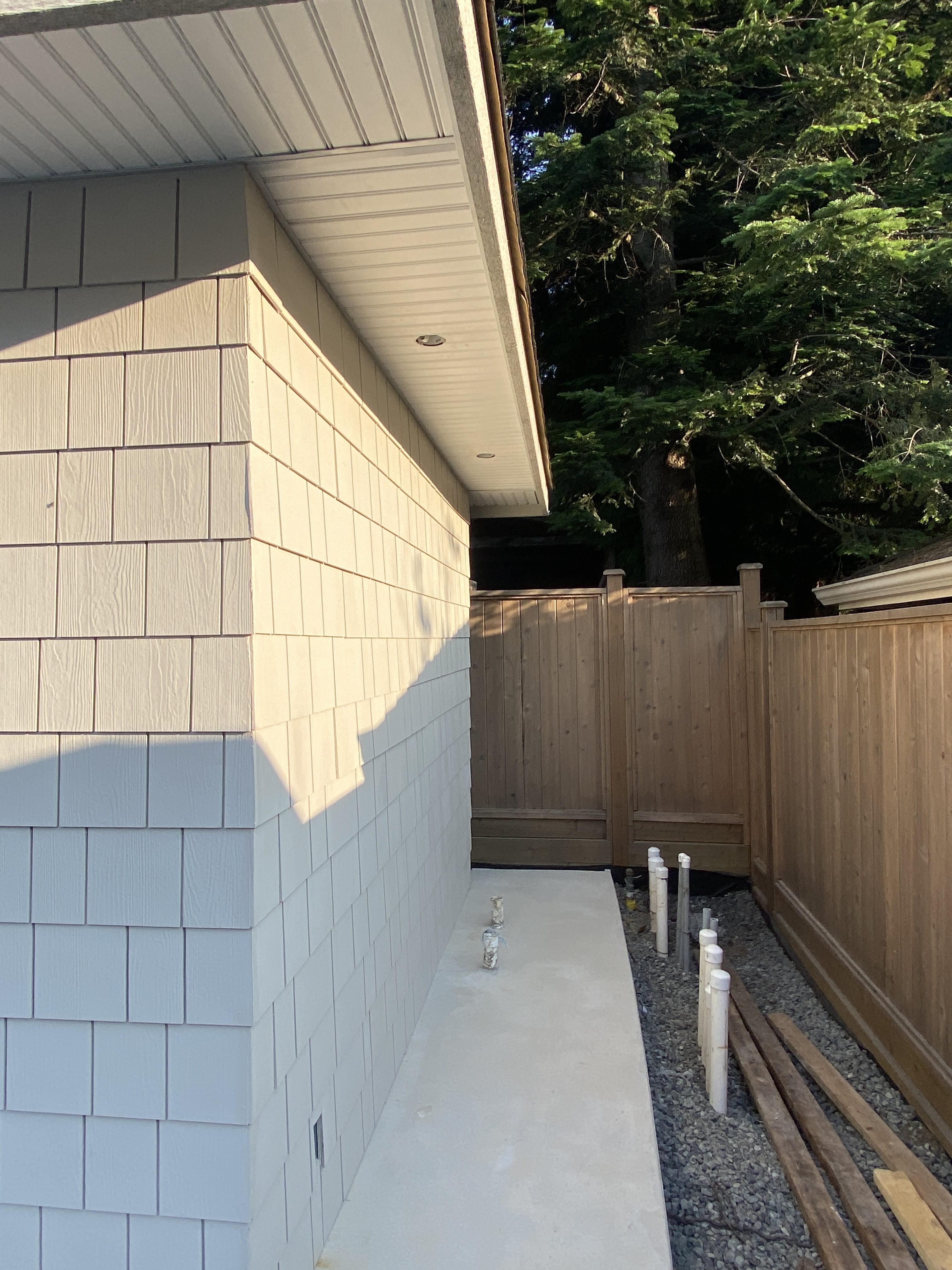 Hardie fibre cement cedarmill shingles 7” reveal, laced corners, siding in factory painted Cobble Stone colour. Fibre cement trims around door and window. Vented beaded vinyl white soffits. Rainscreen strapping, Tyvek homewrap. Vented starter strips. Door and window installations.