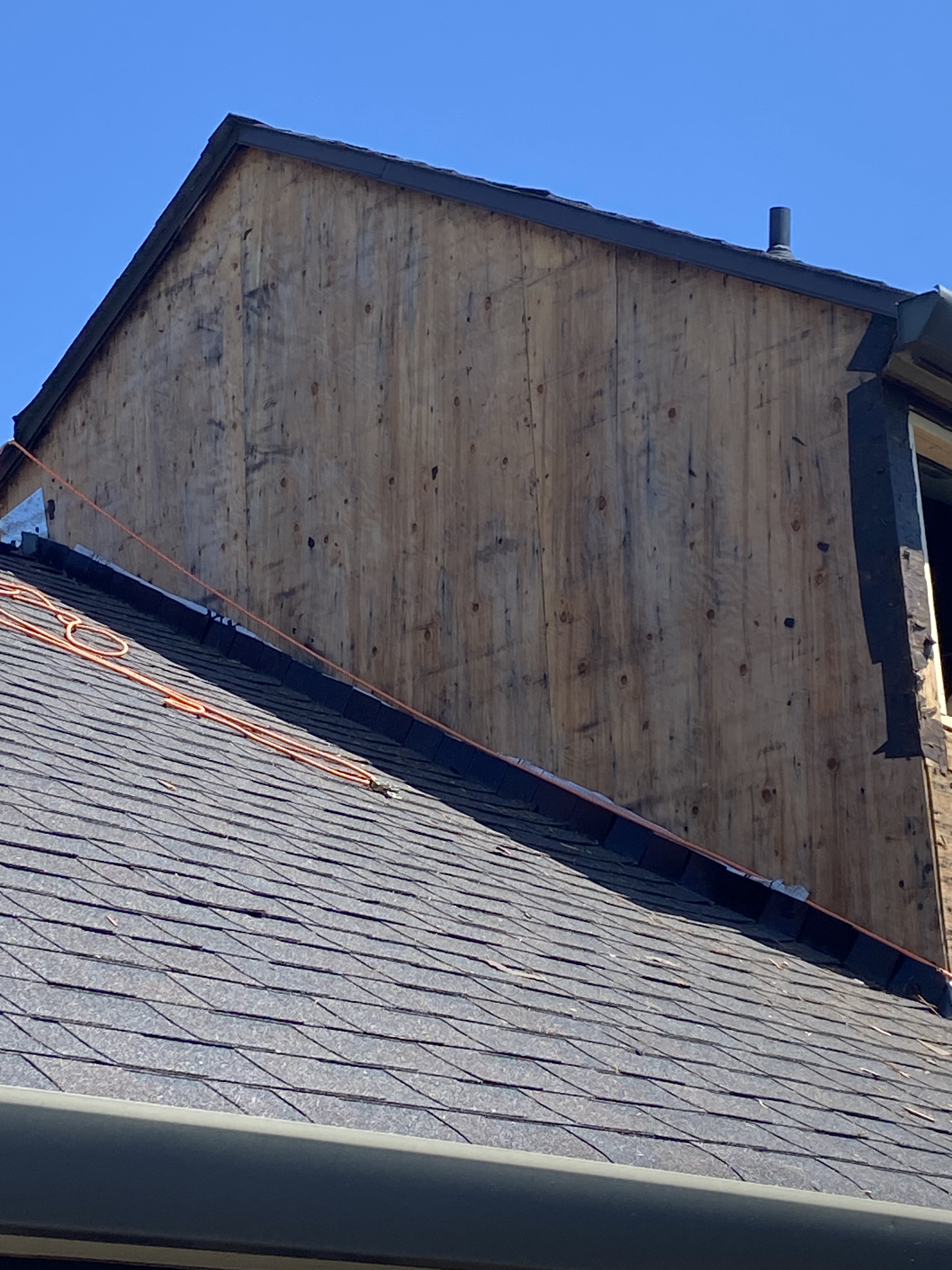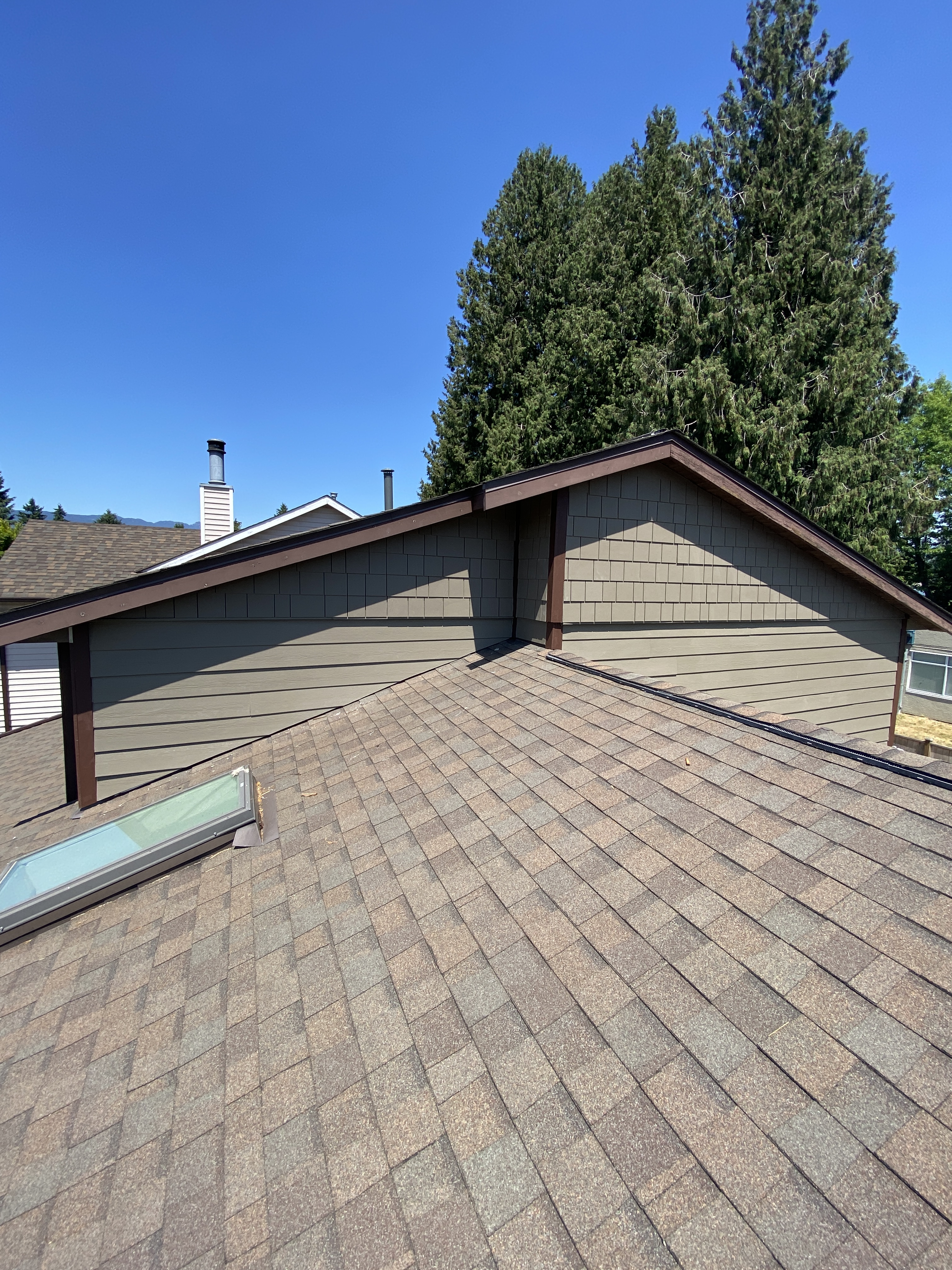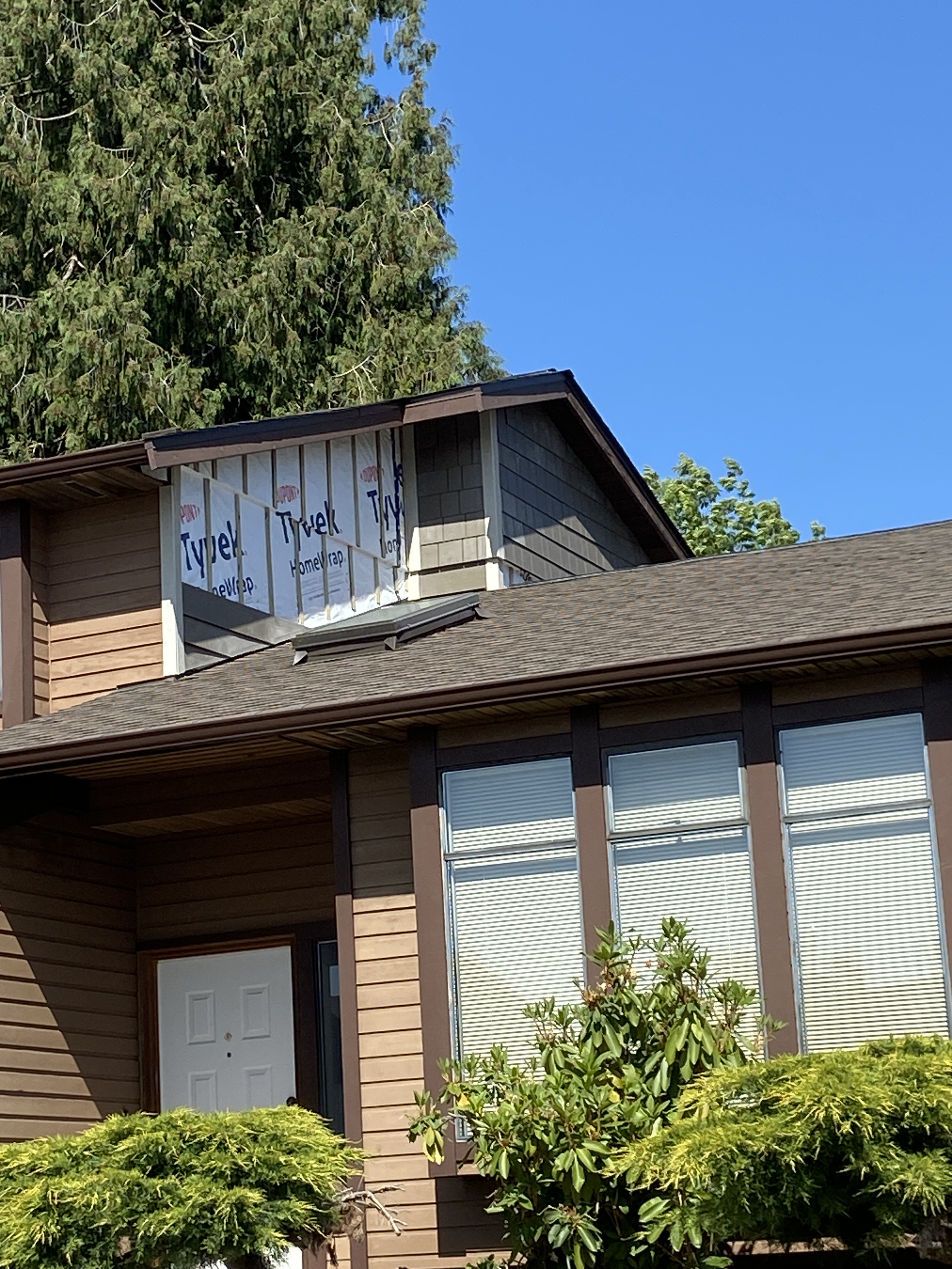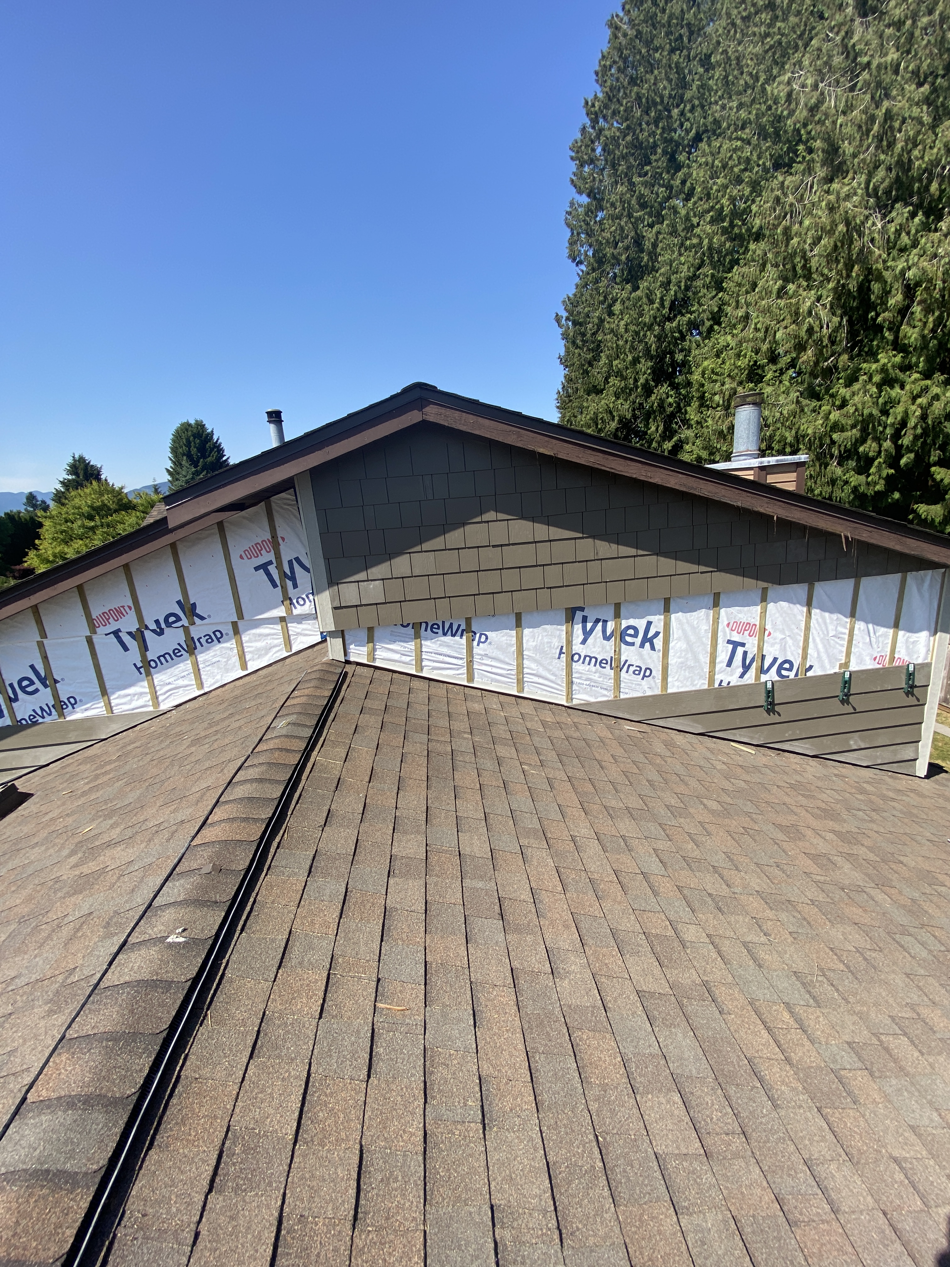 Hardie fibre cement 7” reveal shingles and horizontal planks TimberBark factory painted. Fibre cement corners and trims painted colour match with existing trims. Sheathing repair and installation. Tyvek homewrap and rainscreen strapping installation. Custom flashing.