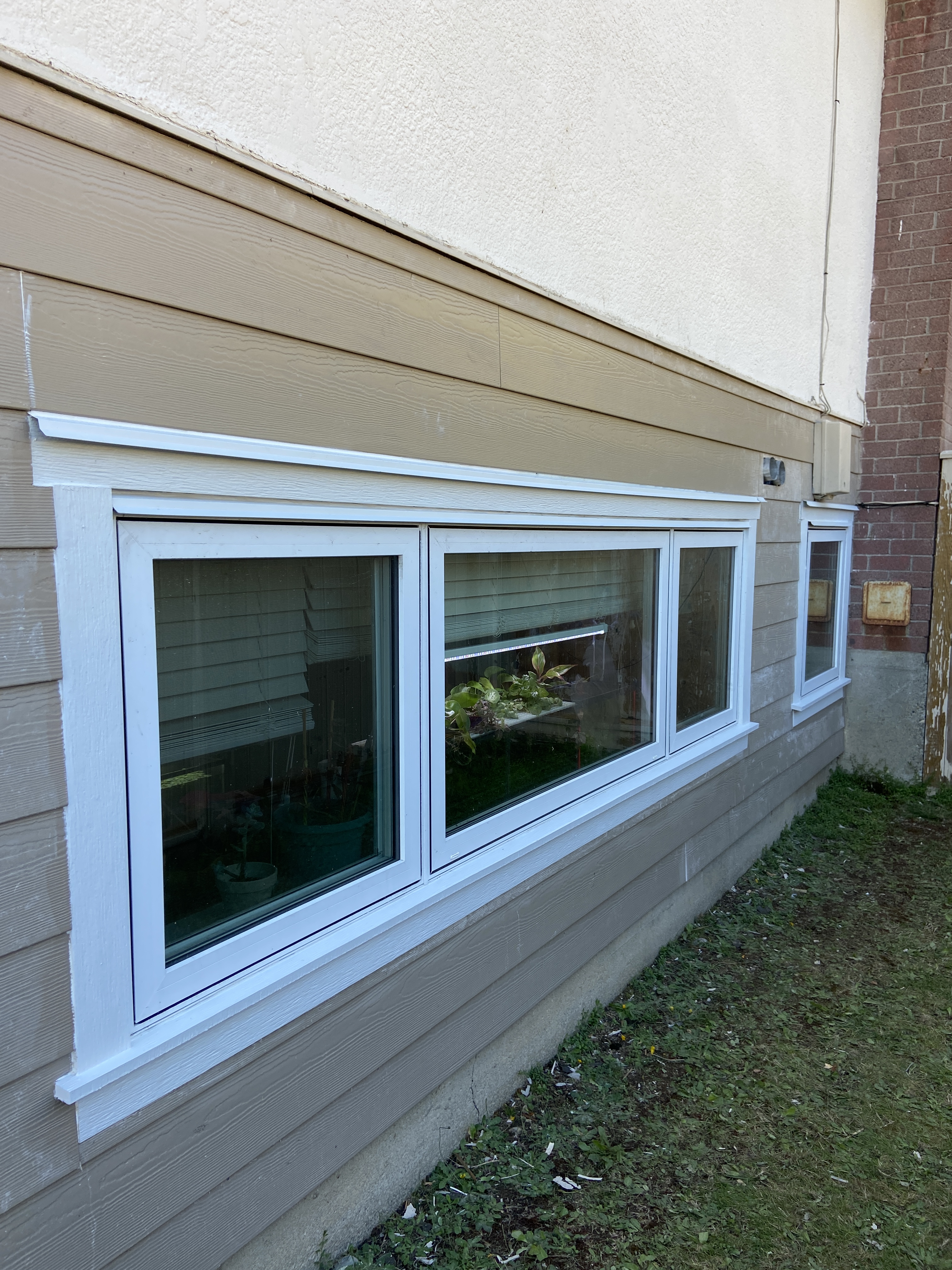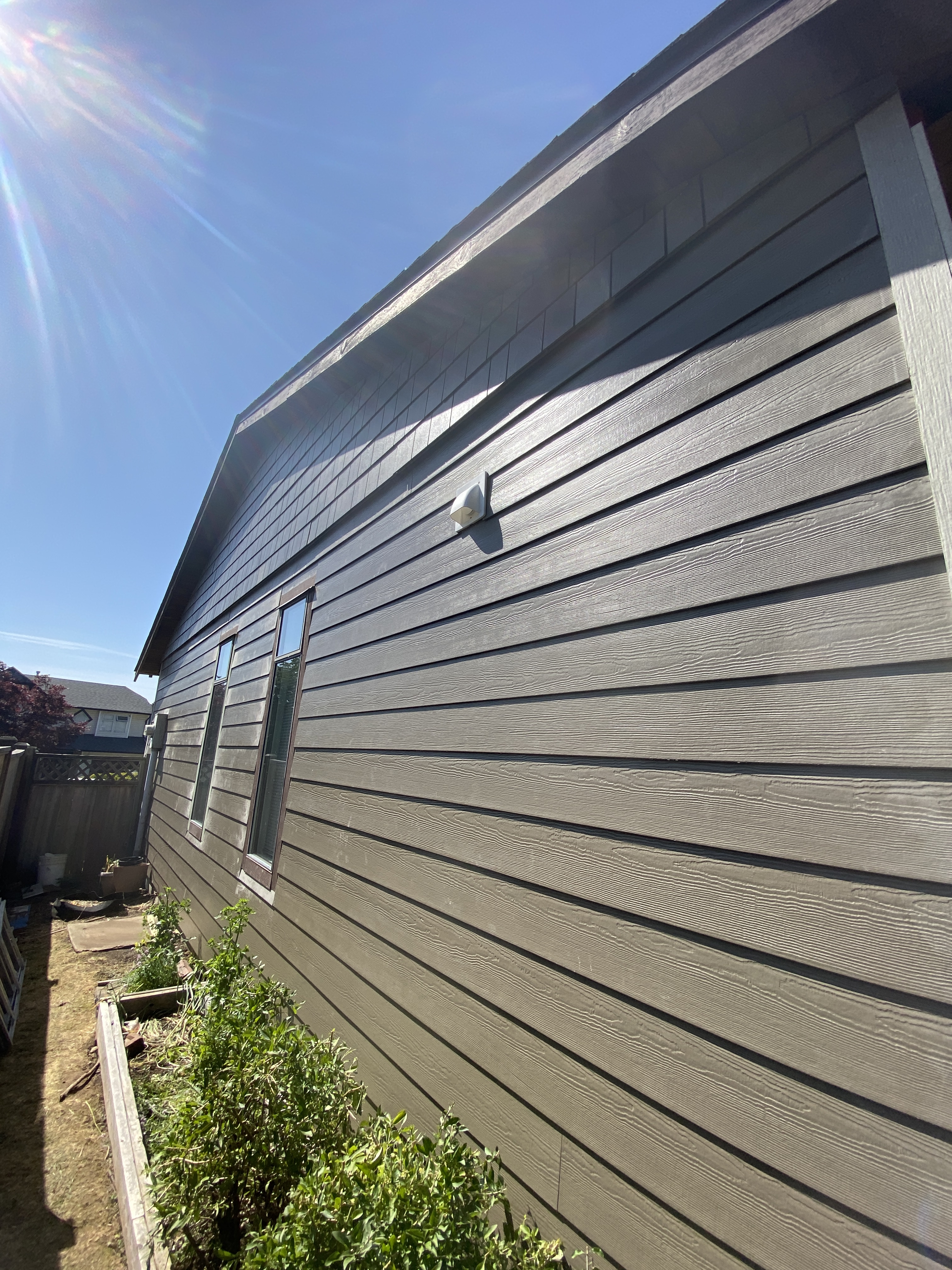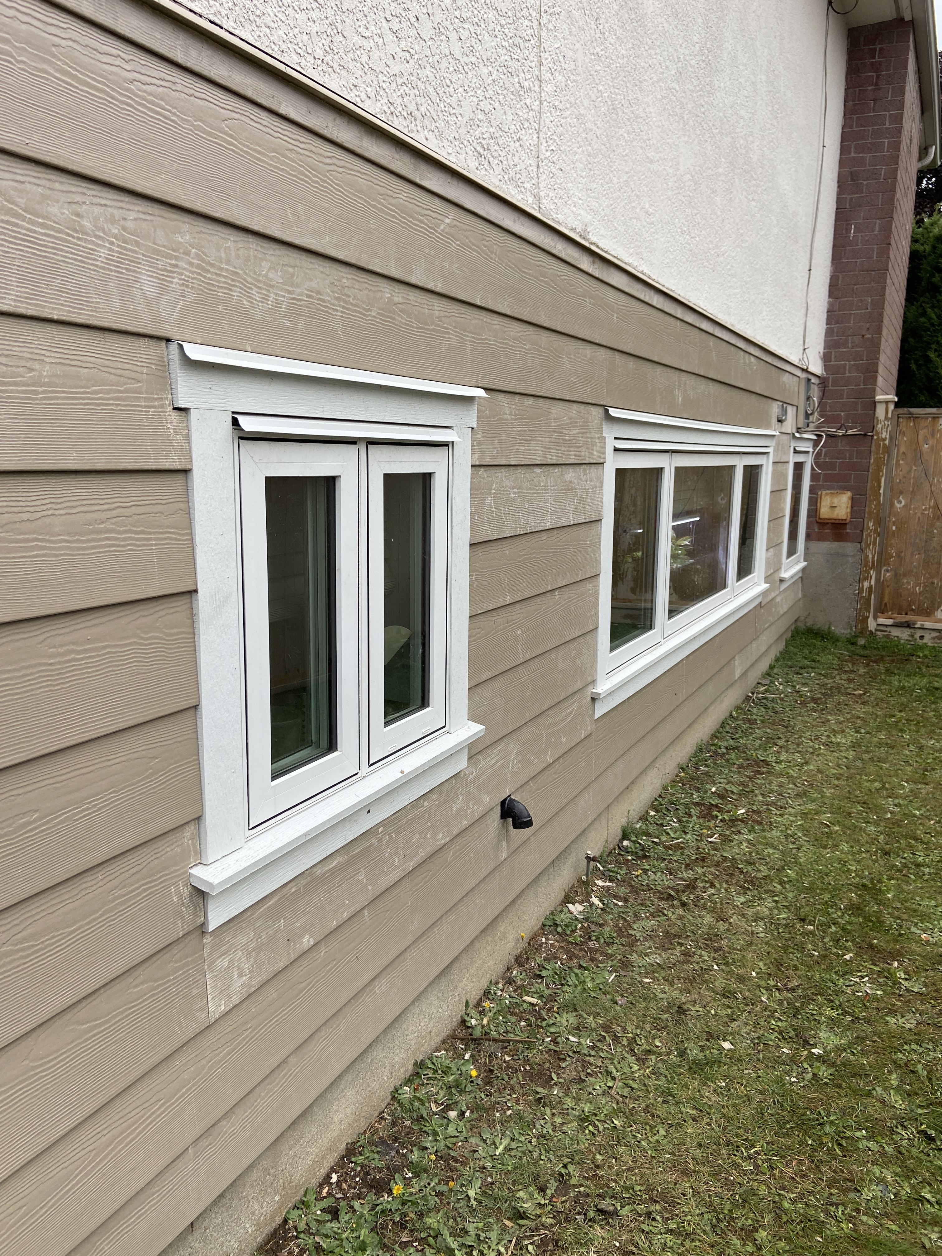 Professionally installed primed horizontal lap fibre cement 7” reveal. Painted with matching colour. Tyvek homewrap, vented starter strips, rainscreen strapping, and windows trims
