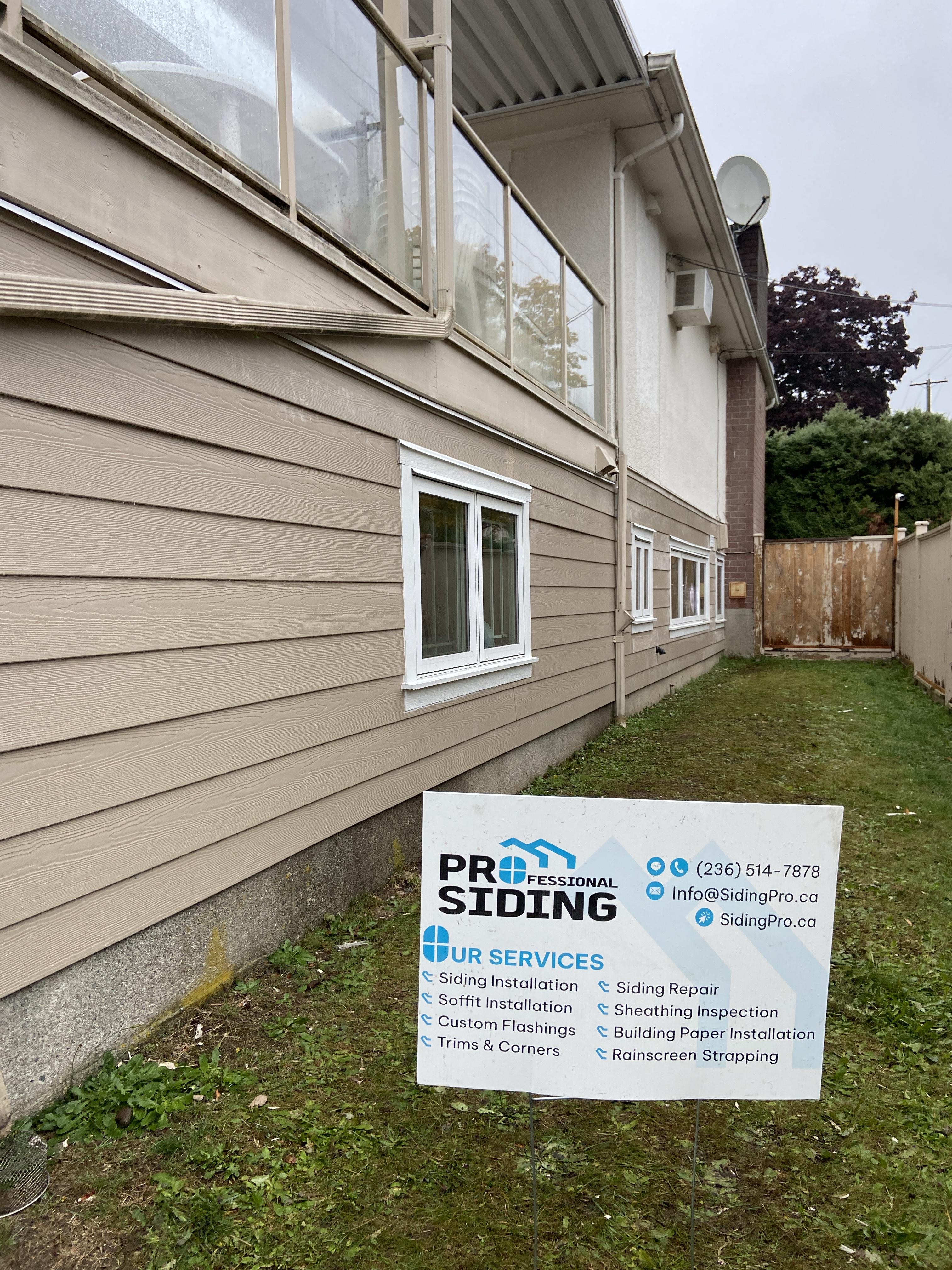 Another quality project completed by Professional Siding! James Hardie horizontal fibre cement lap siding in Khaki Brown 7” reveal replaced old wood siding. Vented starter strips, rainscreen strappings, Tyvek homewrap, and rot sheathing repair. Contact us for a free estimate and consultation.