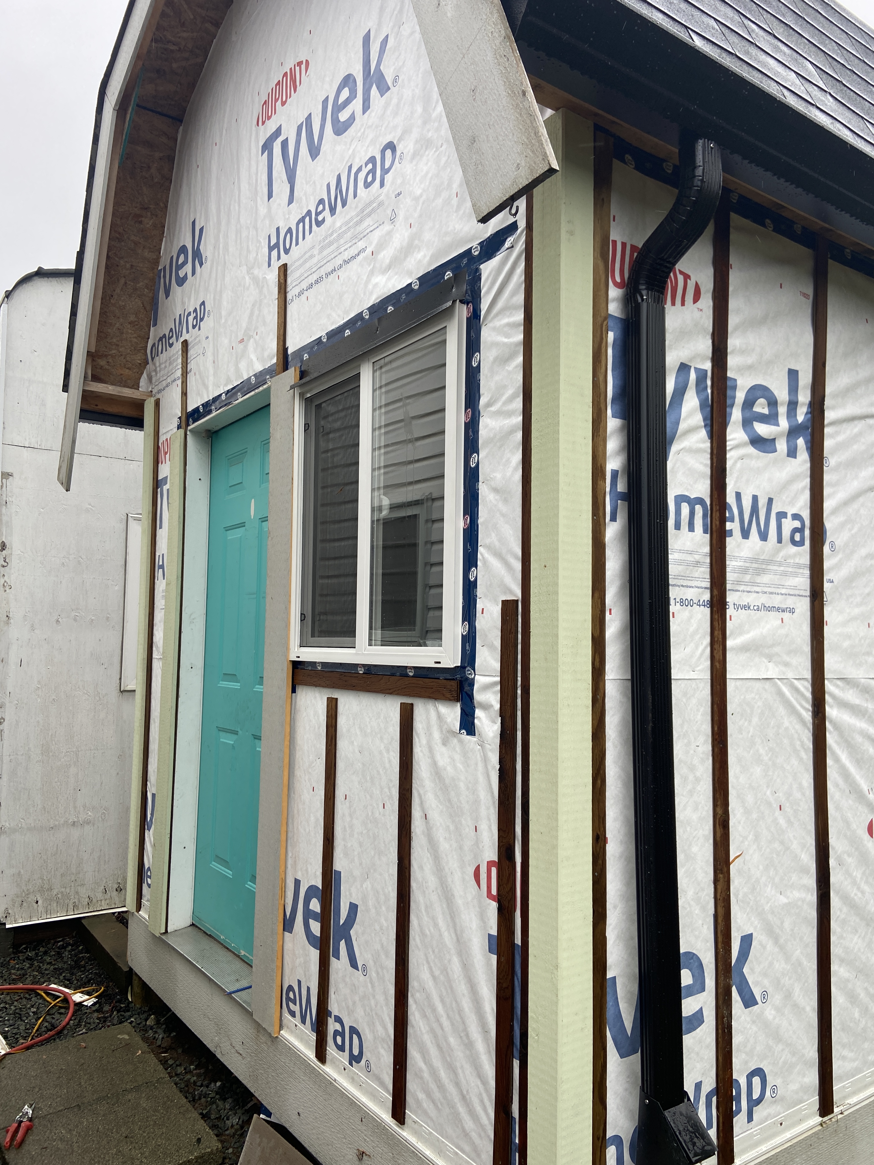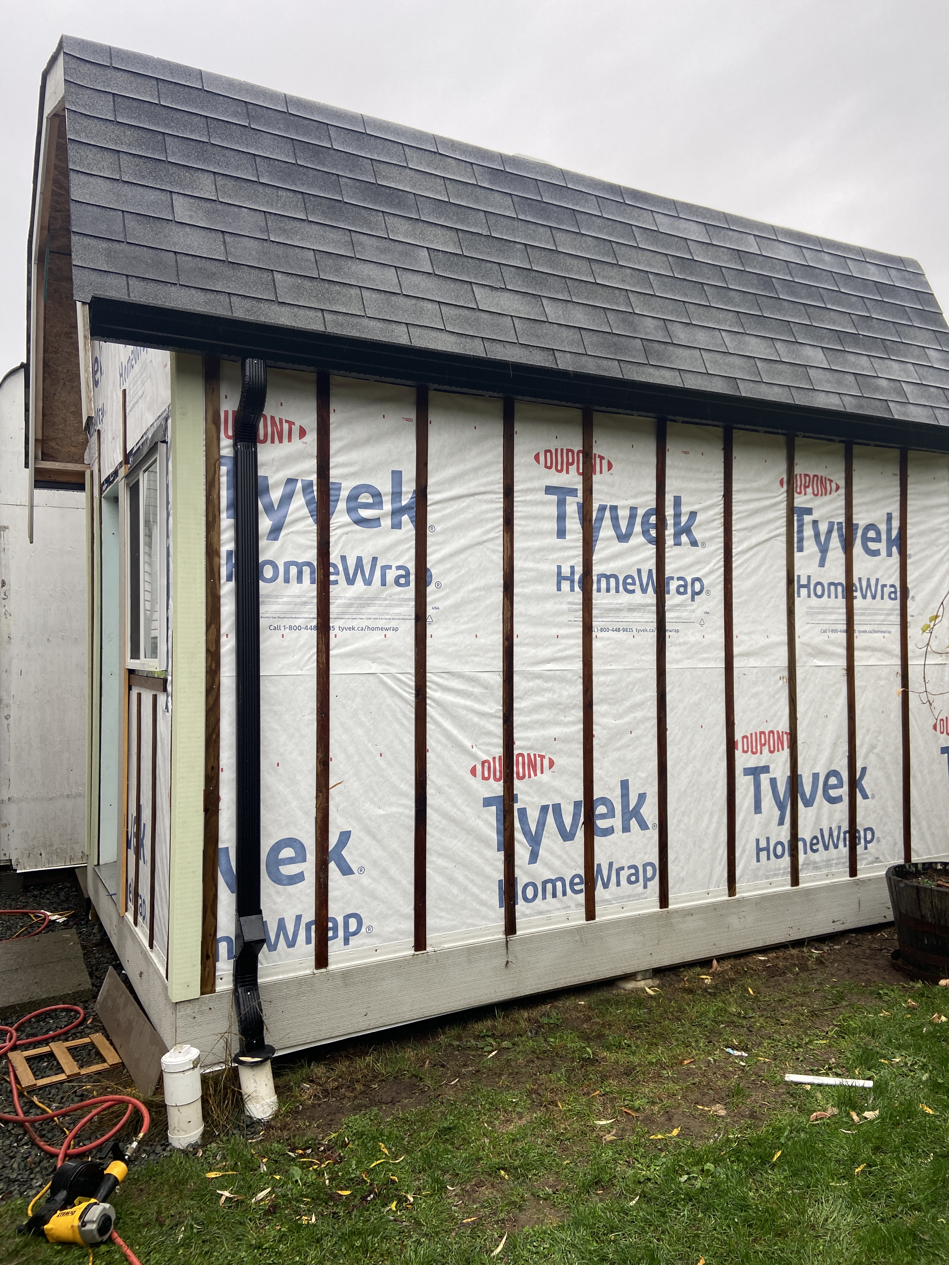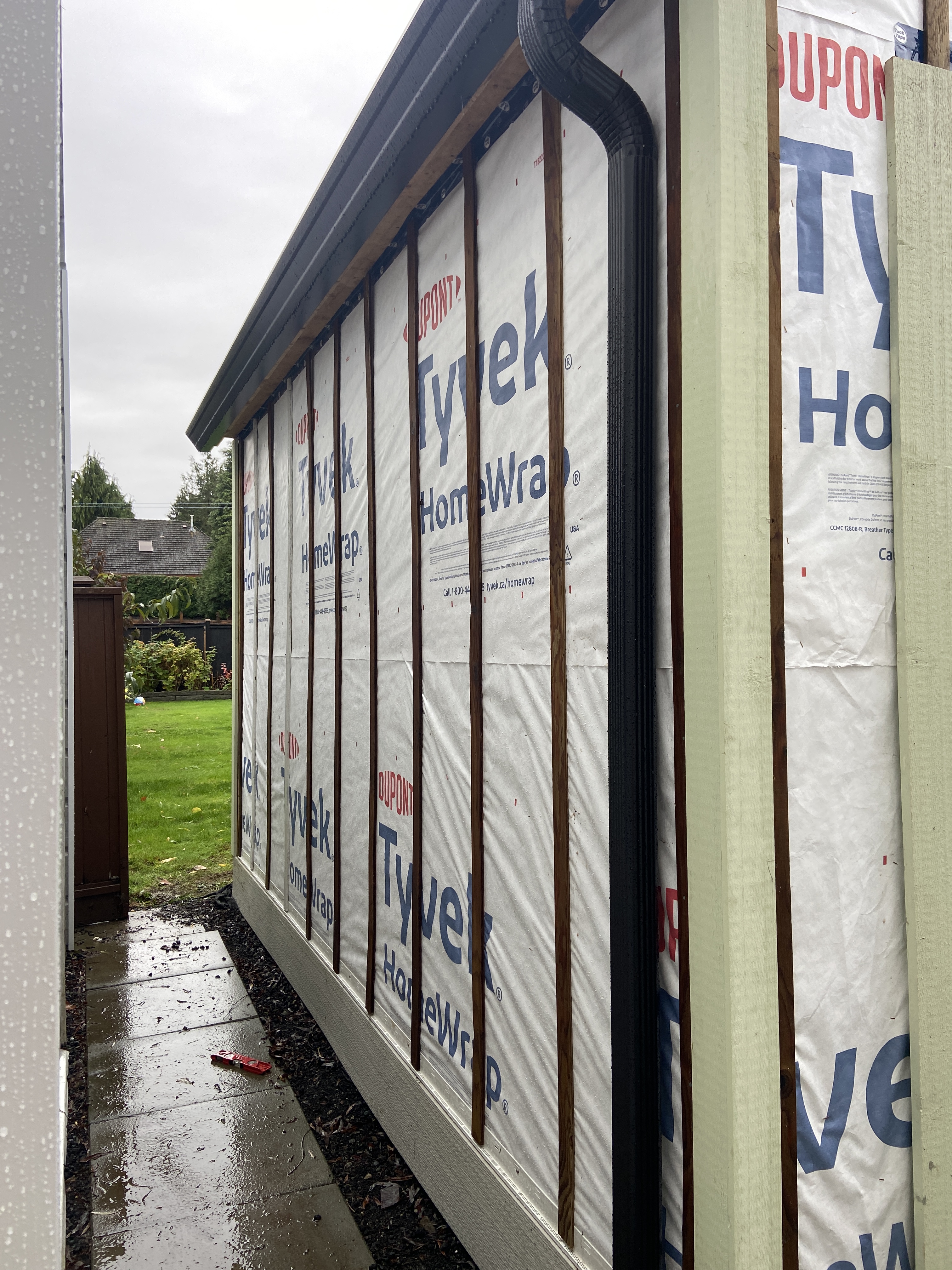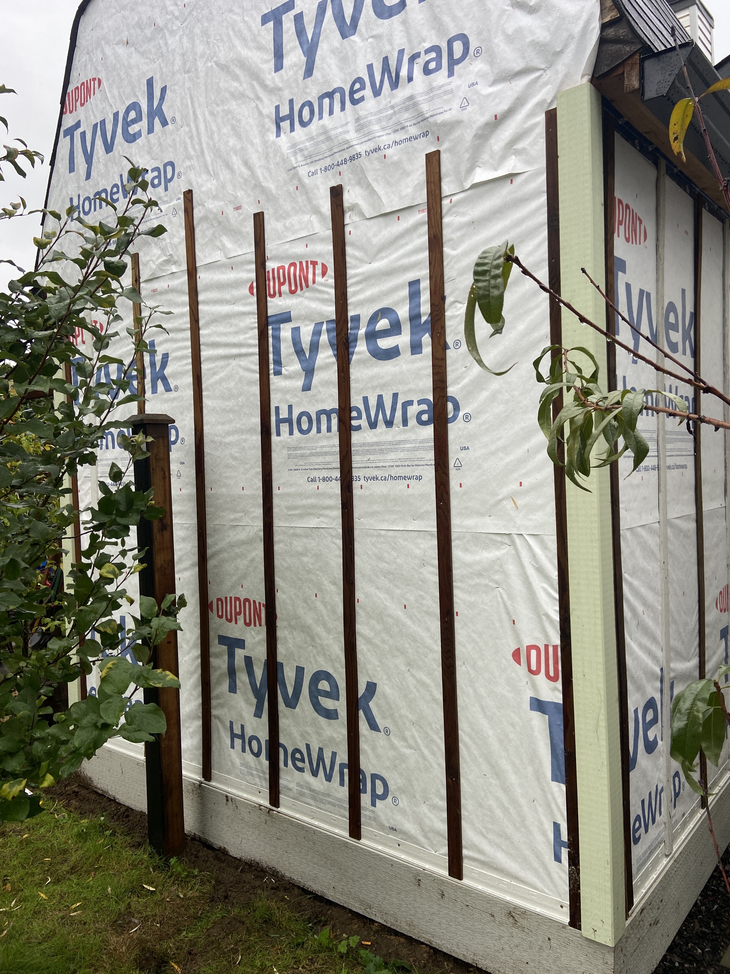 Tyvek Home Wrap & Treated Wood Rainscreen Strappings for Shed