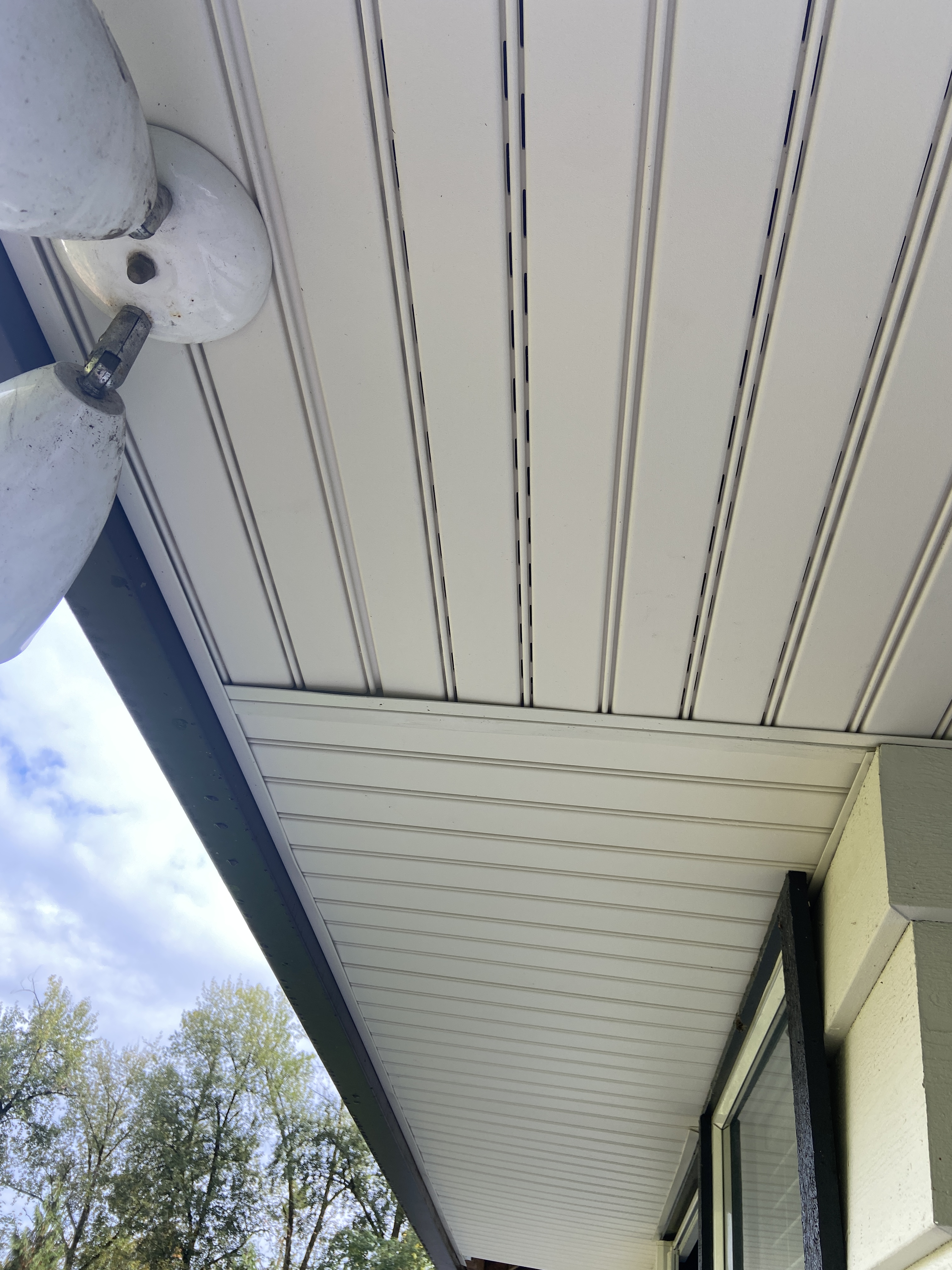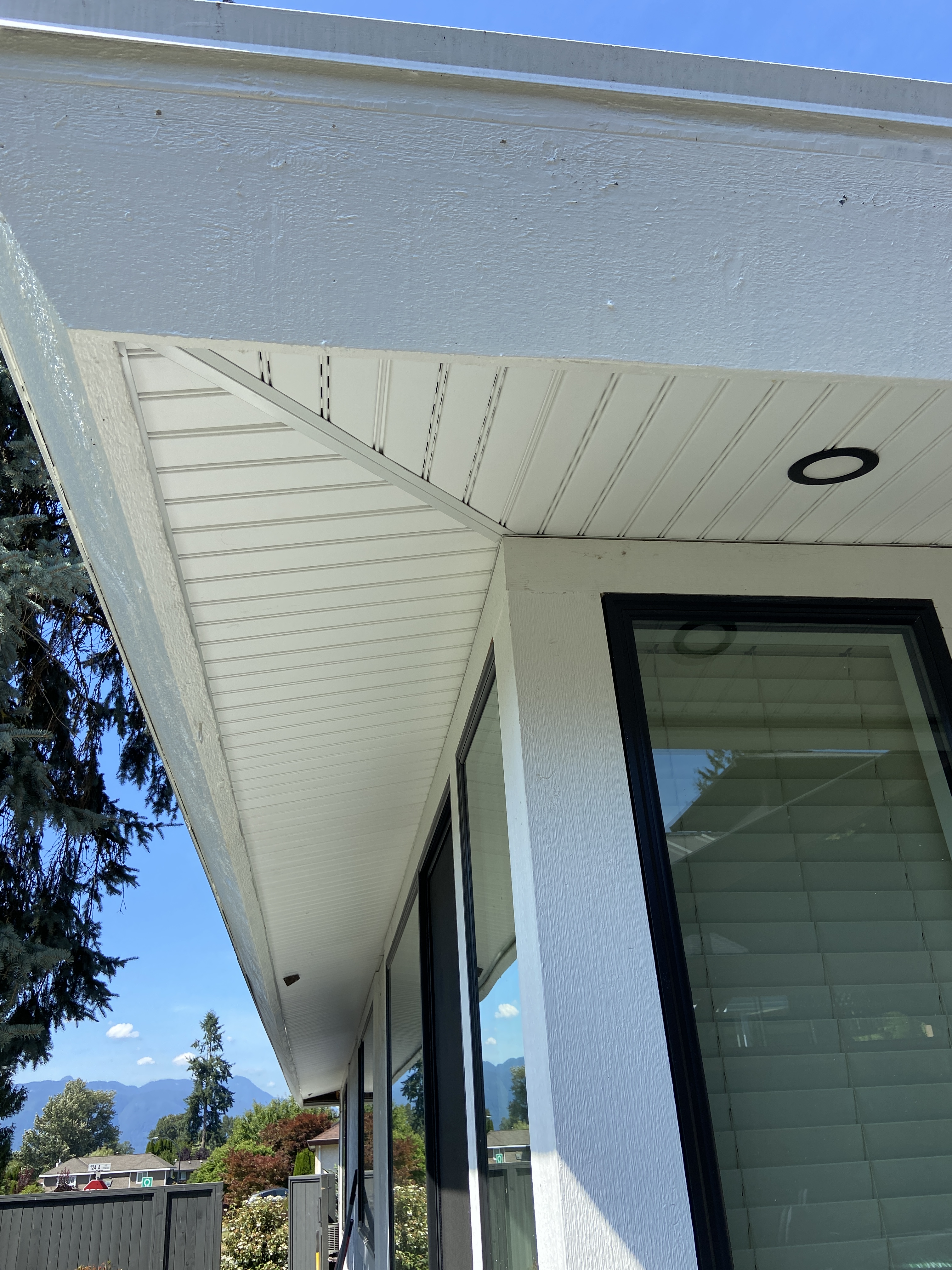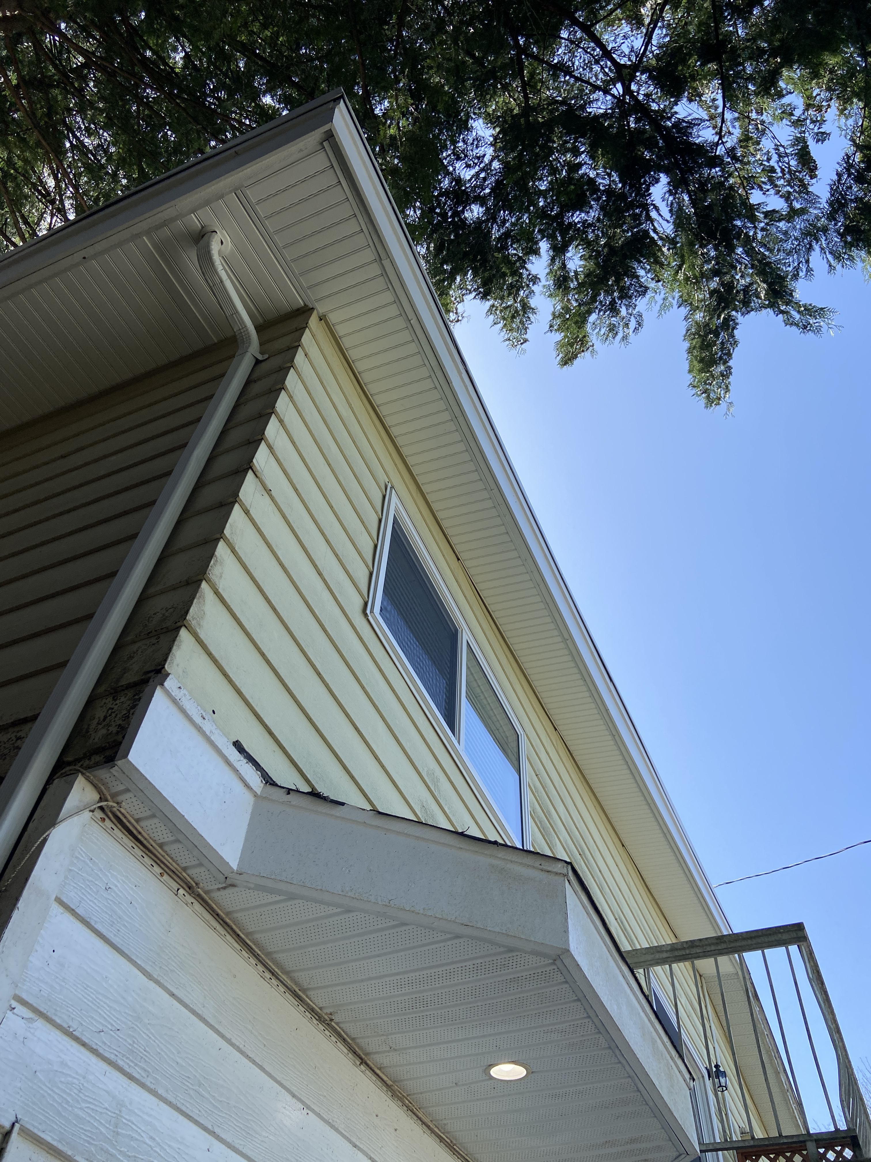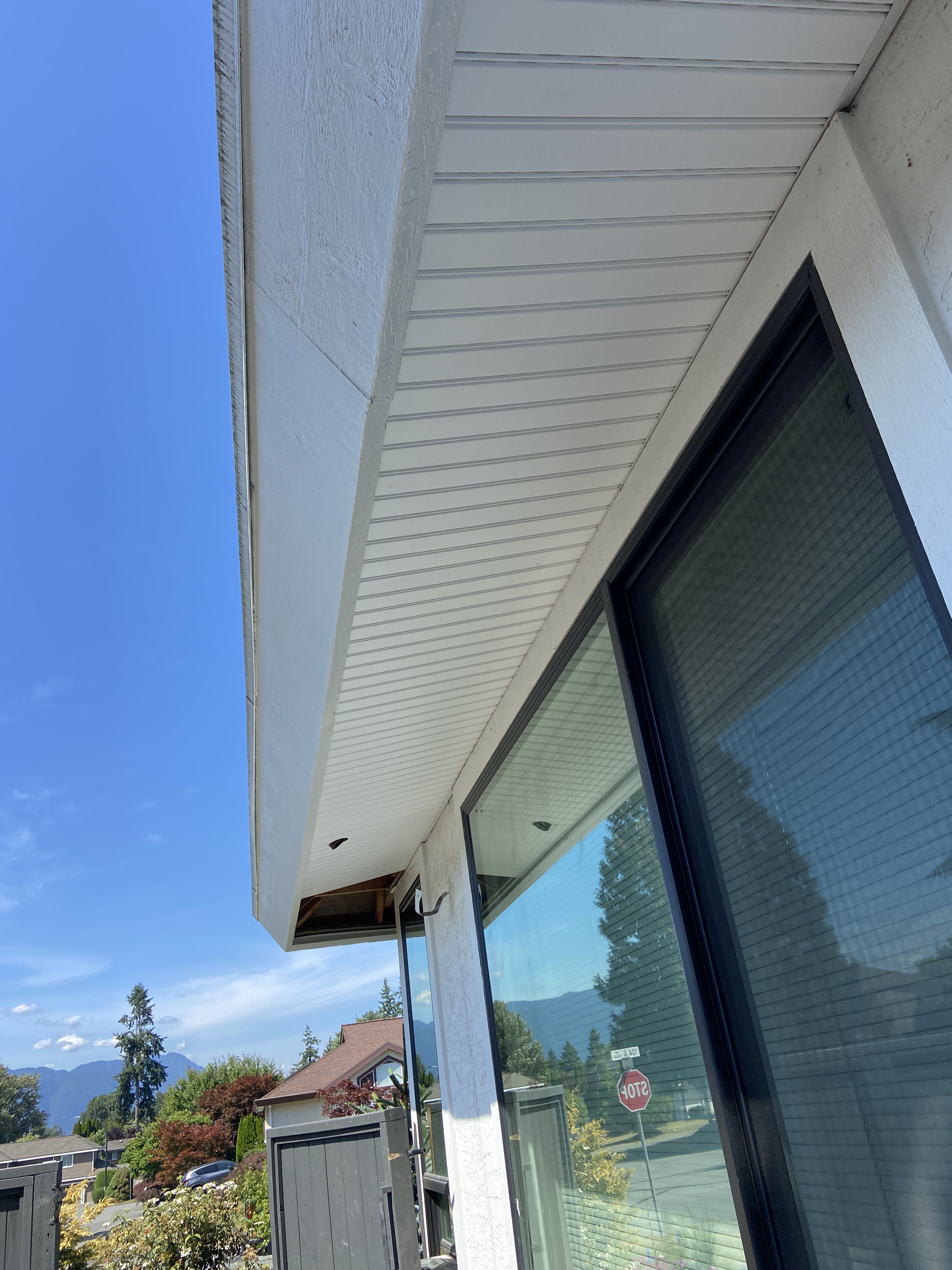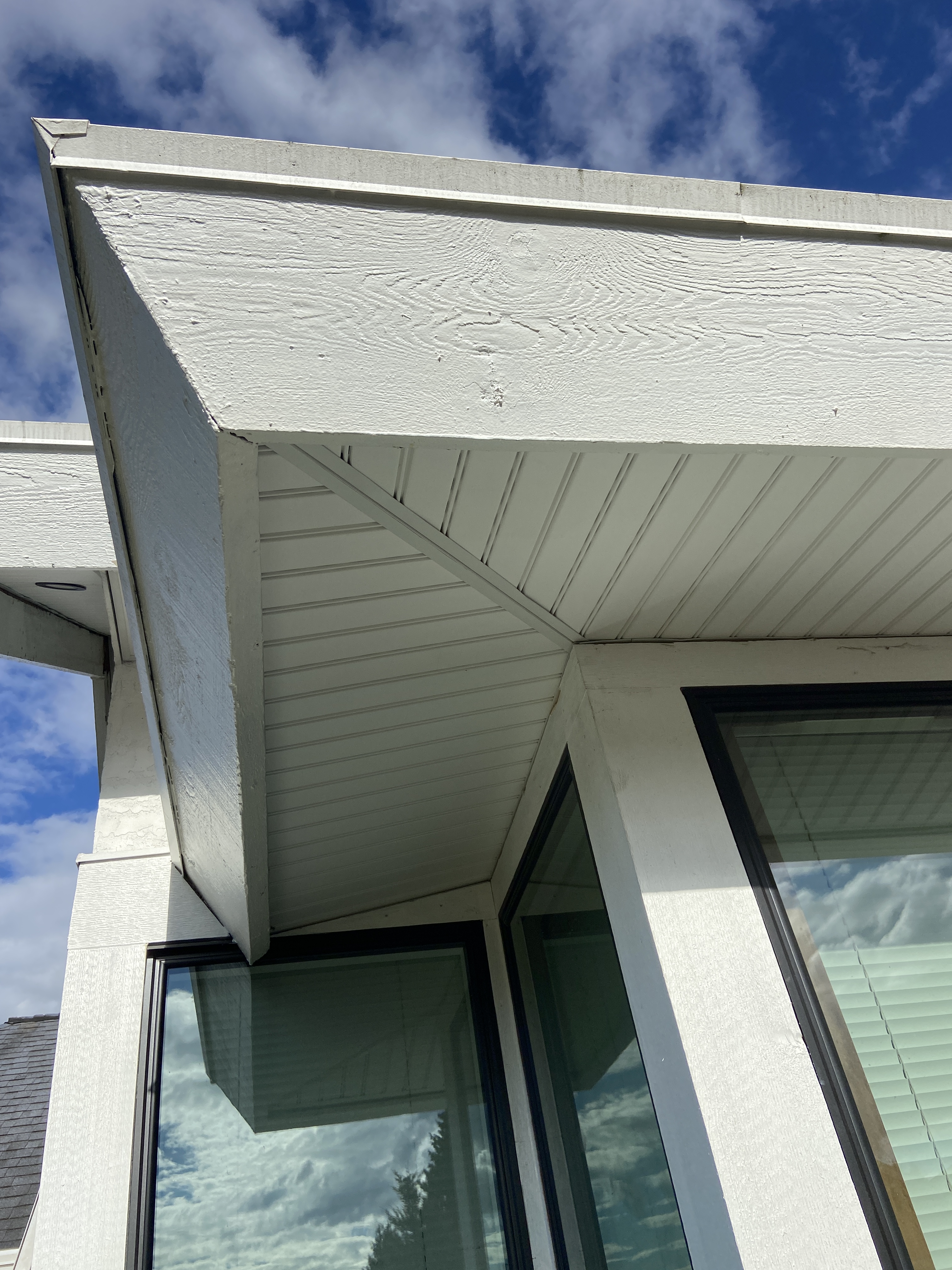 Professional Siding replaced old rotten high maintenance cedar soffits with new modern low maintenance vented beaded vinyl soffits. Mitered corners.
