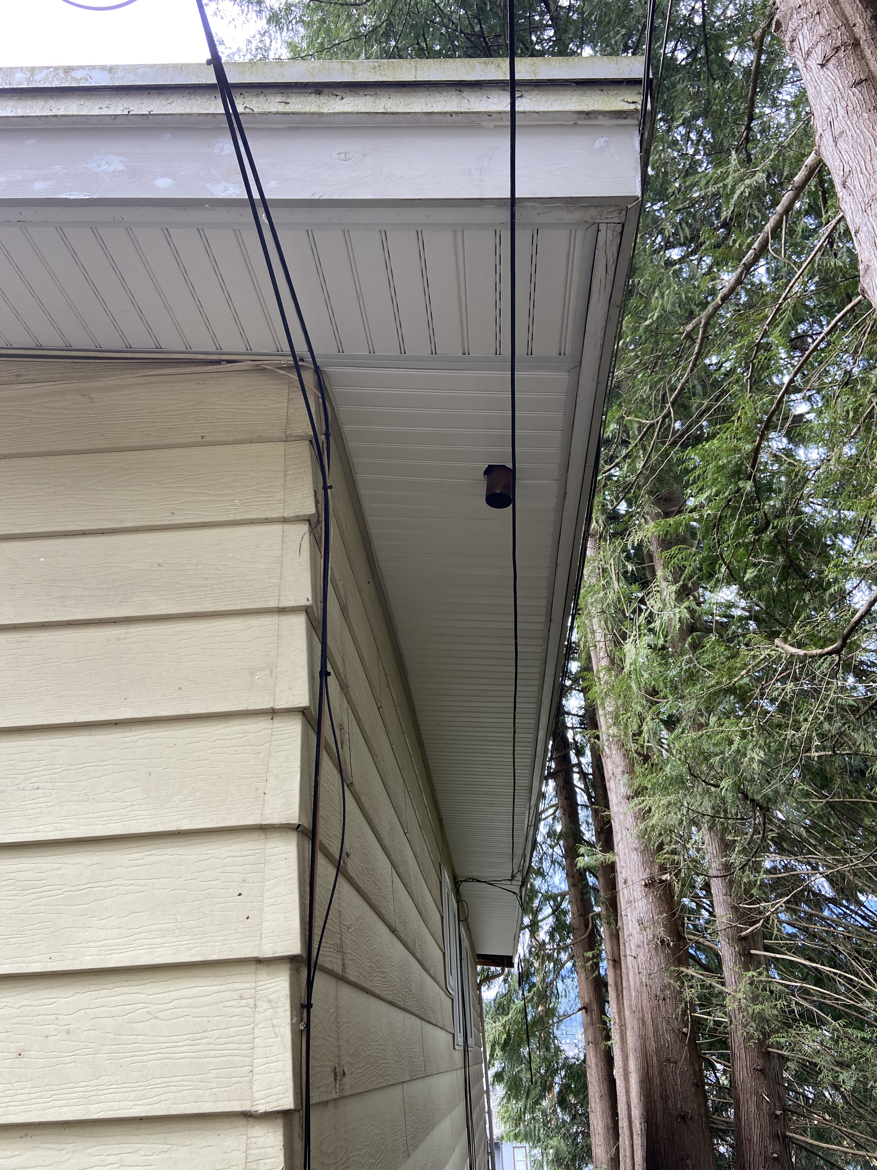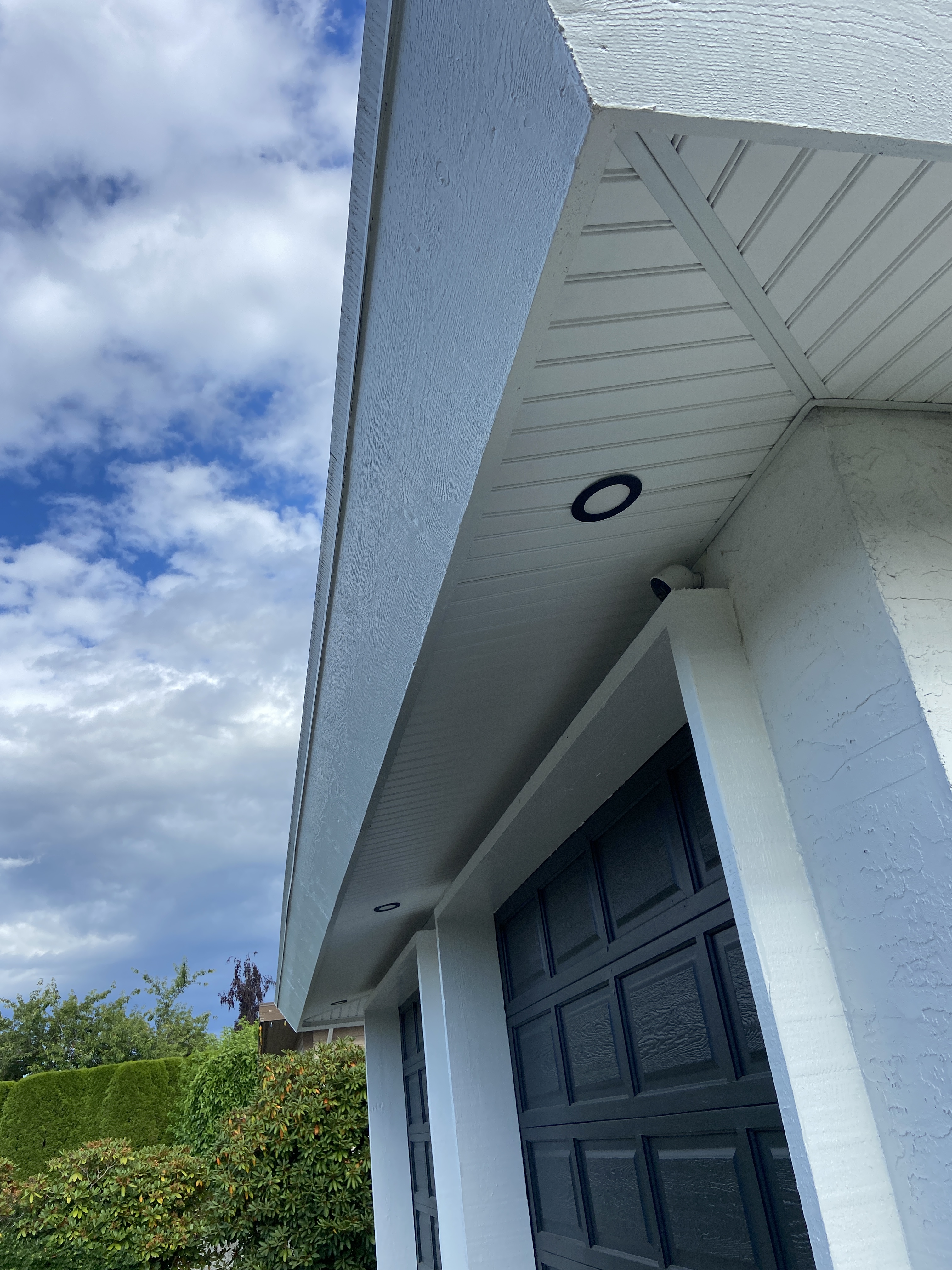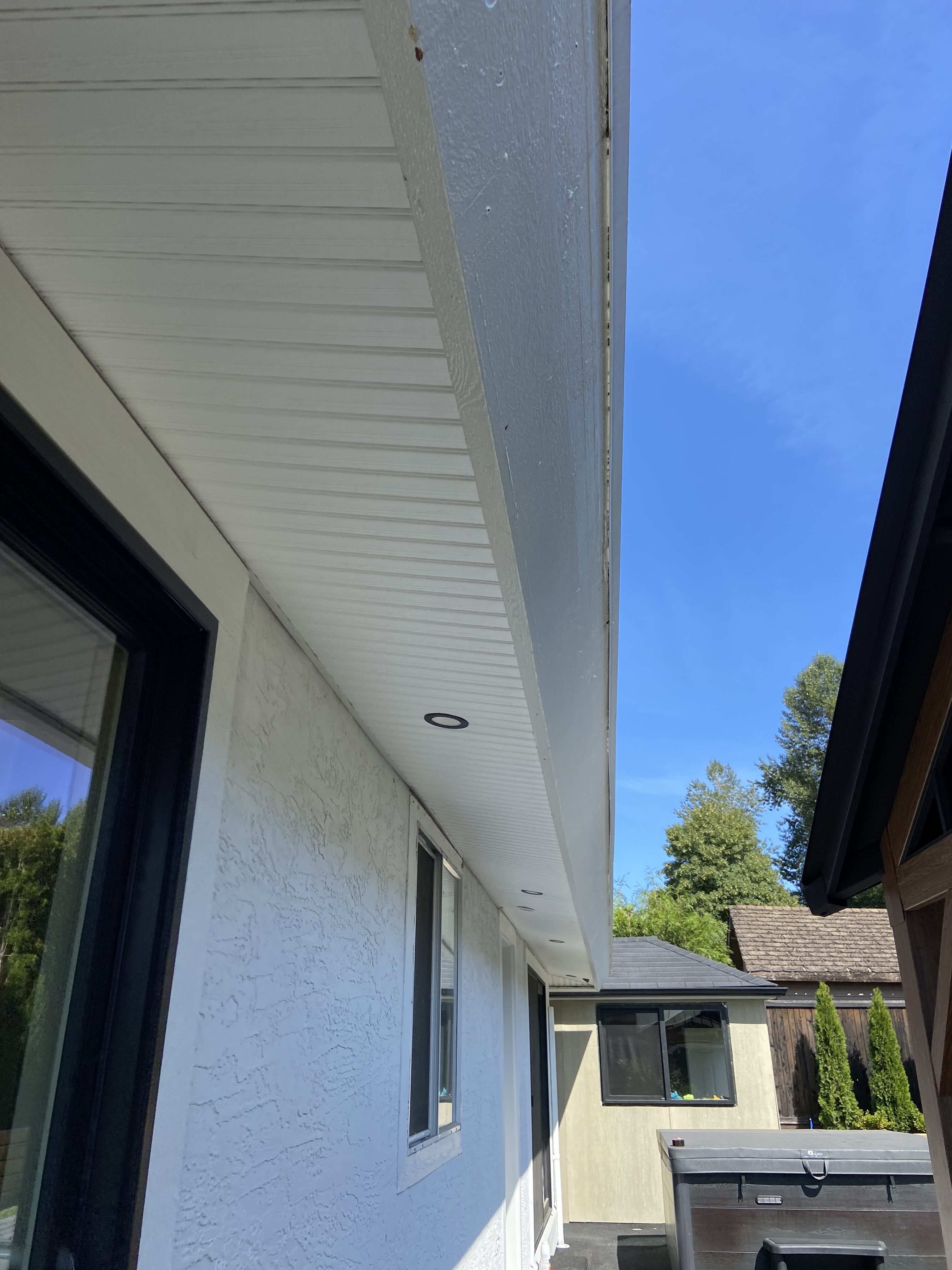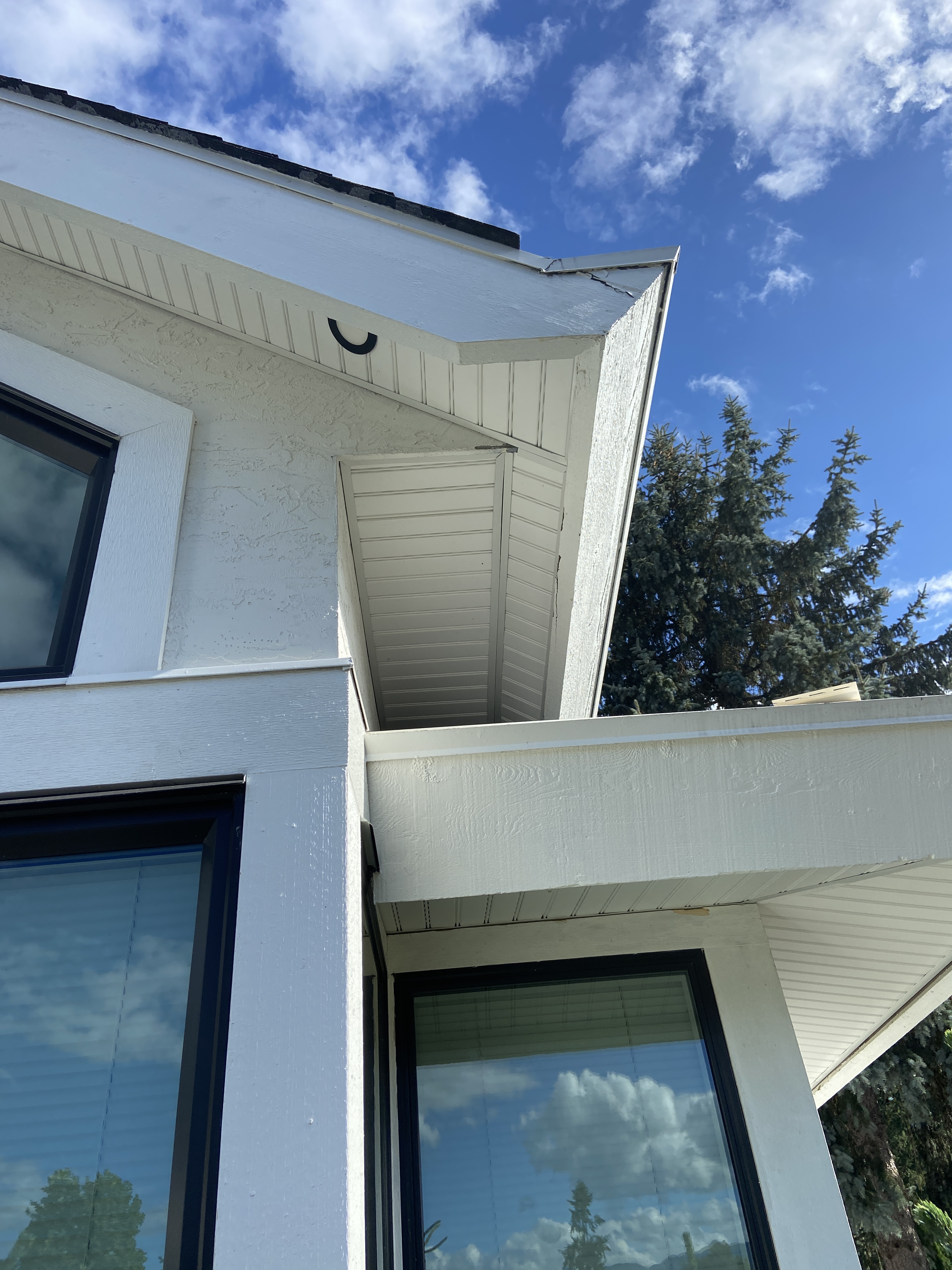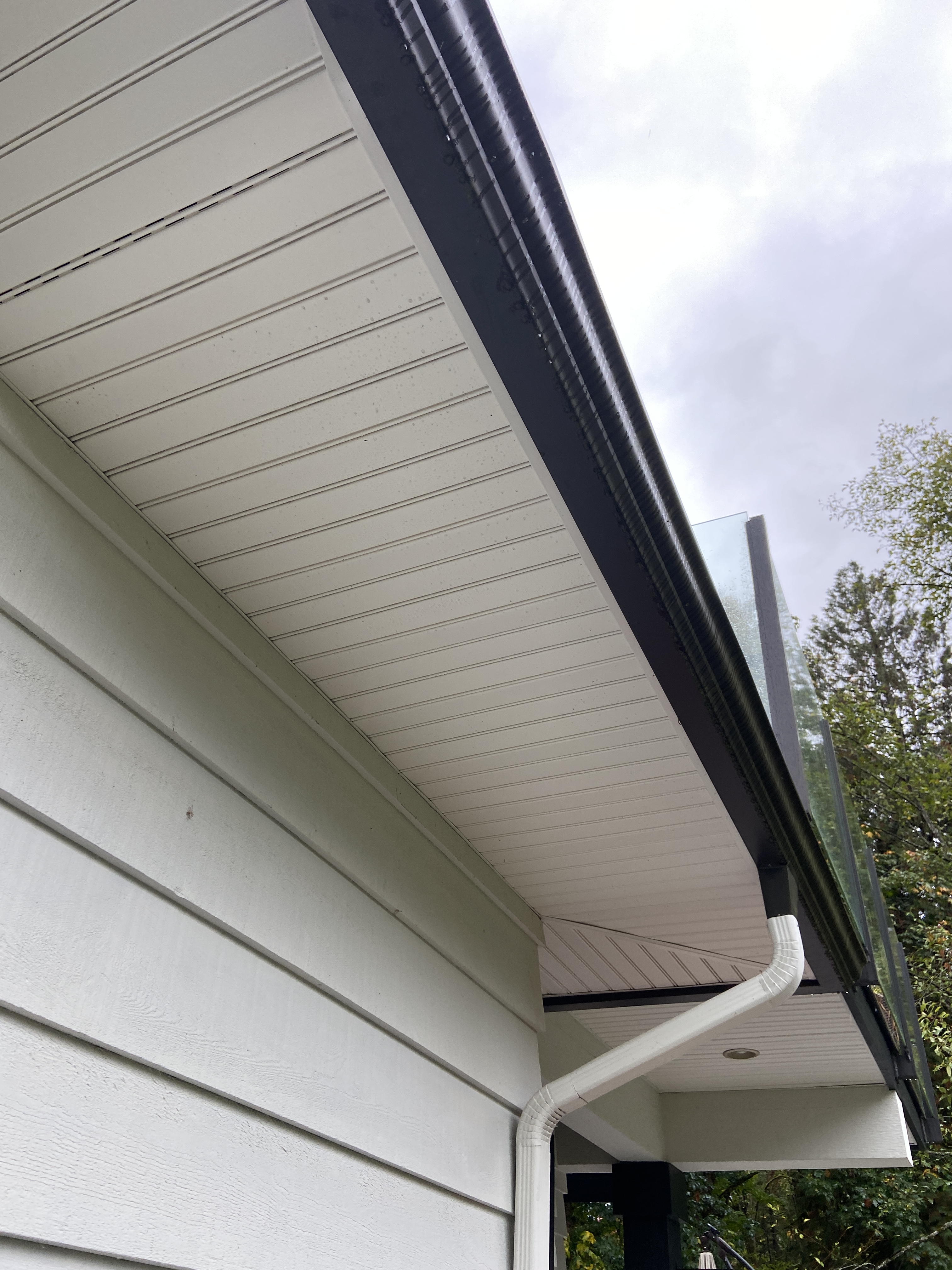 Professional Siding replaced old rotten high maintenance cedar soffits with new modern low maintenance vented beaded vinyl soffits. Mitered corners.