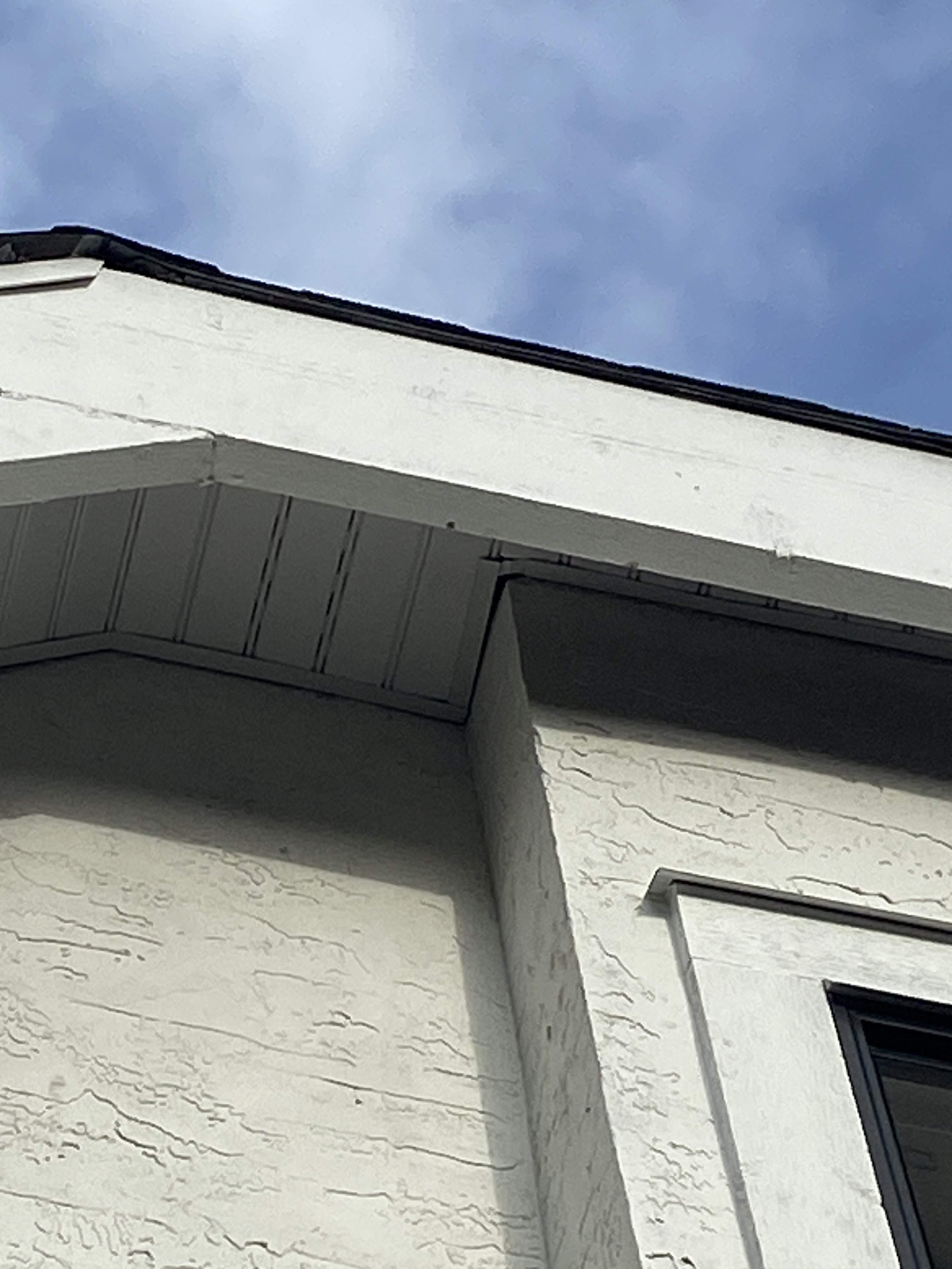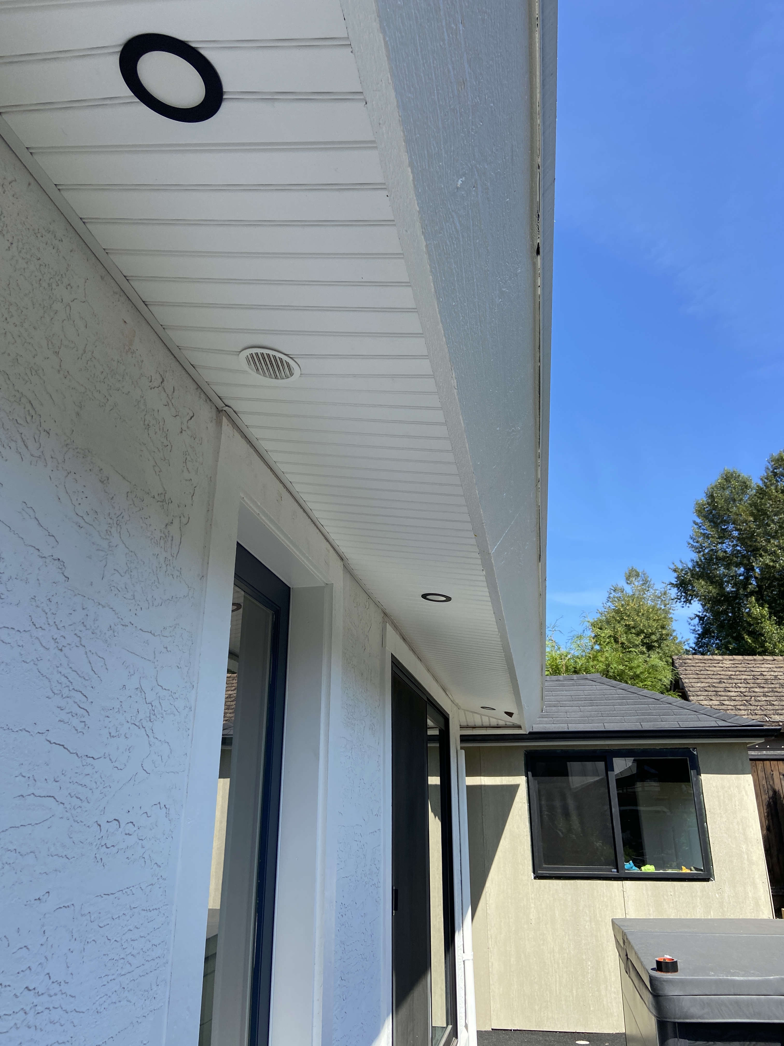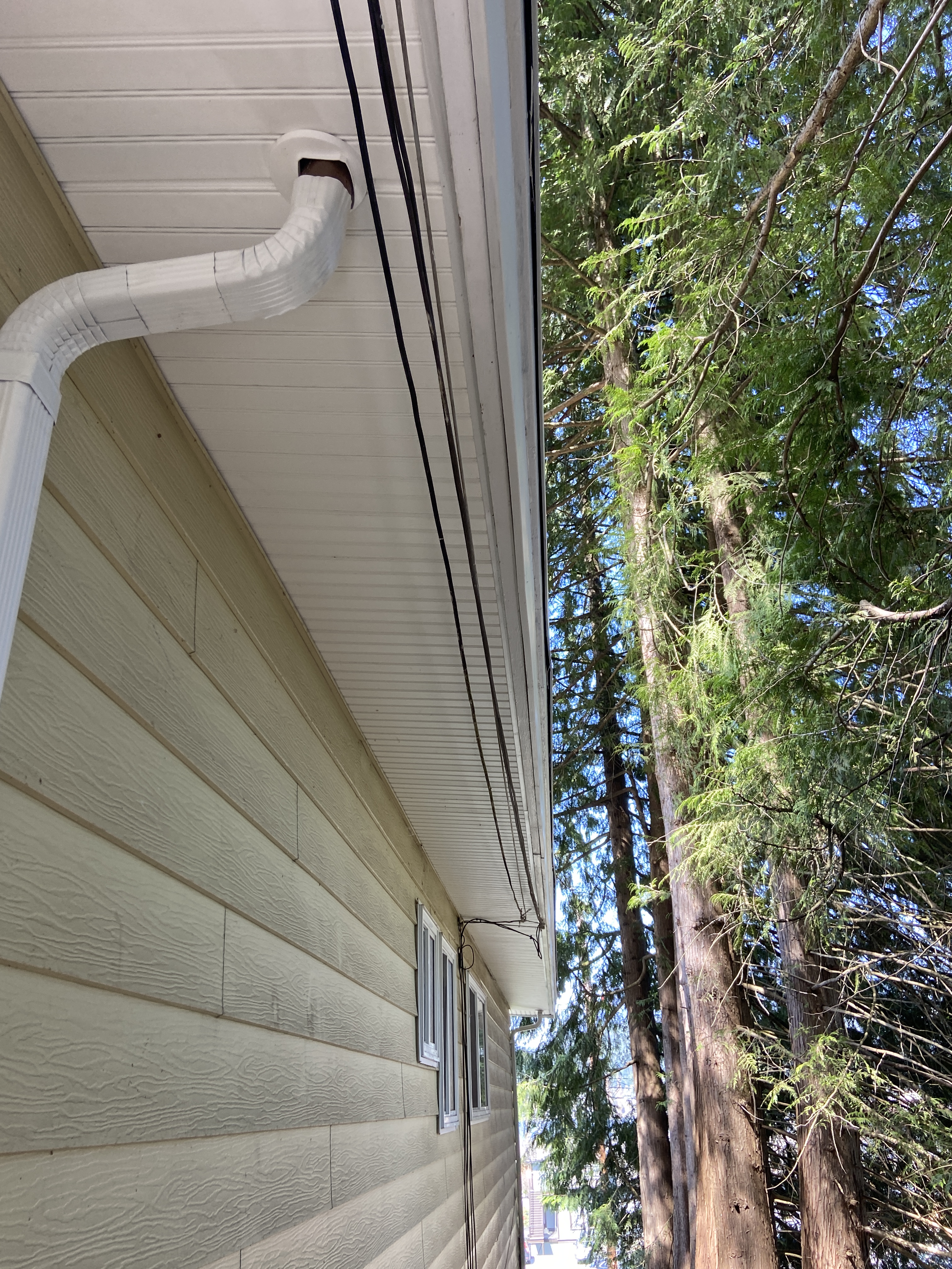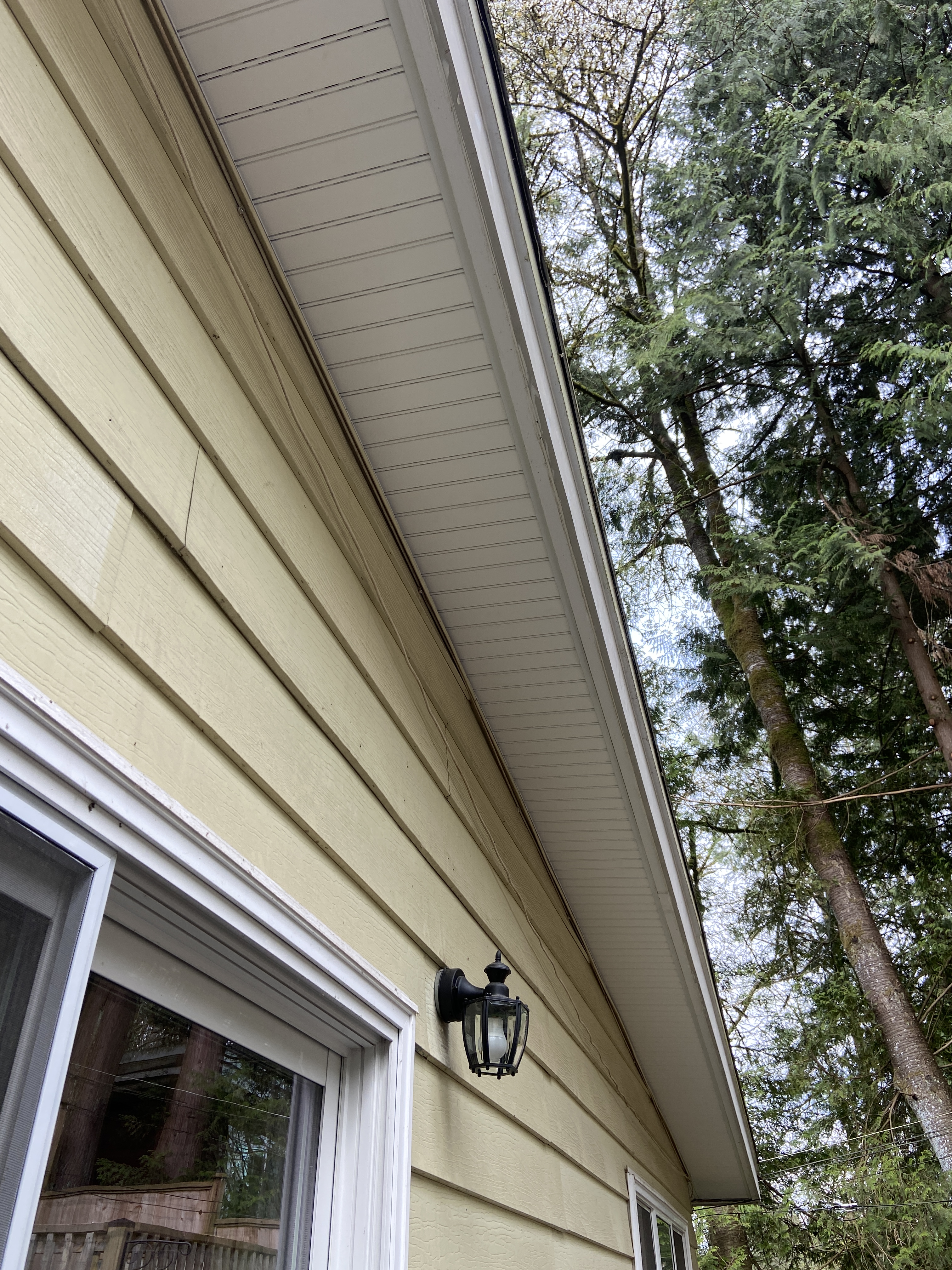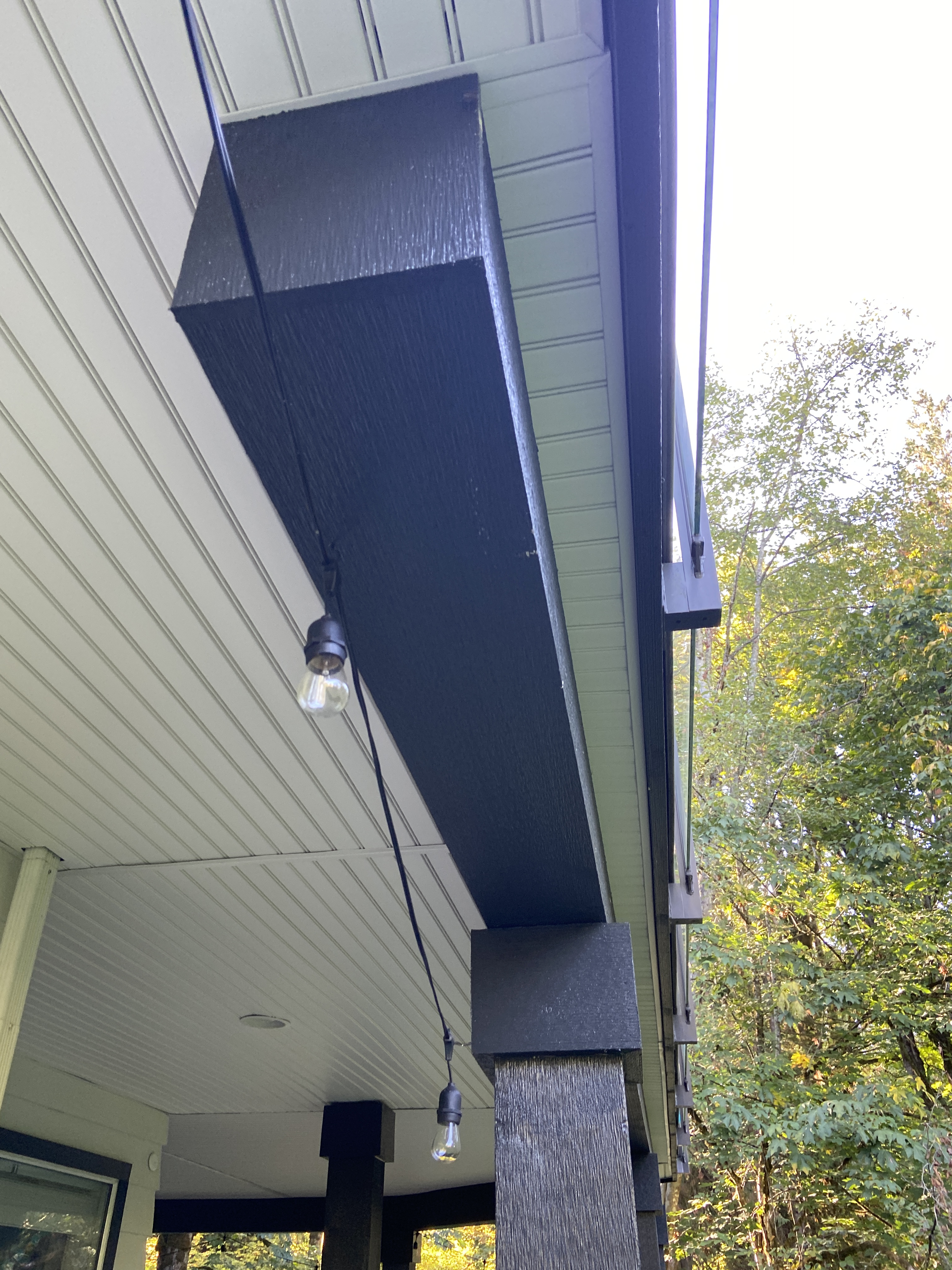 Professional Siding replaced old rotten high maintenance cedar soffits with new modern low maintenance vented beaded vinyl soffits. Mitered corners.