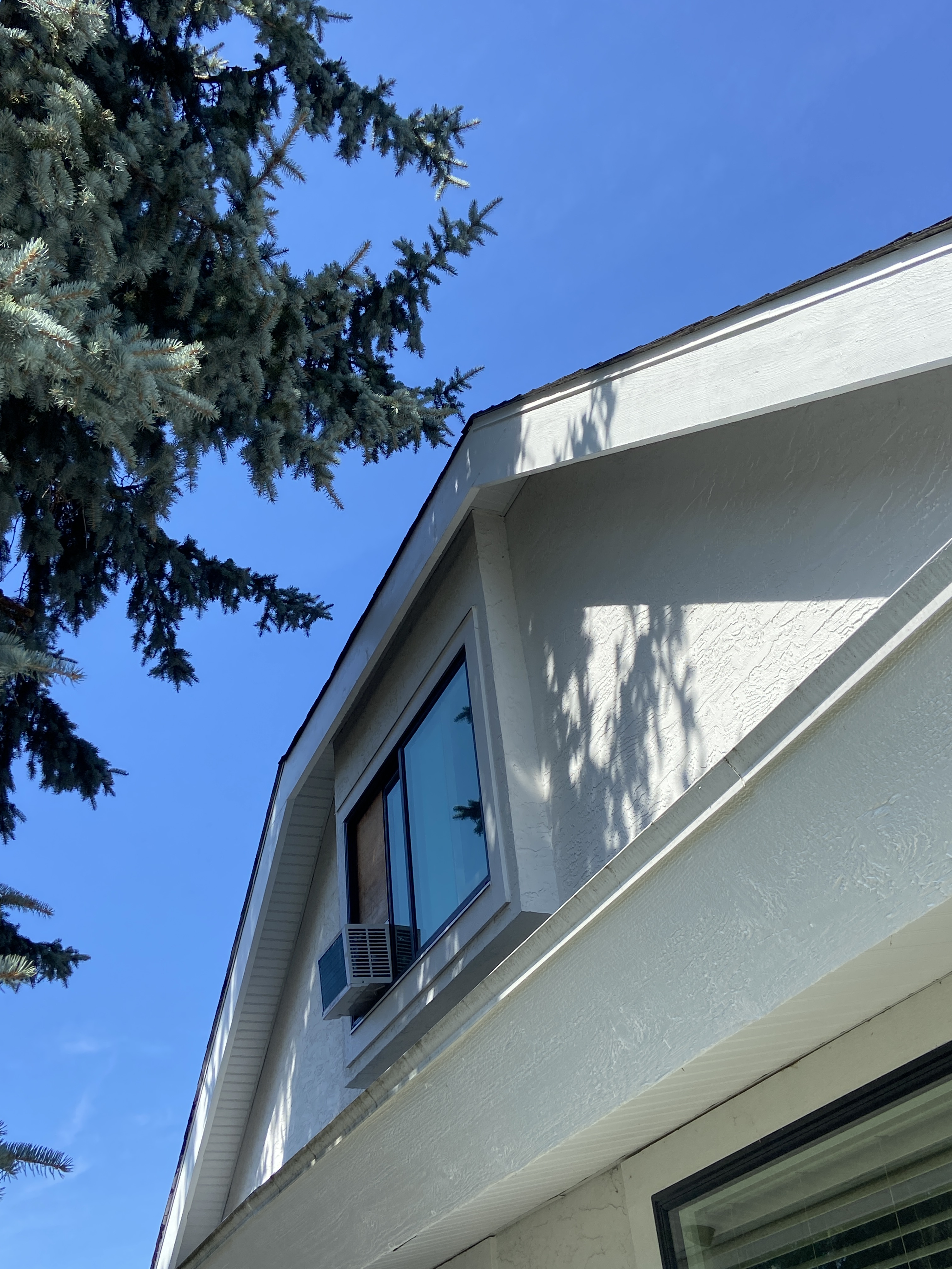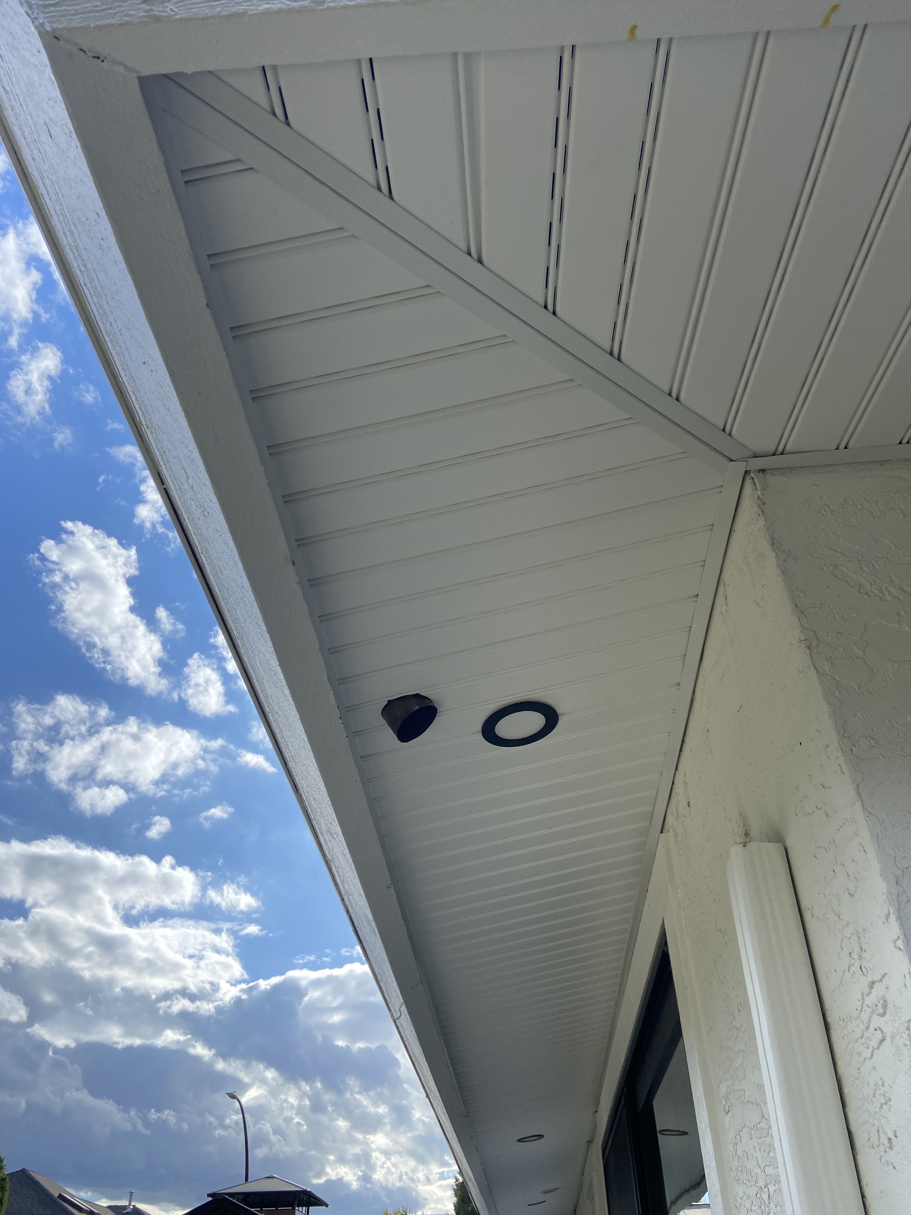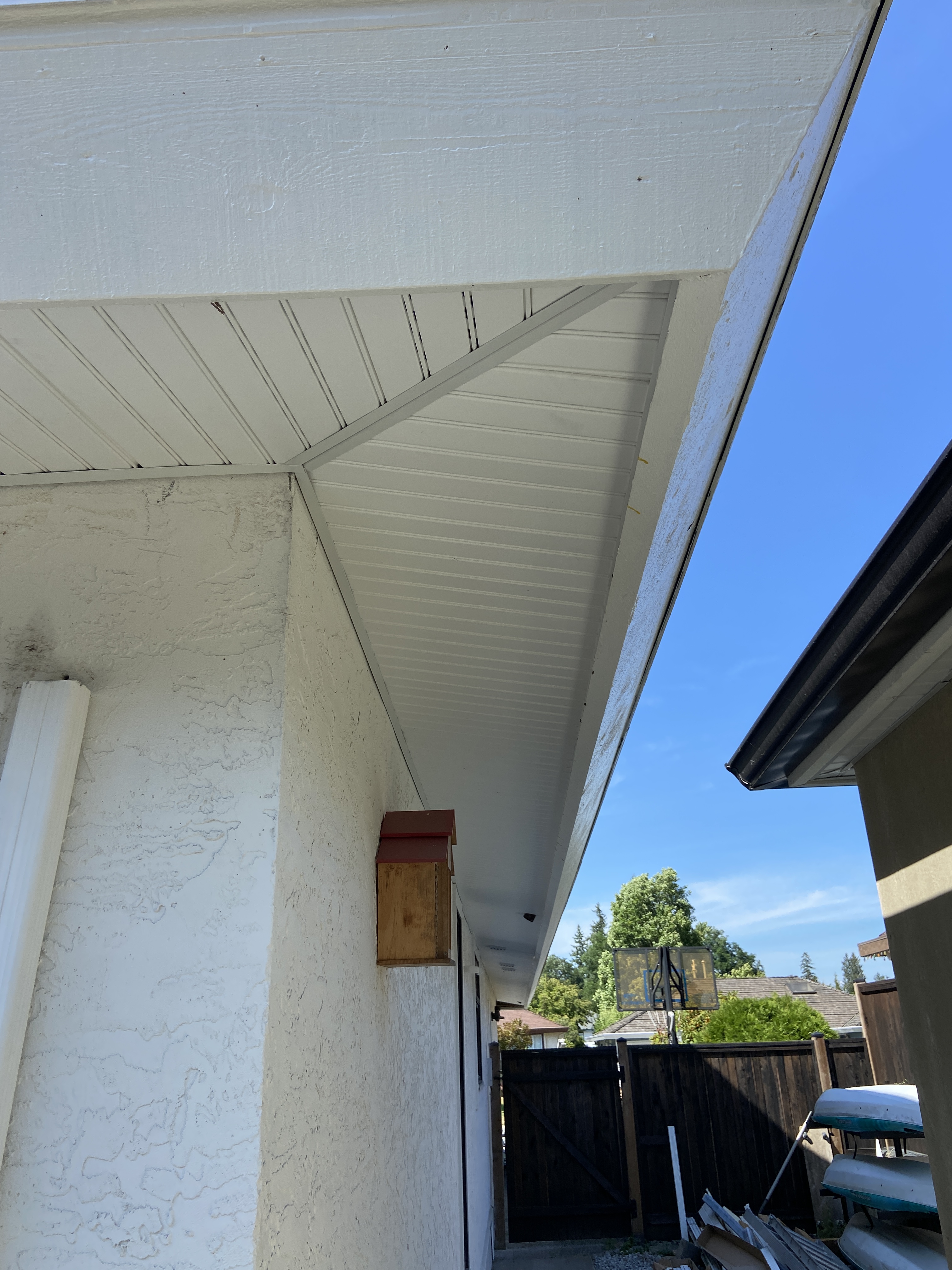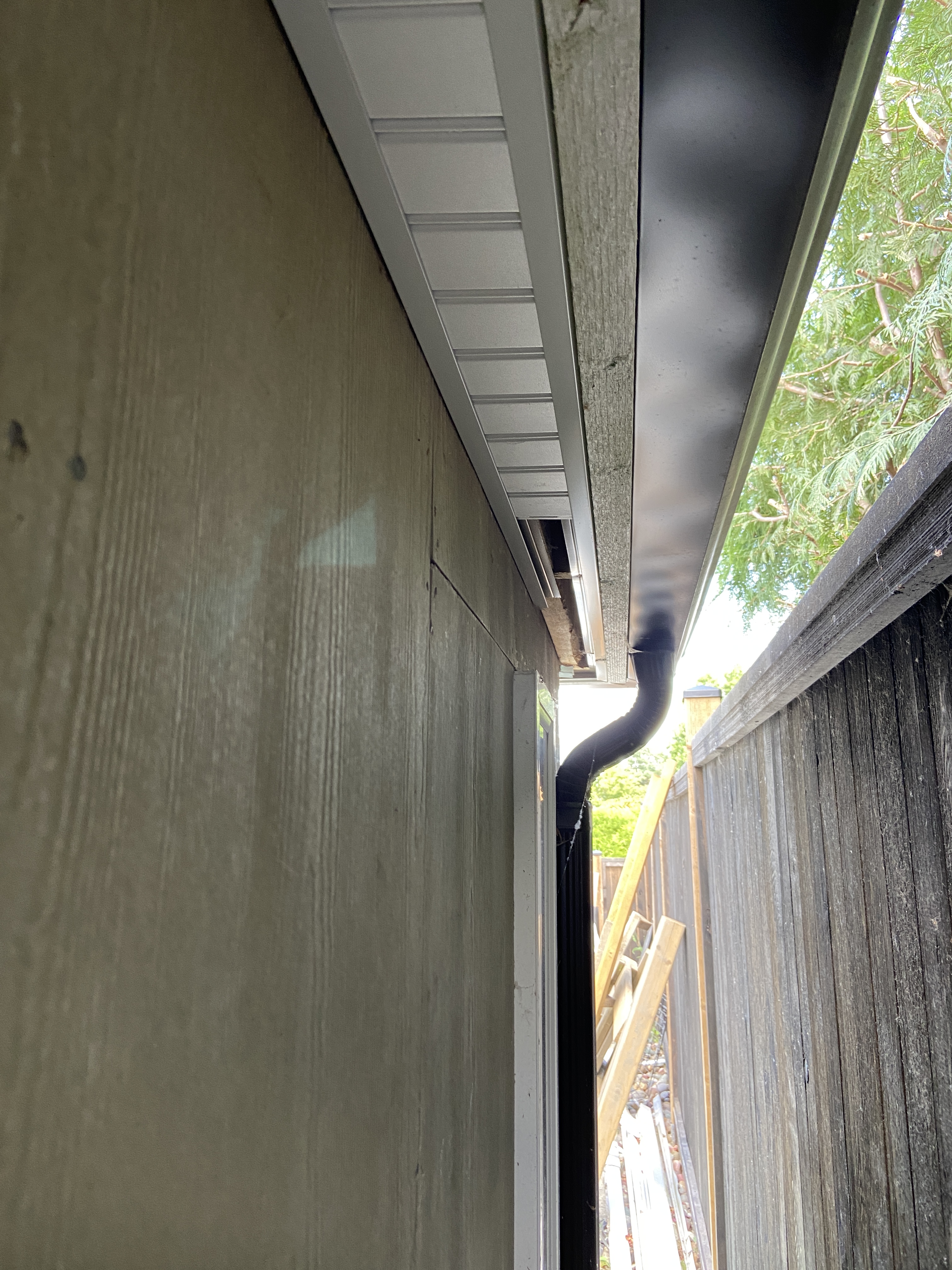 Fascia boards installation. Metal caps and fascia boards painting. Replaced old aluminum soffits with new vented beaded vinyl soffits. Aluminum downspouts replacement.