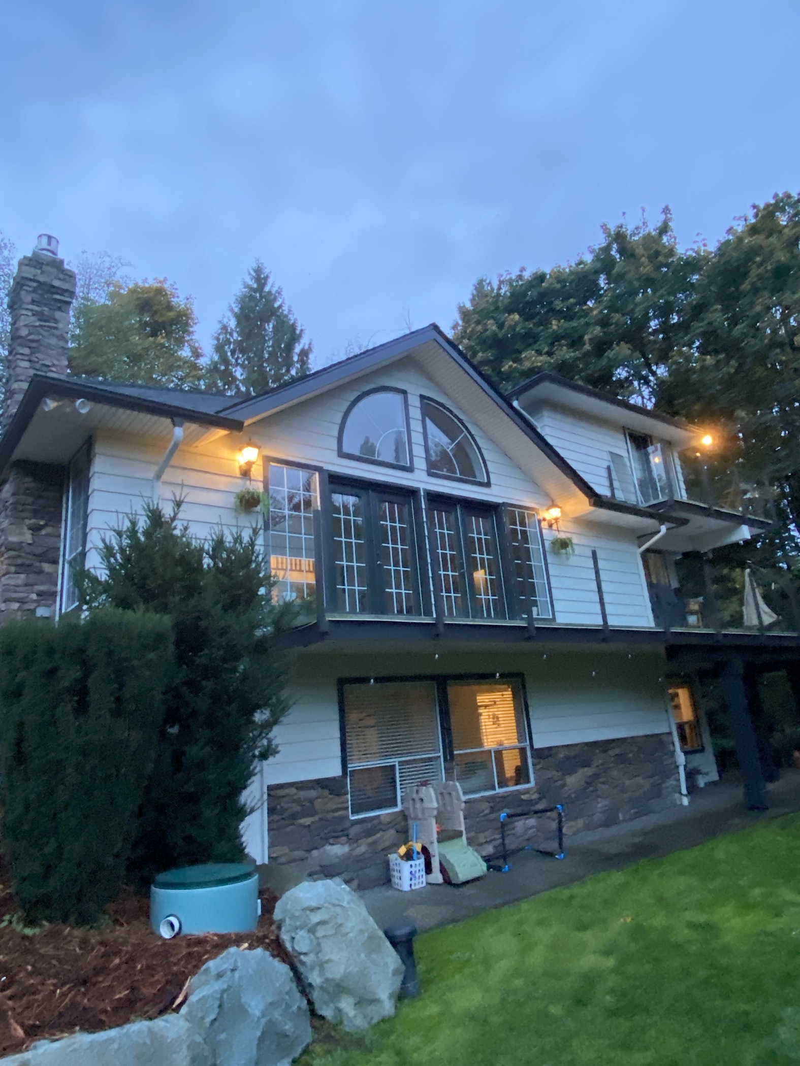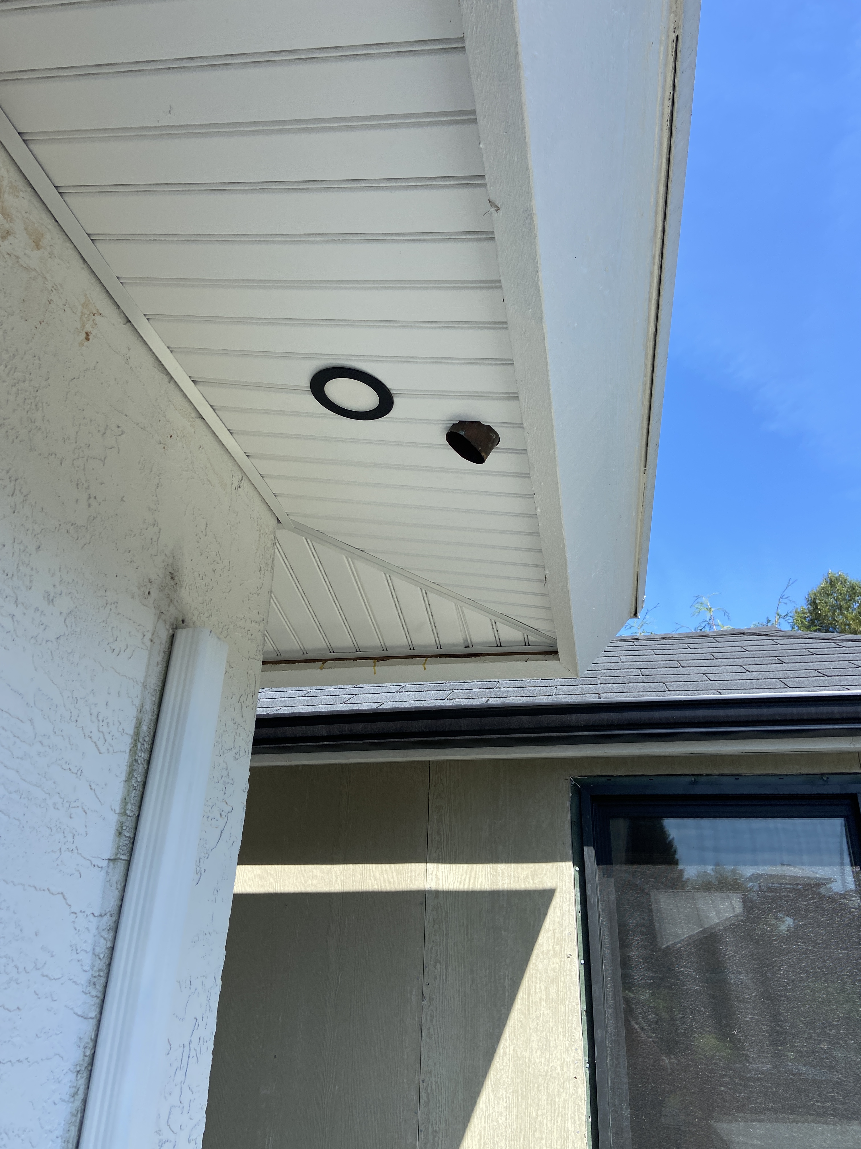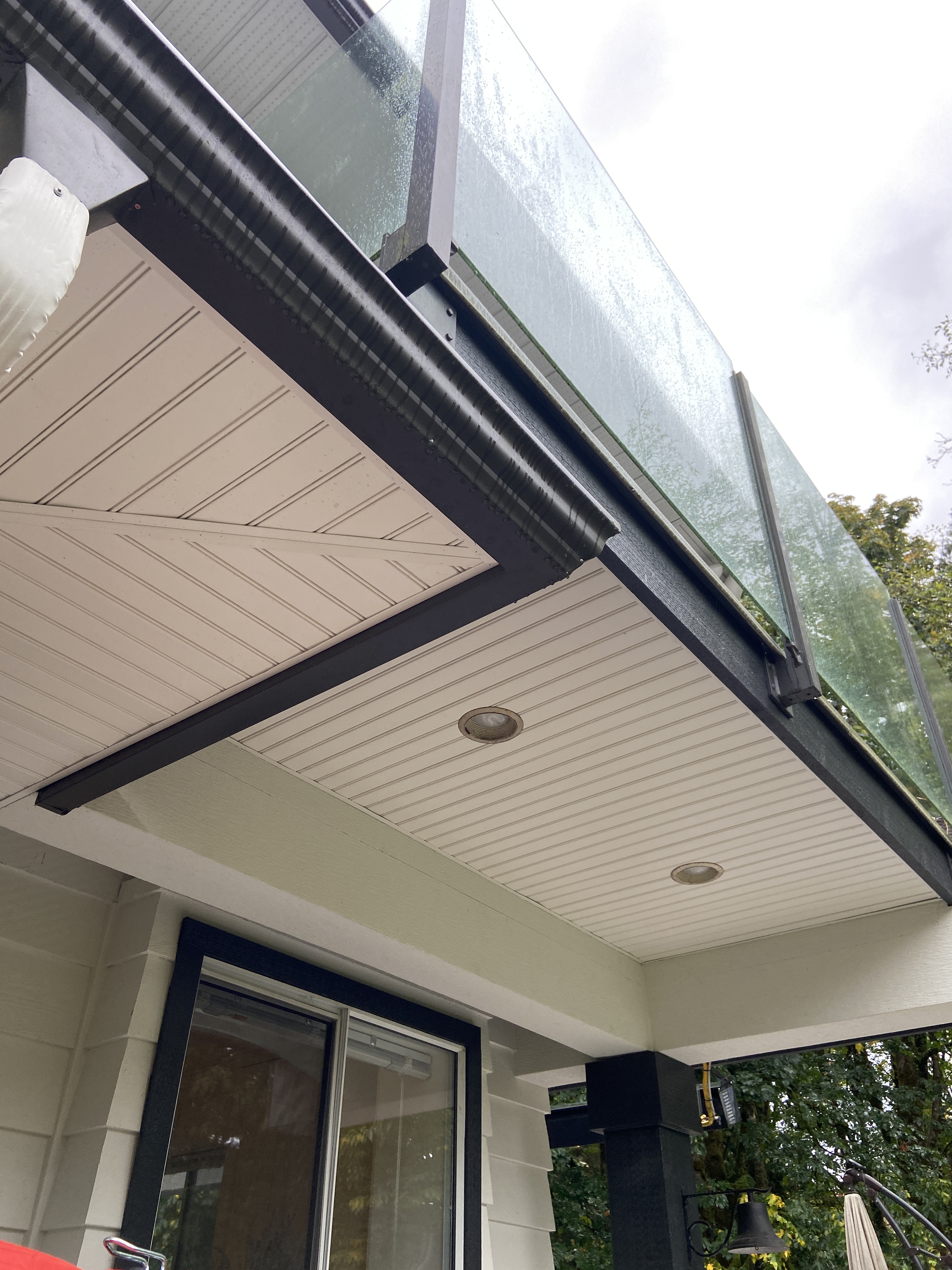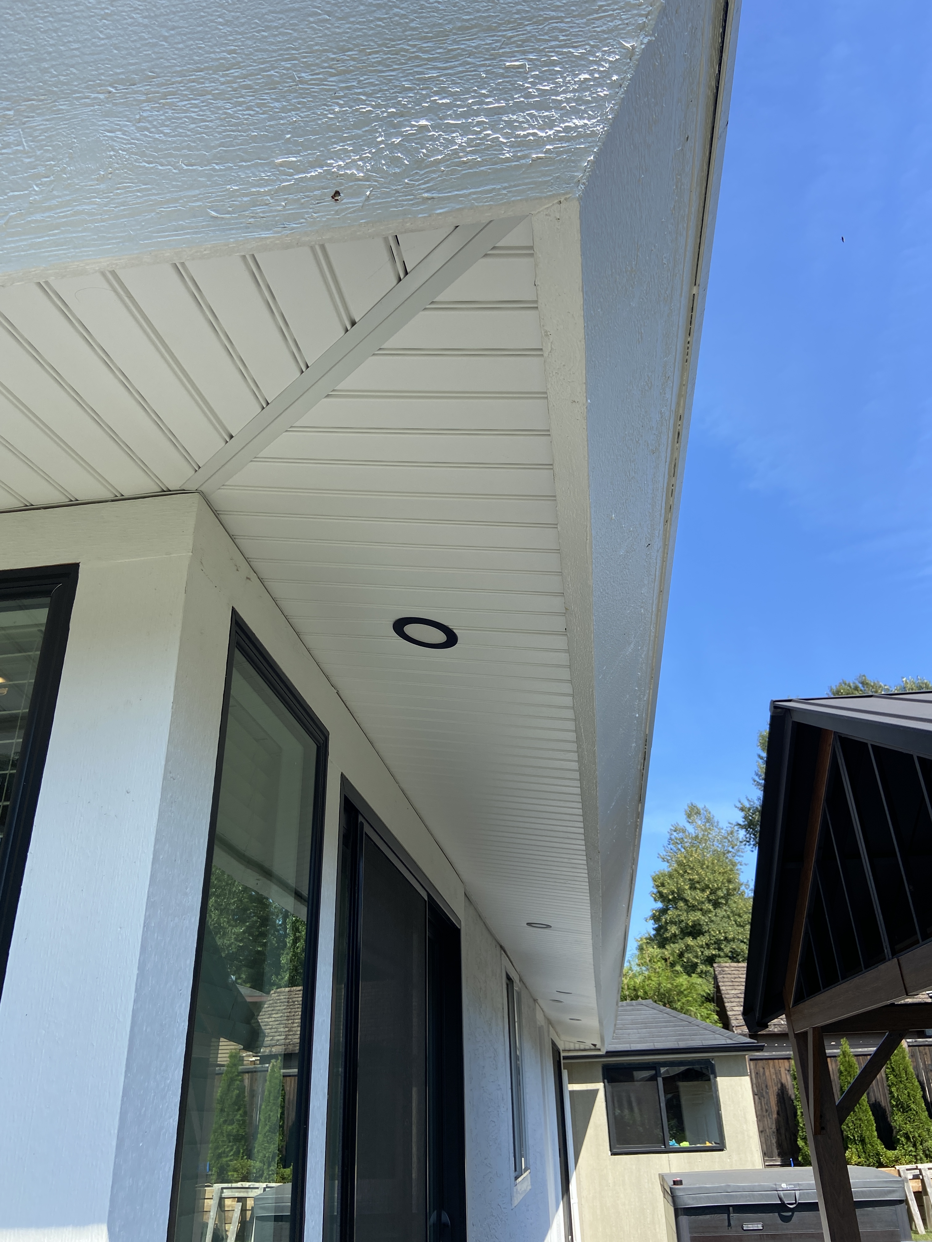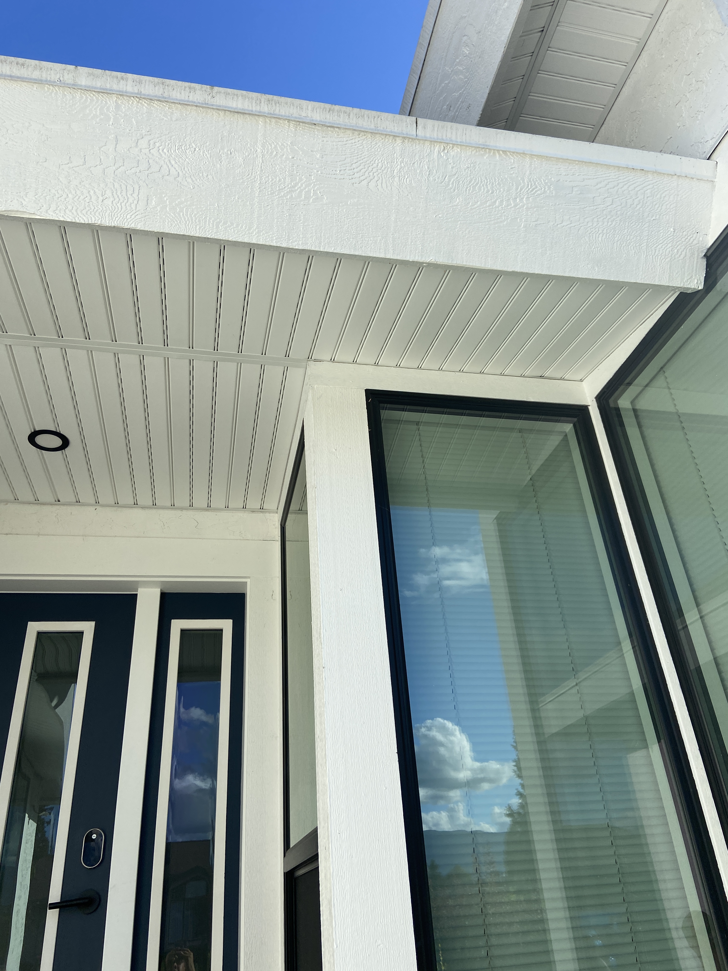Another quality project completed by Professional Siding. Replaced old perforated aluminum soffits with new vented beaded vertical vinyl soffits in linen colour for the entire house. Cedar rendition aluminum soffits in charwood colour for above entrance section. All spotlights were installed at the exact same location.