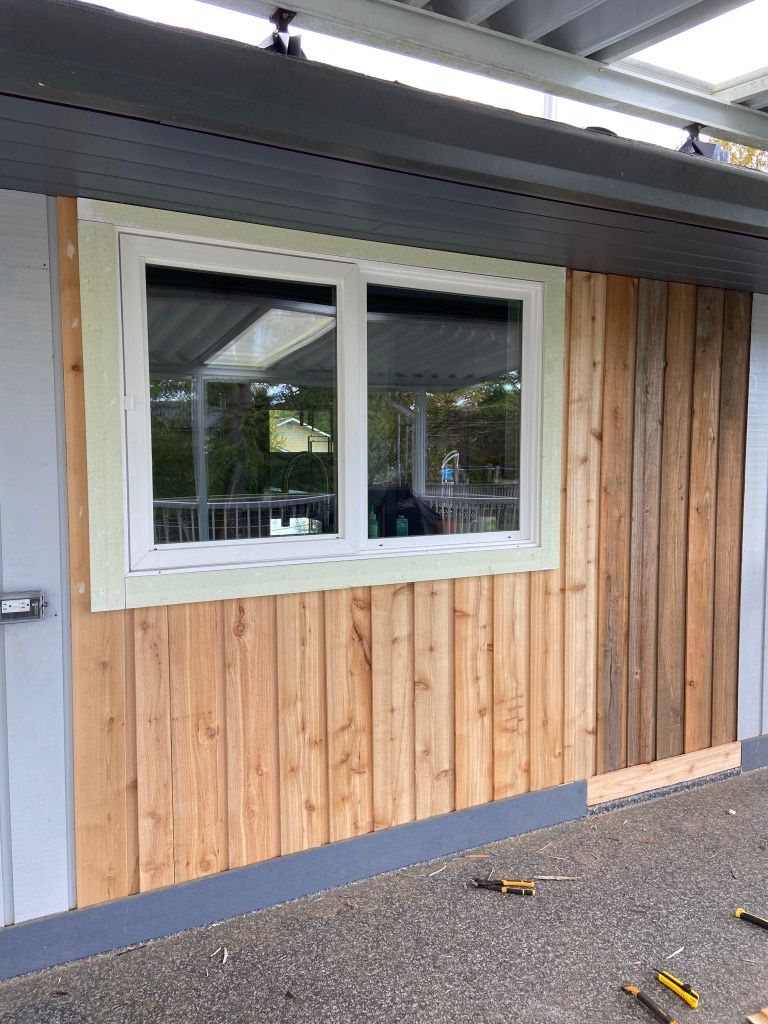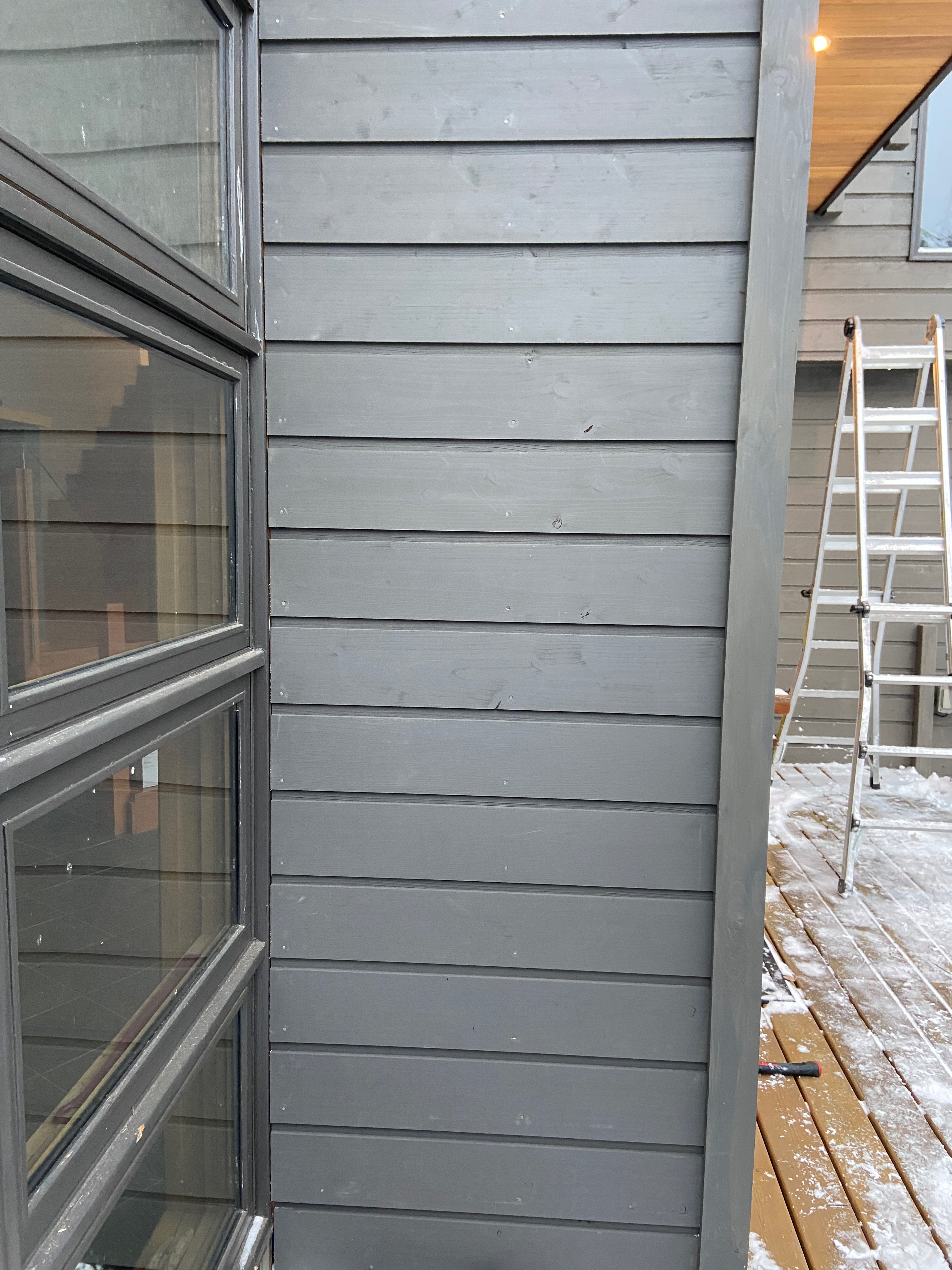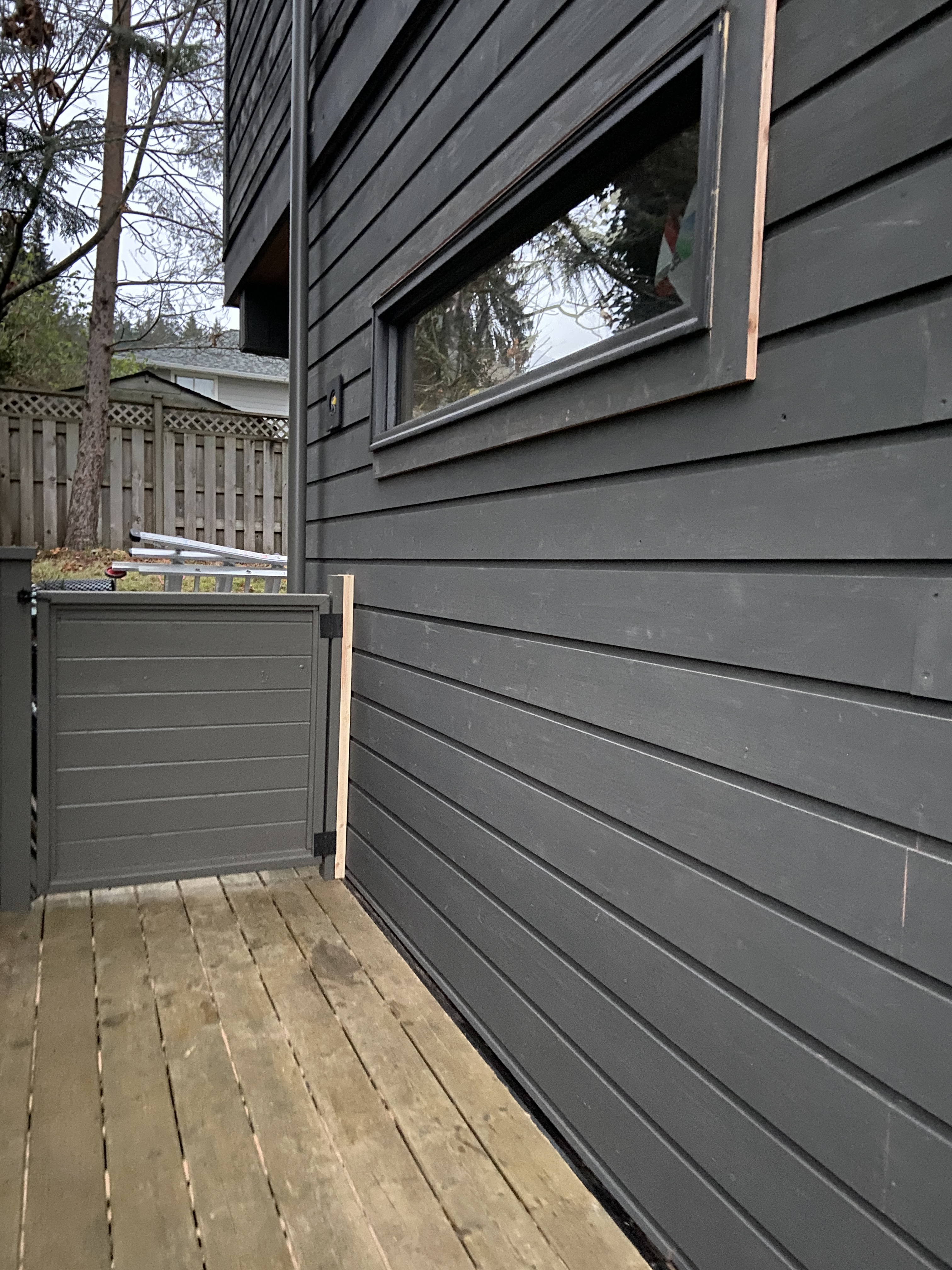 Cedar channel horizontal 7” reveal siding. Cedar 3.5” trims and corners. Pre-painted indoor prior to installation. Black mounting blocks. Custom flashings between bottom planks and deck surface. Old vertical rotten siding demolition, strappings removal, sheathing inspection, Tyvek home wrap installation.