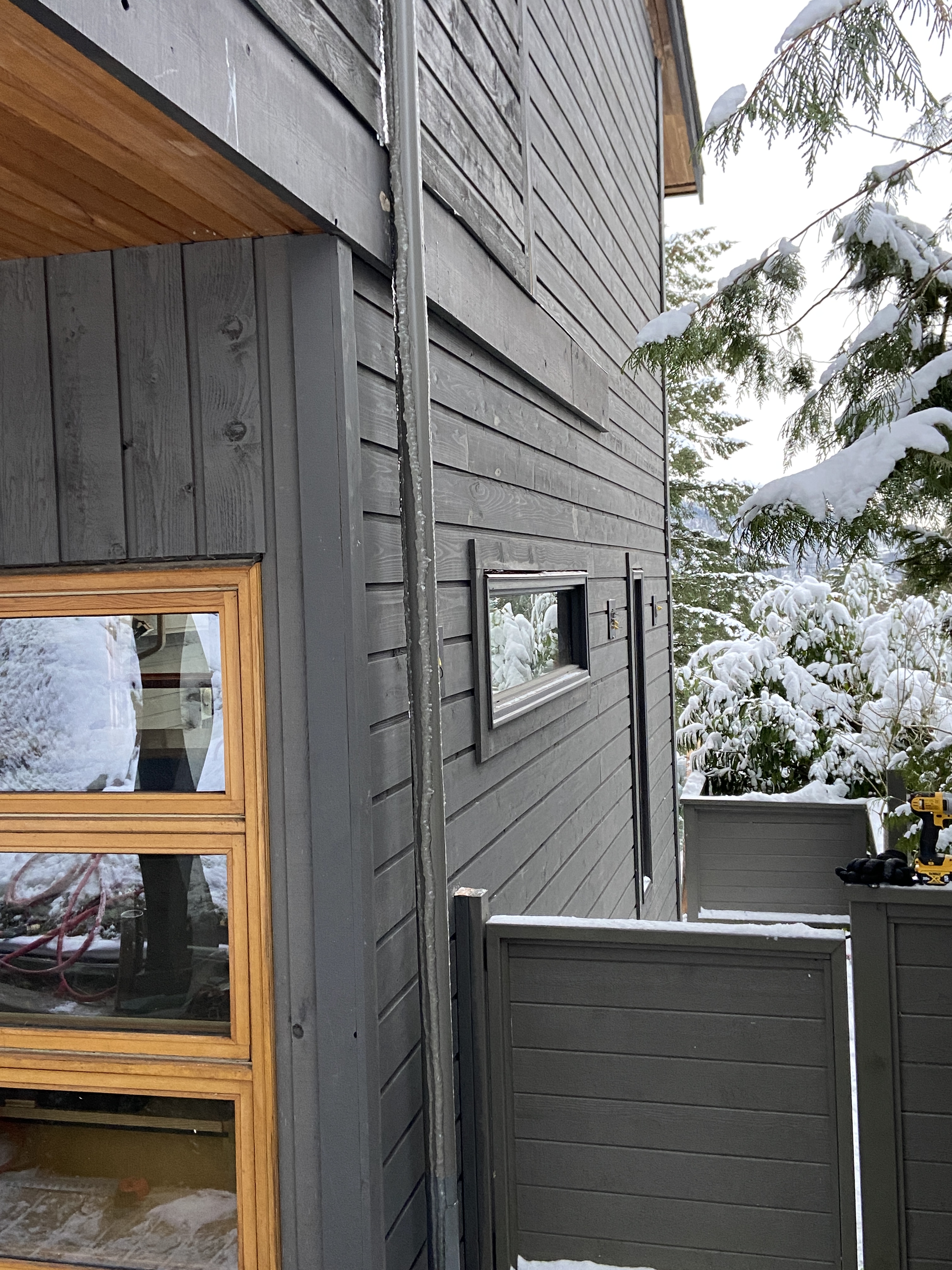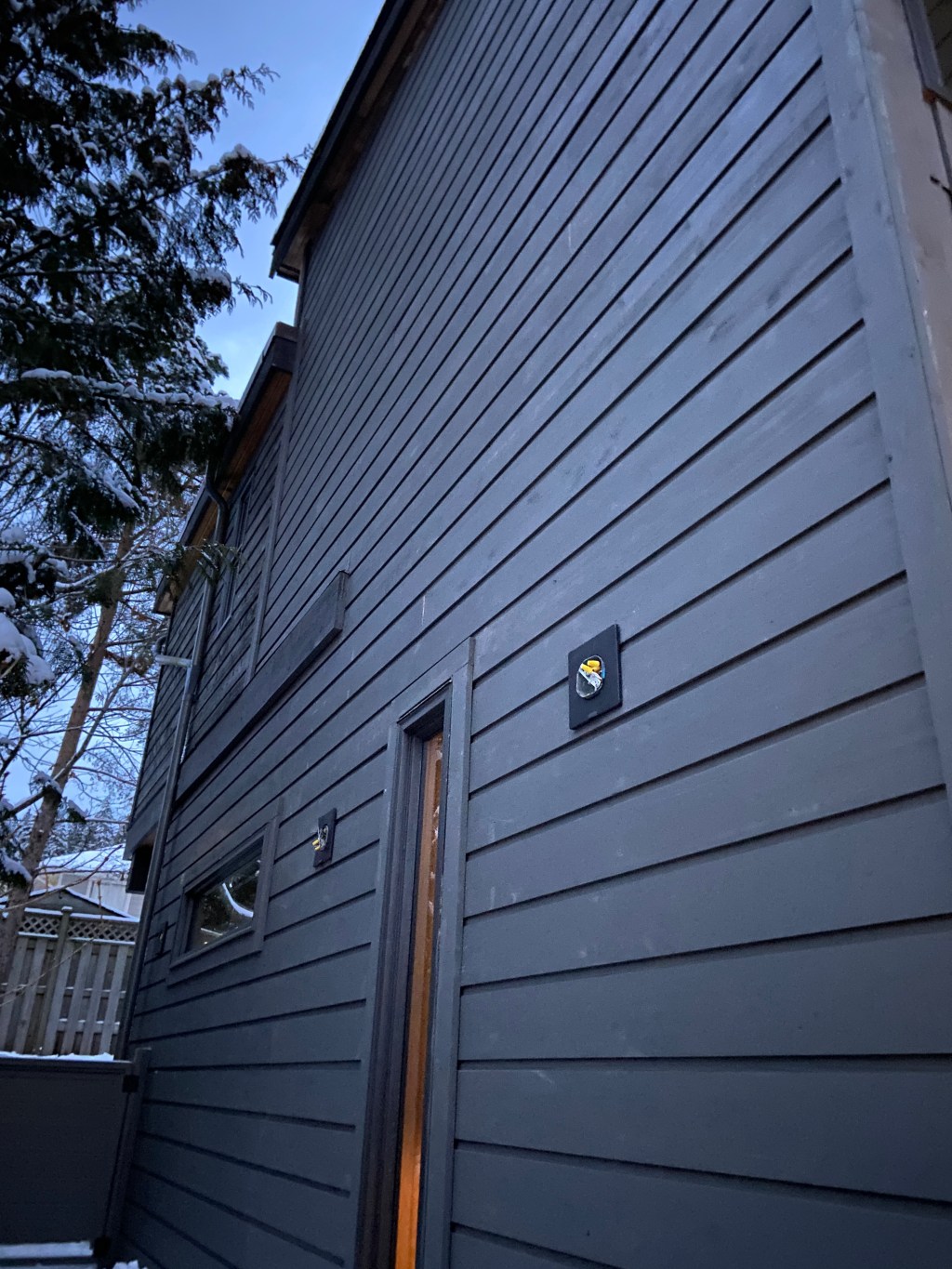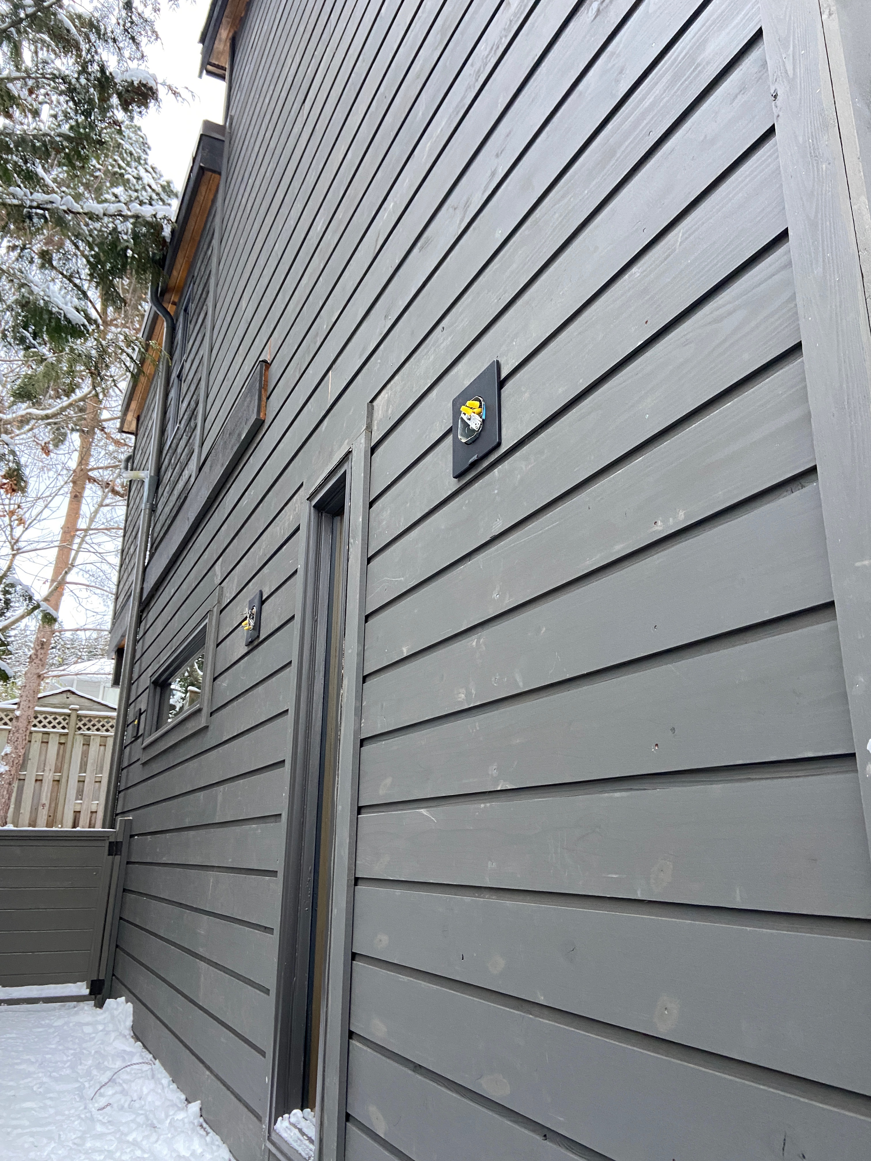 Cedar channel horizontal 7” reveal siding. Cedar 3.5” trims and corners. Pre-painted indoor prior to installation. Black mounting blocks. Custom flashings between bottom planks and deck surface. Old vertical rotten siding demolition, strappings removal, sheathing inspection, Tyvek home wrap installation.